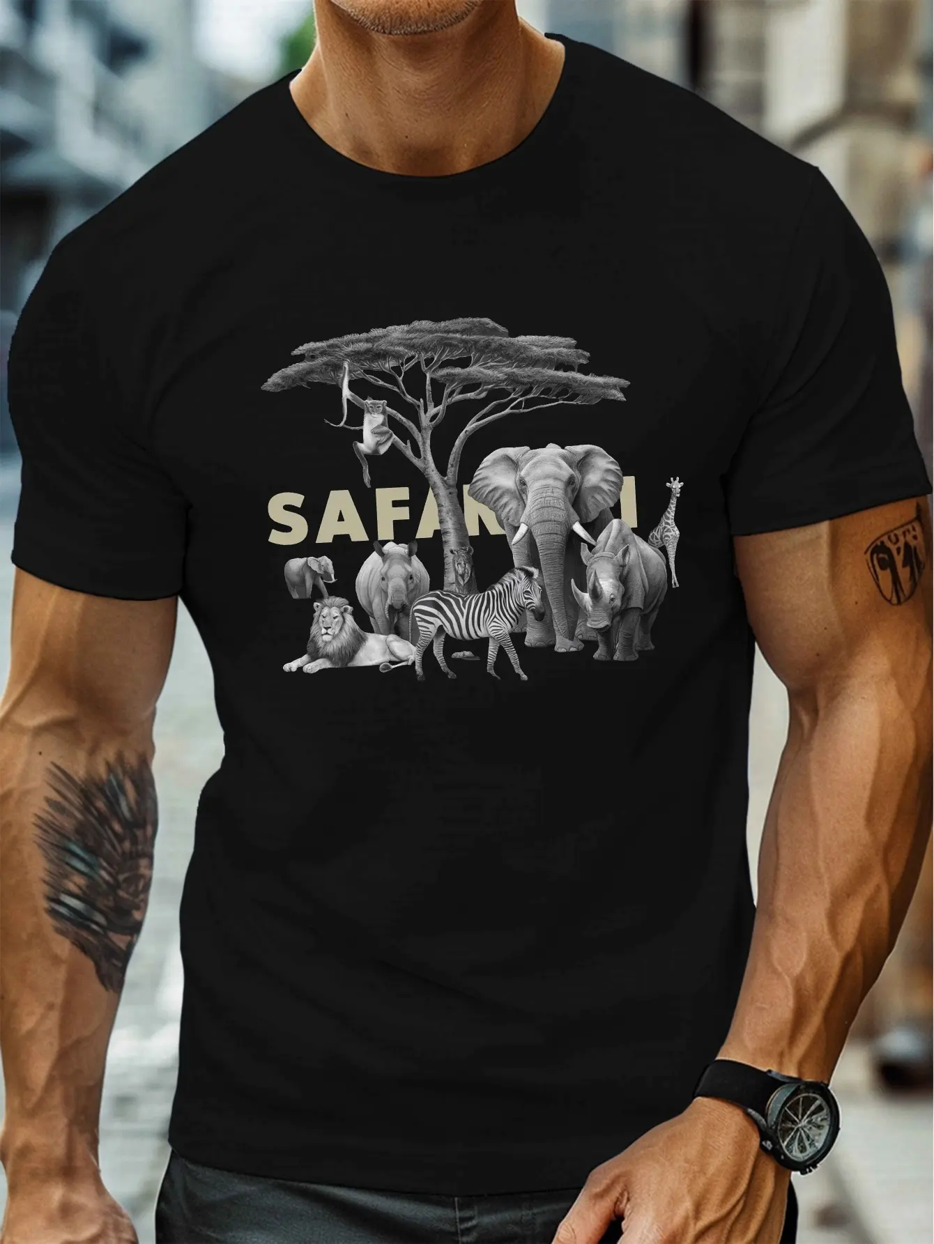 Men'S Wild Animal Print Round Neck T-Shirt - Lightweight Short-Sleeve Top Featuring Designs of Elephants, Zebras, And Giraffes, Perfect for Casual Outdoor Adventures, Vibrant And Stylish Animal-Themed Men'S Short-Sleeve T-Shirt