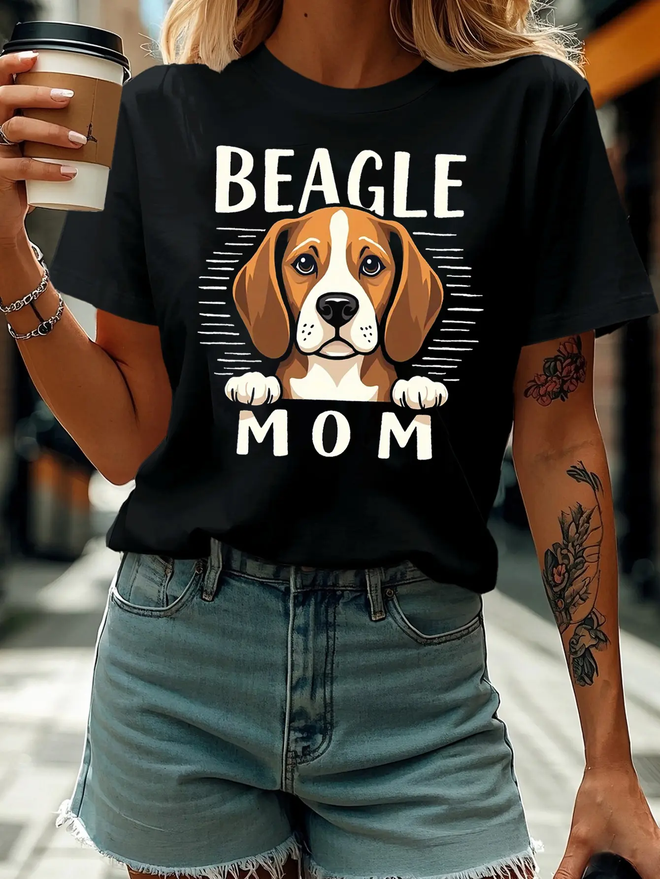 Beagle Mom's Gentle Gaze Letter Print T-shirt, Short Sleeve Crew Neck Casual Top for Summer & Spring, Women's Clothing