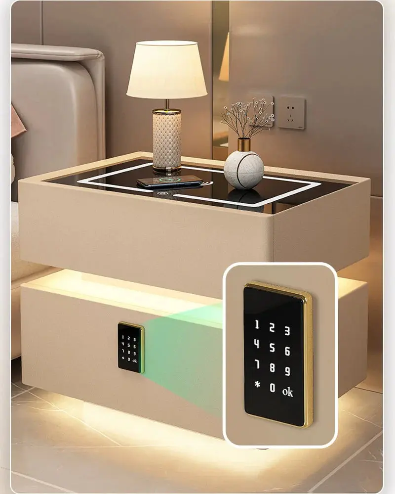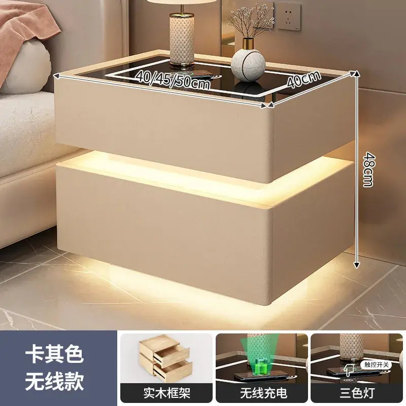 ITEM: bedside table MATERIAL: solid wood+microfiber leather+sintered stone/tempering glass SIZE: 40/45/50*40*48cm (for other size, please contact us first) standard (white sintered stone top): sensor light A: sensor light+Quartz slab B: sensor light+wireless charging+Three-color lamp C: sensor light+wireless charging+Bluetooth speaker+lock+Three-color lamp