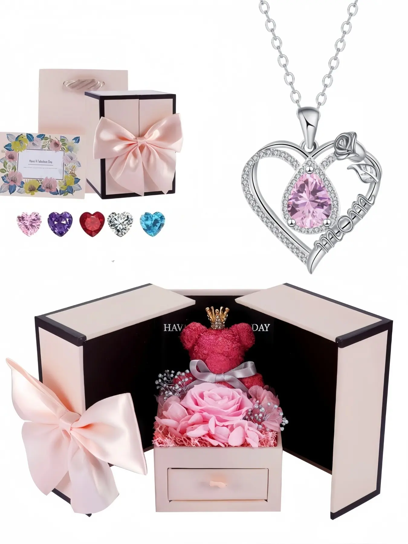 Diamond Drop Rose Heart Mom Luxury premium heart-shaped MOM teardrop gem necklace.Paired with a preserved rose & teddy bear jewelry gift box.Perfect mysterious gift for festivals, birthdays, Valentine's Day, Mother's Day and Christmas.