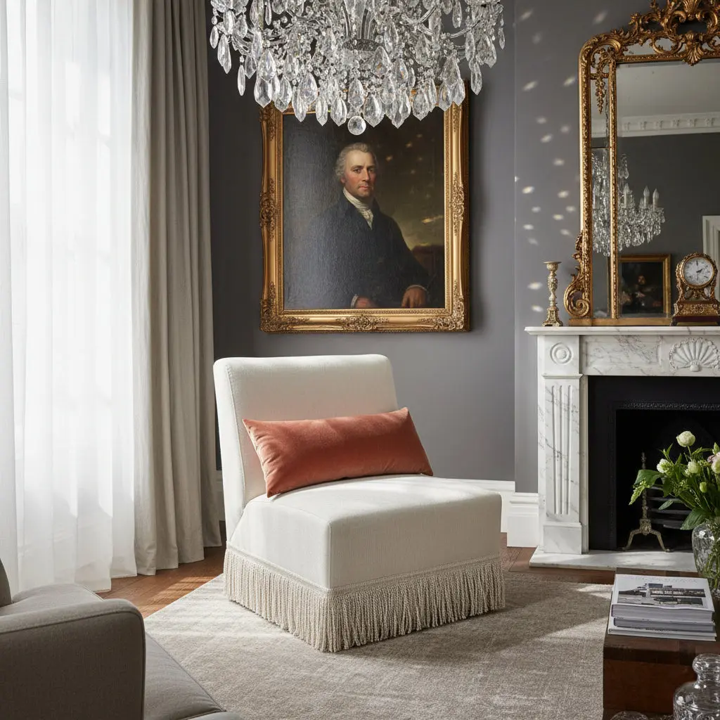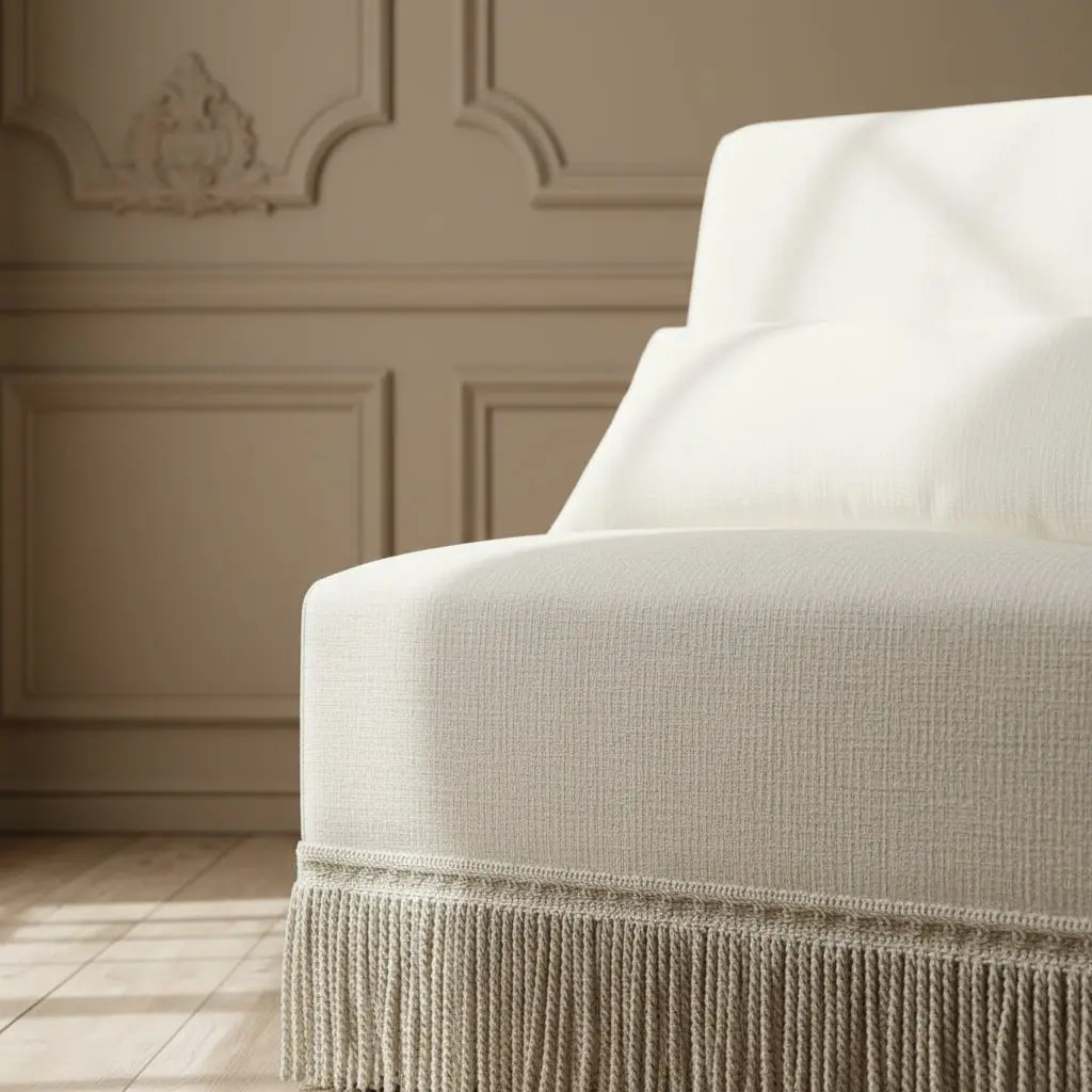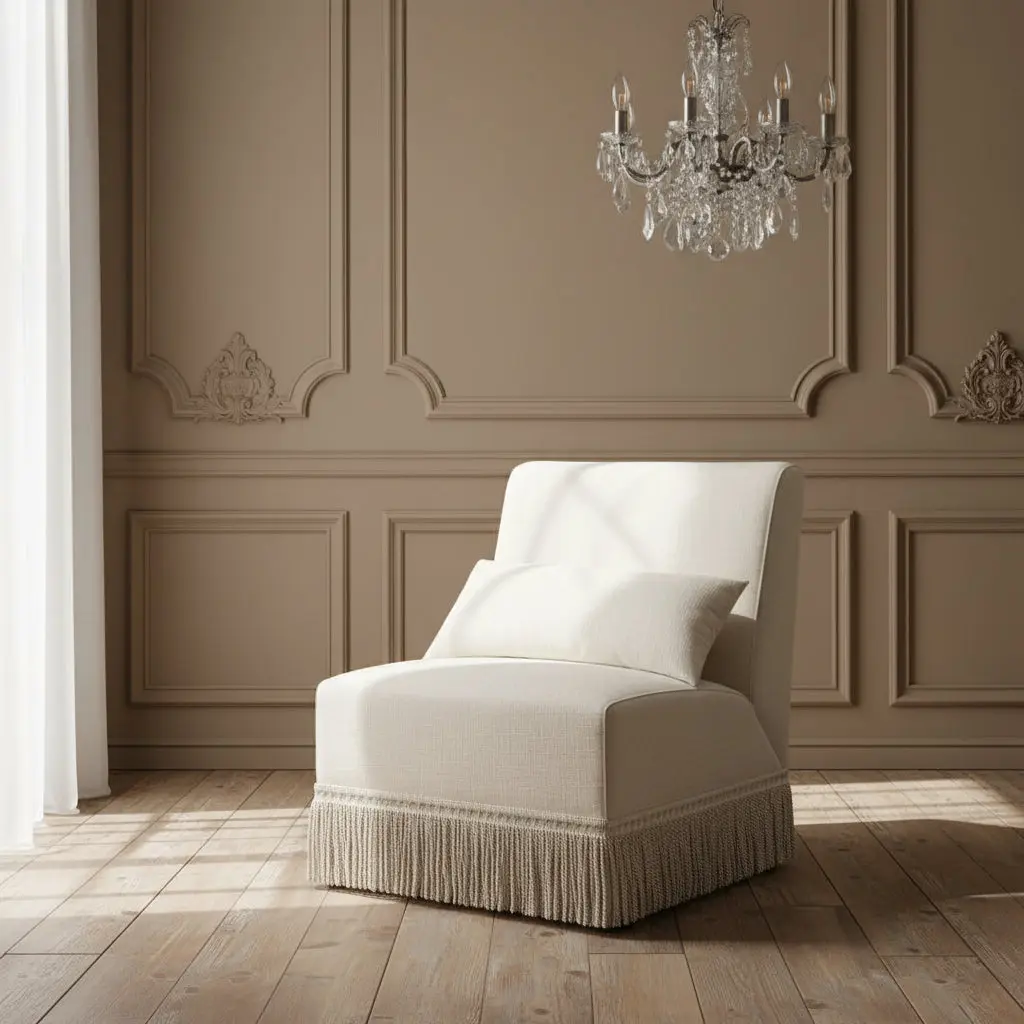 Introducing the Giselle Fringe Chair – a masterpiece of timeless elegance and artisanal craftsmanship. This sophisticated armless chair is upholstered in fine white linen, offering a luxurious texture and a serene, minimalist aesthetic that blends seamlessly with any décor.