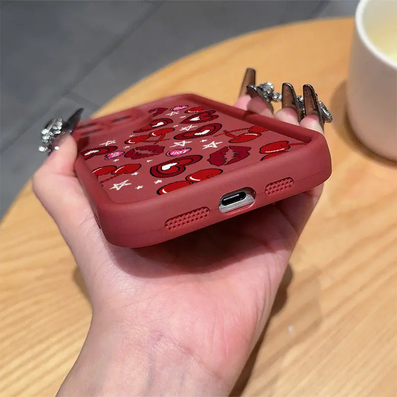 A high-end wine red cherry, lip print, and heart-shaped TPU shockproof full coverage case, specifically designed for iPhone 17 E Air Pro ProMax iPhone16 15 14 Plus 13 12 Mini 11 X XS XR, Phone Case, Full Coverage,Seamless Edge, Fashion Phone Users