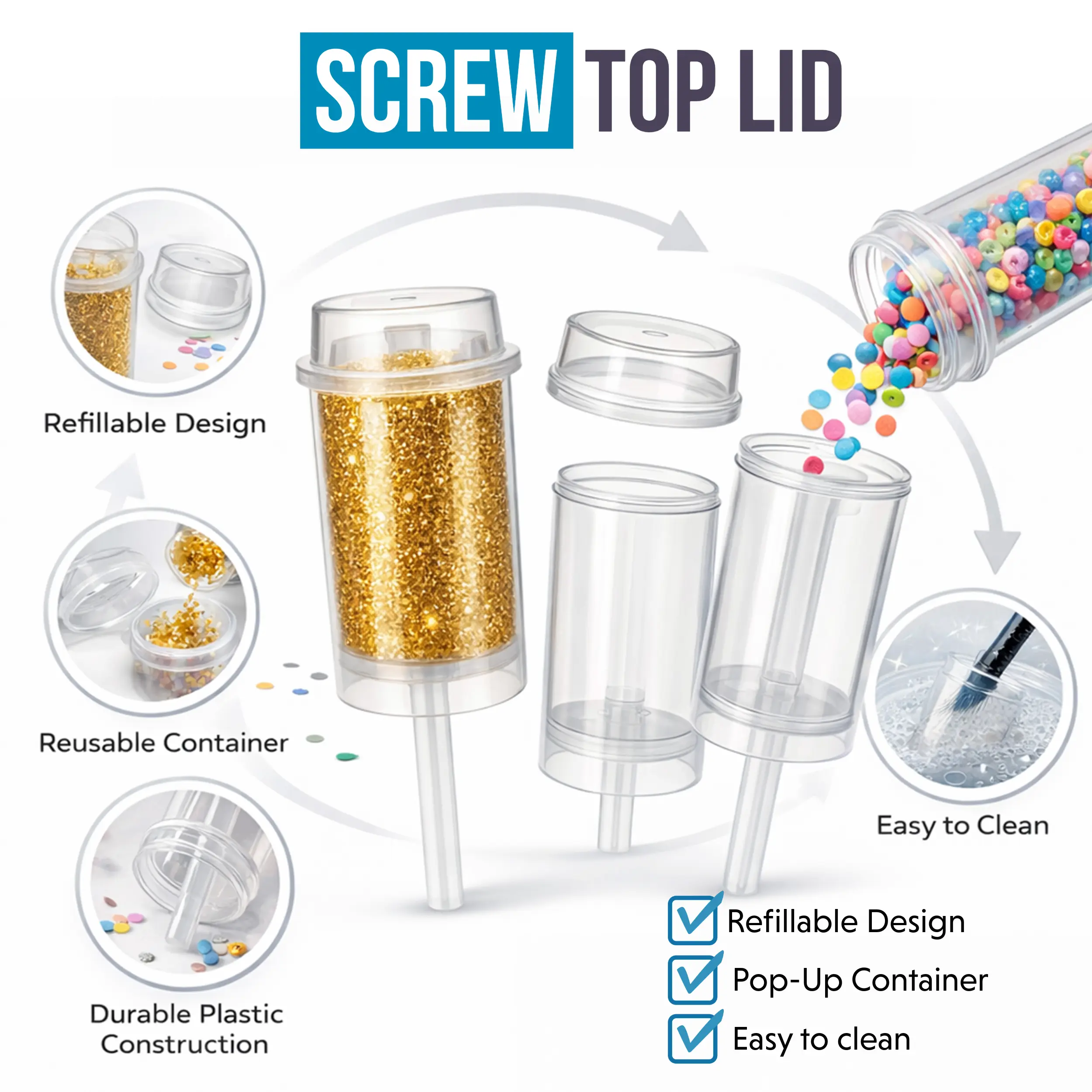 Upgrade your organization with this 10 pack of push-up style plastic storage containers featuring assorted decorative graphic designs. These compact containers are designed for convenient access, portability, and eye-catching presentation, making them ideal for organizing small items at home, in the office, or on the go.Each container is made from durable lightweight plastic and features a smooth push-up mechanism that allows contents to slide upward for easy access. The secure cap helps keep stored items protected while maintaining a clean and organized appearance.This pack includes 10 reusable containers with assorted decorative wrap labels, giving you a variety of bold graphic styles while maintaining the same convenient push-up container format.These containers are great for organizing small accessories, collectibles, craft supplies, desk items, and other everyday essentials while adding a unique decorative look.Key Features• 10 push-up storage containers per pack• Assorted decorative graphic designs• Smooth push-up mechanism for easy access• Secure cap helps protect stored items• Durable lightweight plastic construction• Reusable container design• Compact and portable storage solutionProduct DetailsPack Size: 10 containersMaterial: Durable plasticDesign: Push-up style container with capGraphics: Assorted decorative wrap labelsCondition: Empty containers – no contents includedReusable: YesLightweight & portablePackage Includes10 Push-Up Plastic Storage Containers (Assorted Graphic Designs)Container graphics and styles vary within the pack.DisclaimerUpgrade your storage with these decorative organizers designed for packaging and organizing small items.For organization and decorative storage use only.Not intended for food or consumable products.Containers are sold empty. Graphics are decorative.