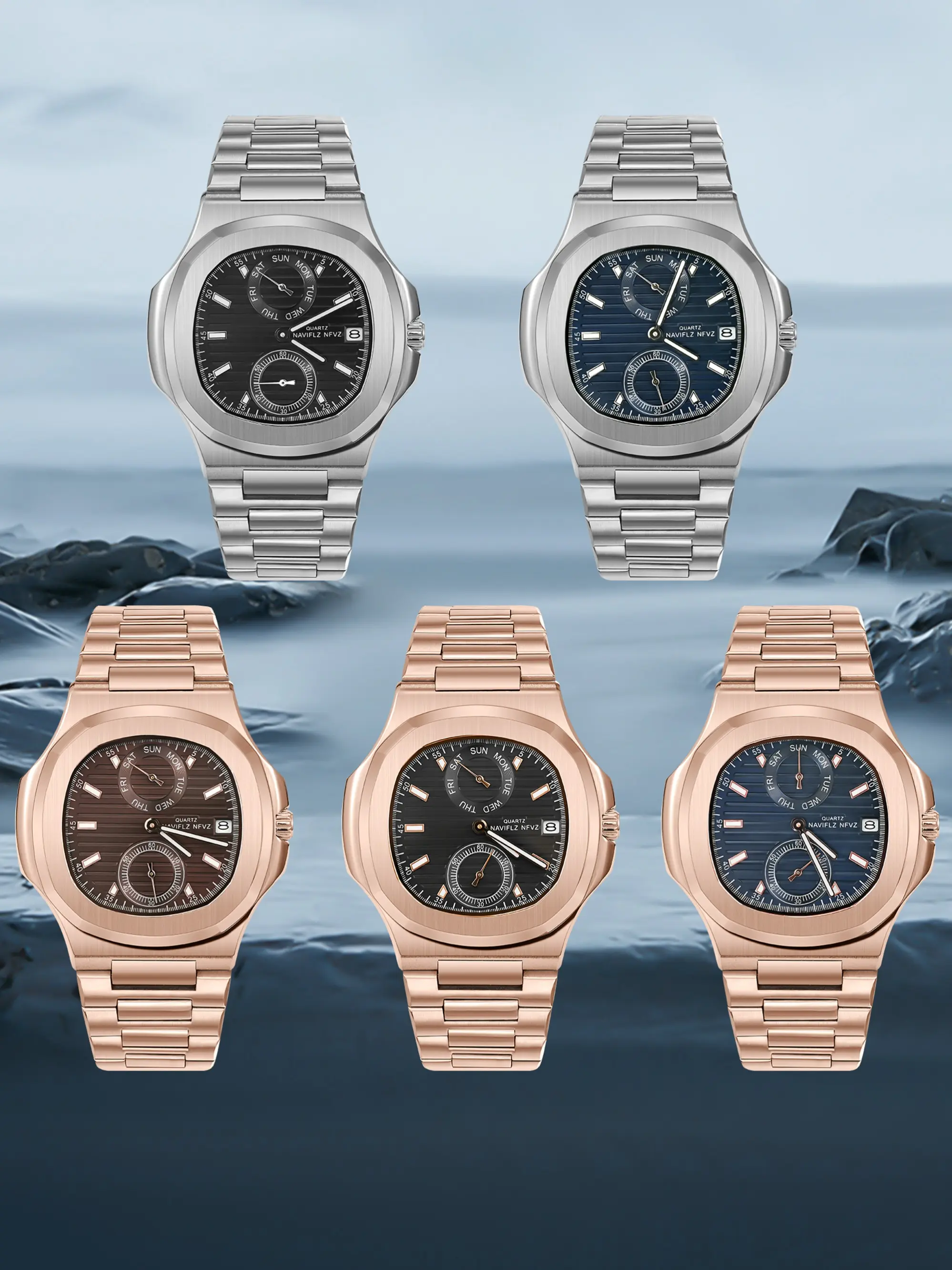 New Arrivals NAVIFLZ NFVZ Brand Men Quartz Watches 40MM Rose Gold Stainless Steel Male Functional 5990 Sports Wristwatch 5Bar