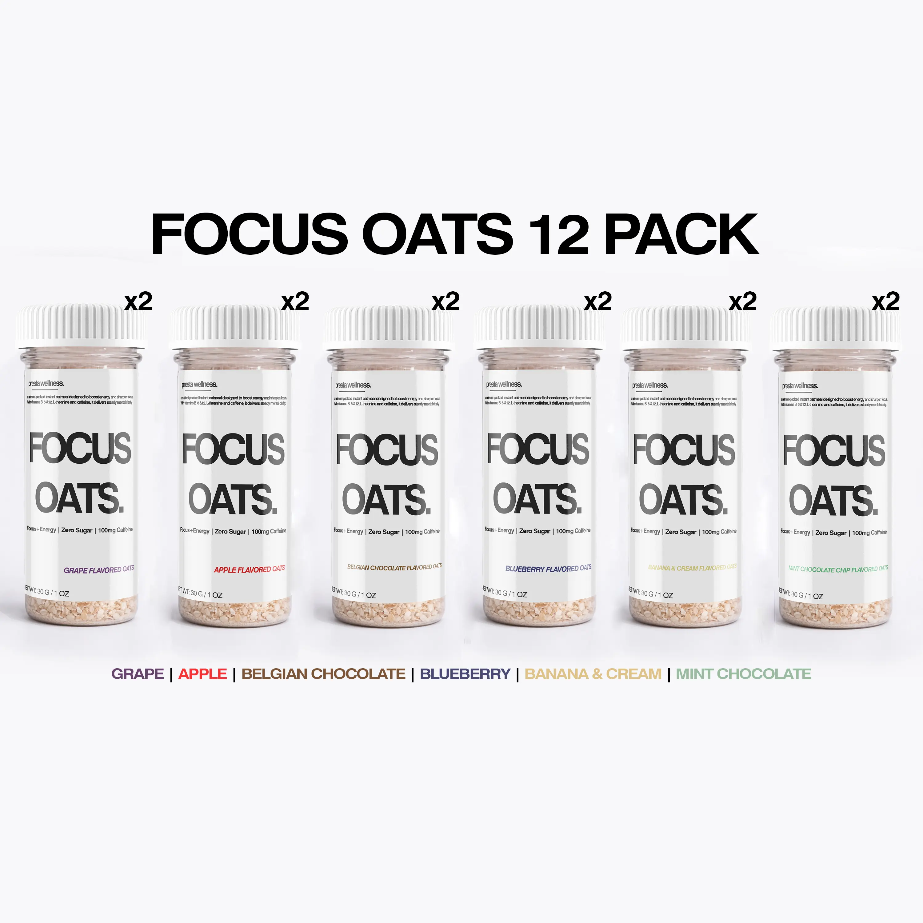 The Focus Oats 12 Pack is built for people who move with purpose — creators, students, athletes, and anyone who refuses to run on empty. This variety bundle delivers clean, sustained energy with zero sugar and a precise boost of caffeine to keep you locked in and performing at your peak.