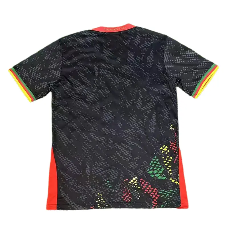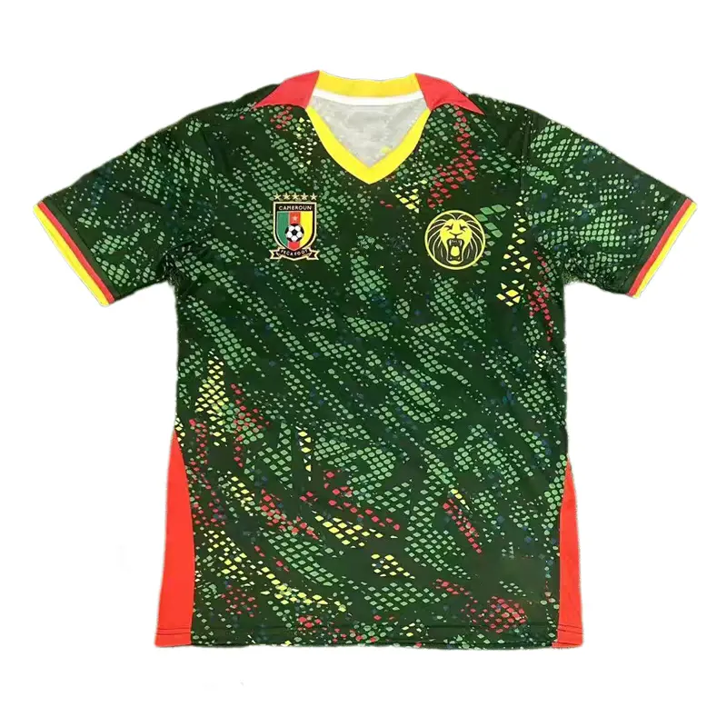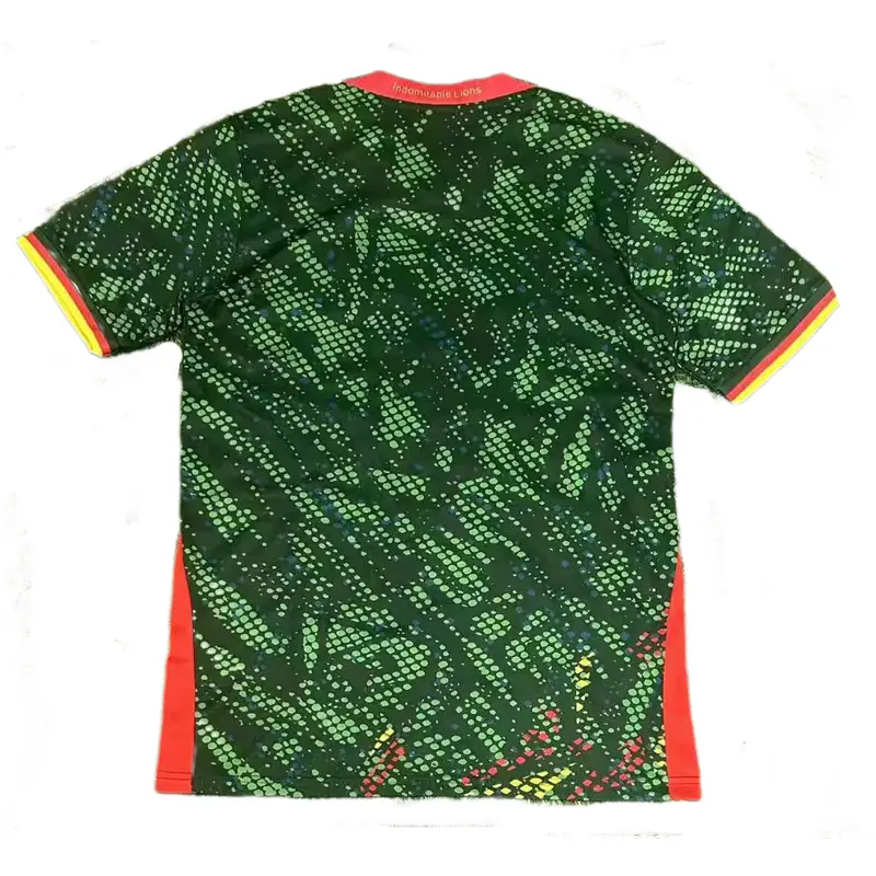Iconic green with a fierce lion graphic, red/yellow tricolor accents, breathable fabric, embodying the Indomitable Lions' vitality and African pride.