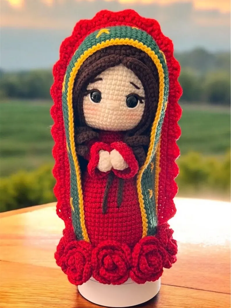 This handmade crochet Virgin Mary doll is lovingly crafted with soft yarn and exquisite details. Inspired by Our Lady, this amigurumi statue features a serene prayer pose, a delicate crochet rosary, and elegant golden tones that symbolize light, faith, and devotion.