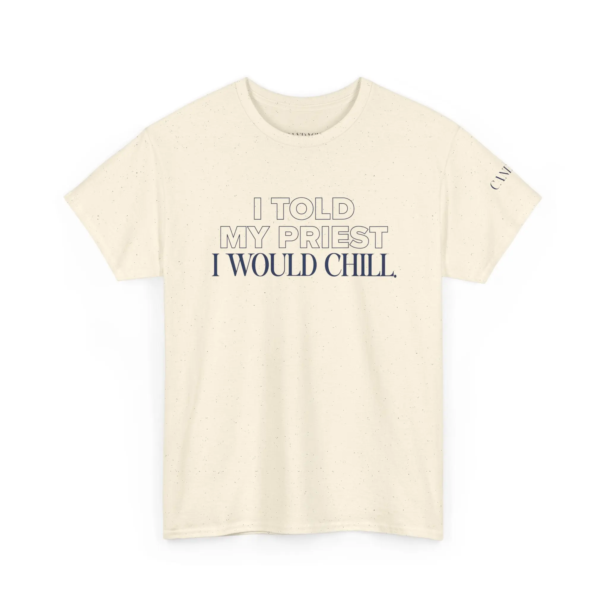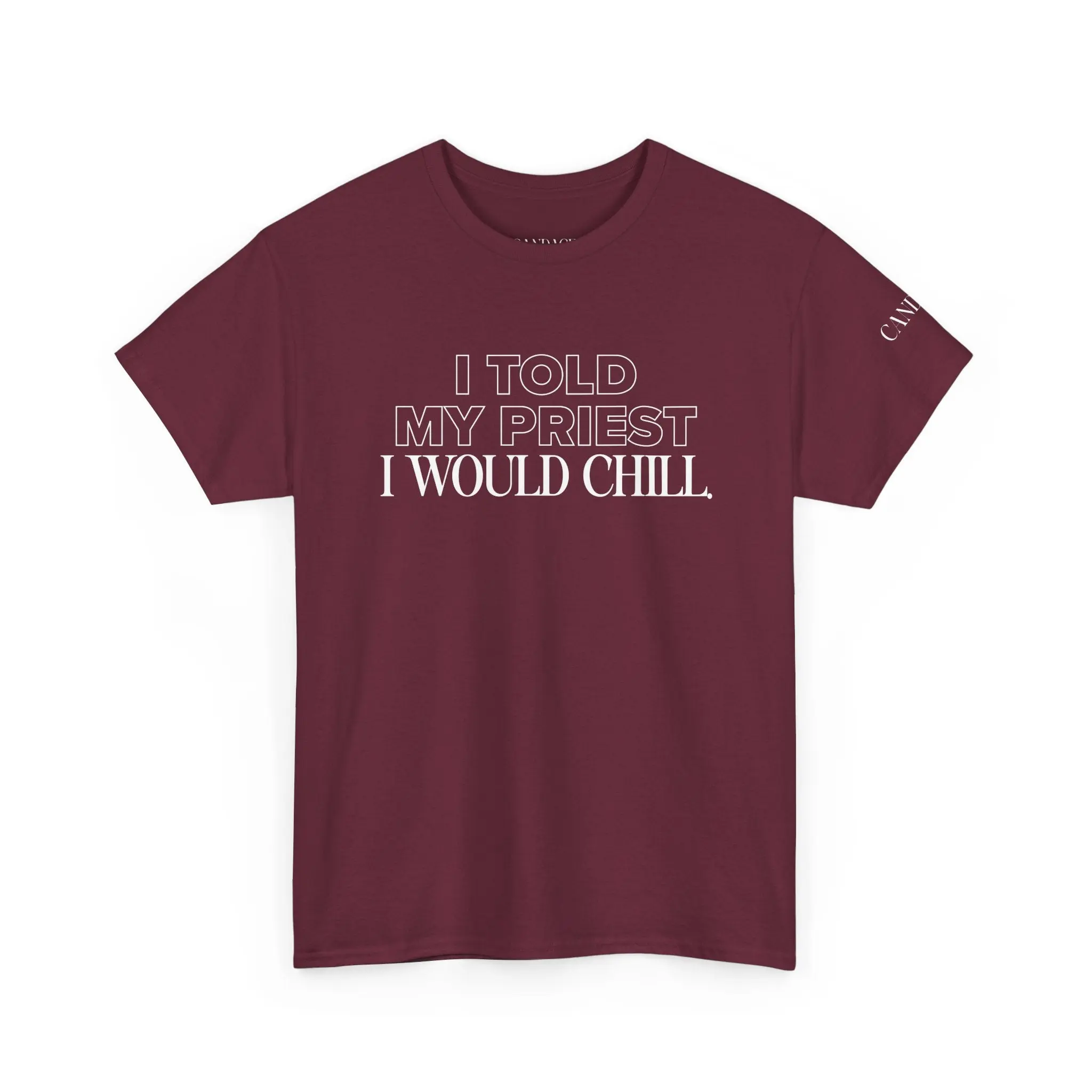This classic crewneck tee carries a quiet, witty attitude — a soft black canvas with a short, deadpan line across the chest: “I told the priest I would chill.” It feels like a shrug you can wear: relaxed proportions, neat ribbed collar, and a clean, minimalist print that reads like an inside joke. Wear it to coffee runs, late-night record digs, or low-key gatherings where dry humor lands best. The fabric drapes comfortably, the collar keeps its shape, and the tear-away label keeps the back of your neck irritation-free. It’s an easy, everyday shirt that slips into routines and sparks a small smile without trying too hard.