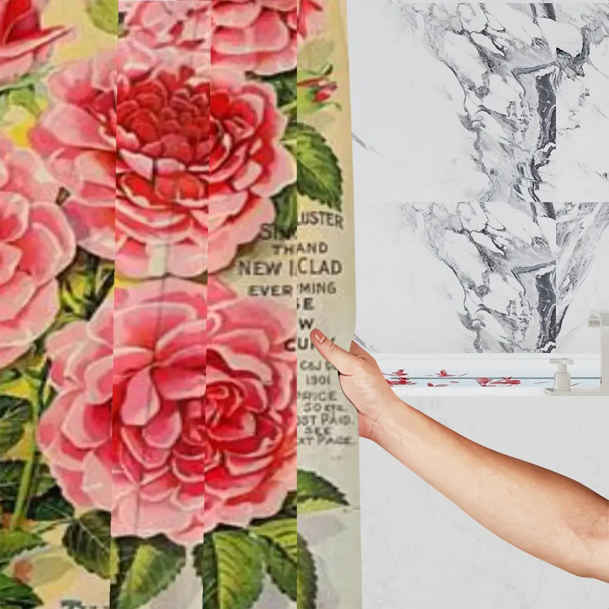 Bright, vintage roses bloom across a durable polyester shower curtain, bringing a soft, nostalgic garden feel to your bathroom. The one-sided print showcases layered pink and coral camellias with leafy green accents and subtle antique text in the background — like discovering an old seed catalog tucked into a sunny windowsill. It hangs from 12 reinforced buttonholes and drapes with a smooth, quick-drying fabric that keeps the floral artwork vivid wash after wash. This curtain slips effortlessly into a cozy, plant-filled home or a bathroom refreshed for spring, setting a calm, romantic mood every morning.