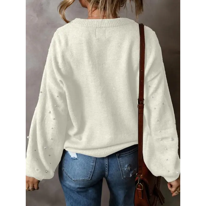 [embellishments]: The faux pearl adornments add a touch of sophistication, making this sweater an eye-catching piece for any occasion.