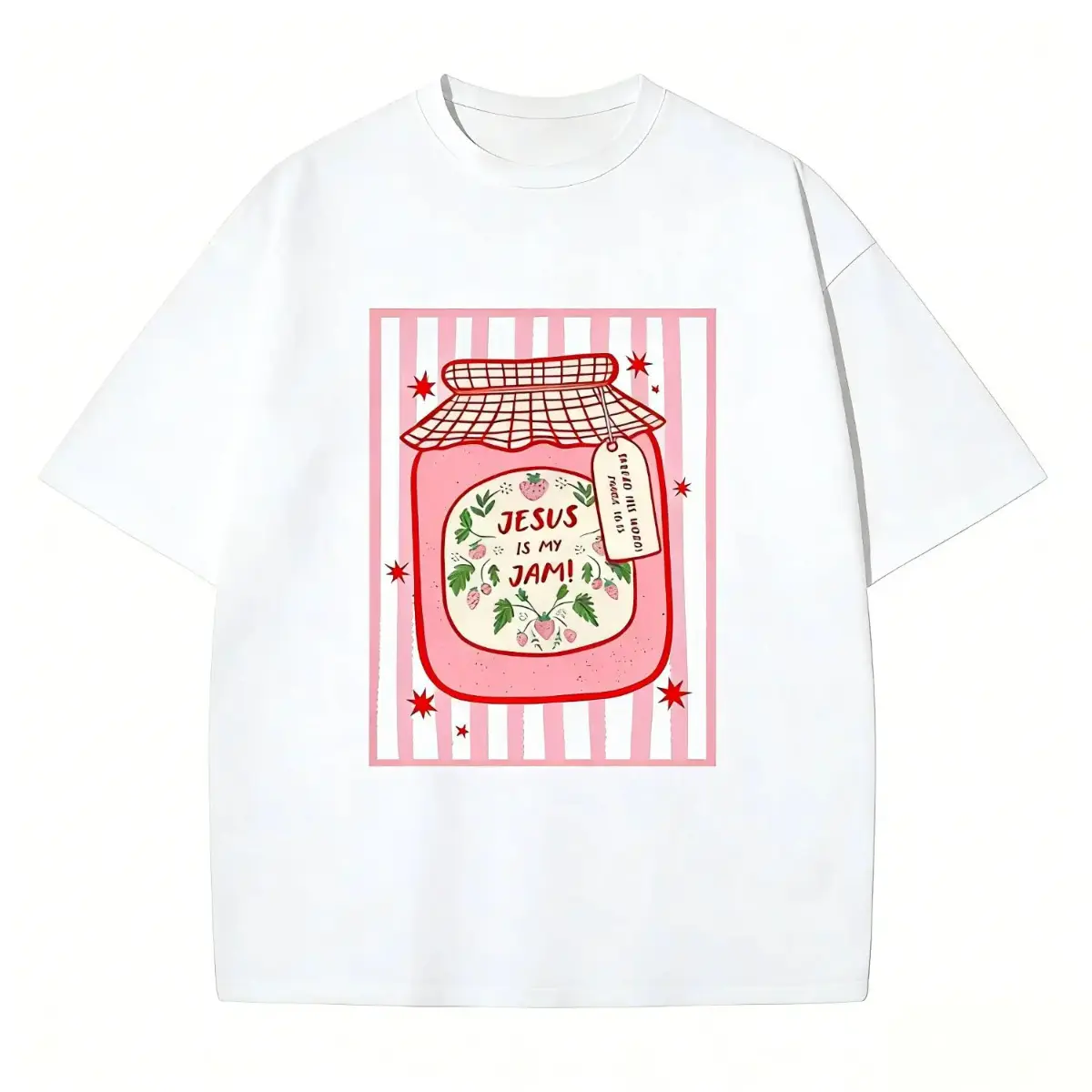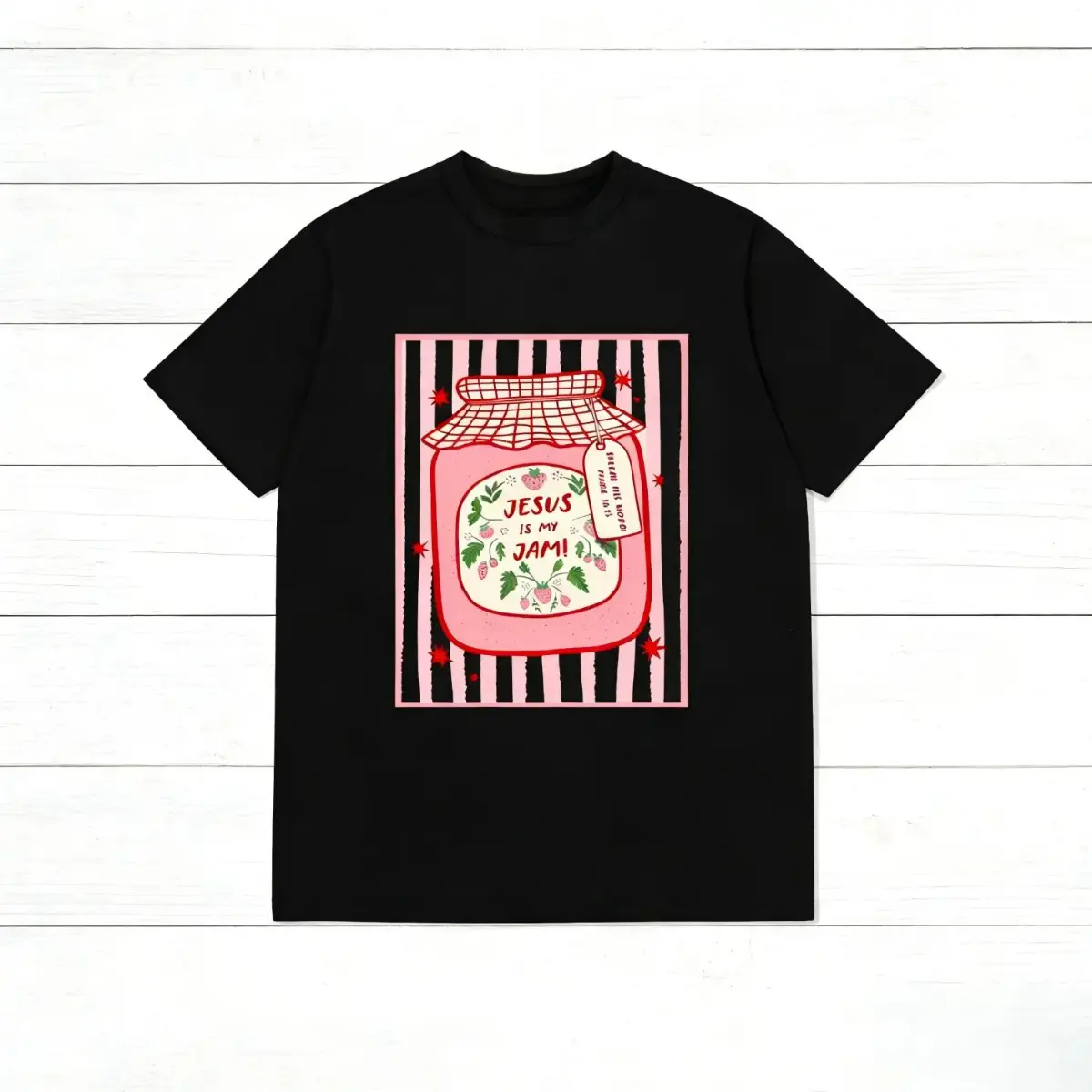 Jesus Is My Jam Strawberry Jam Jar Graphic Printed T-Shirt, Pink Washed Christian Tee, Crew Neck Cotton Polyester Graphic Shirt, y2k Fashion Casual Streetwear Humor, Everyday Outfit, Trendy Aesthetic Outfit 2026, Gifts, SuperYi