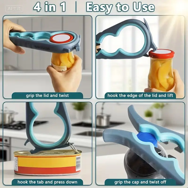 ✨ Effortlessly open your beverages with this versatile can opener! This multi-functional tool combines four essential features in one compact design. Perfect for opening cans, bottles, and caps with ease. The anti-slip design ensures a secure grip, making it user-friendly. Ideal for kitchens and bars, this opener simplifies your daily tasks.