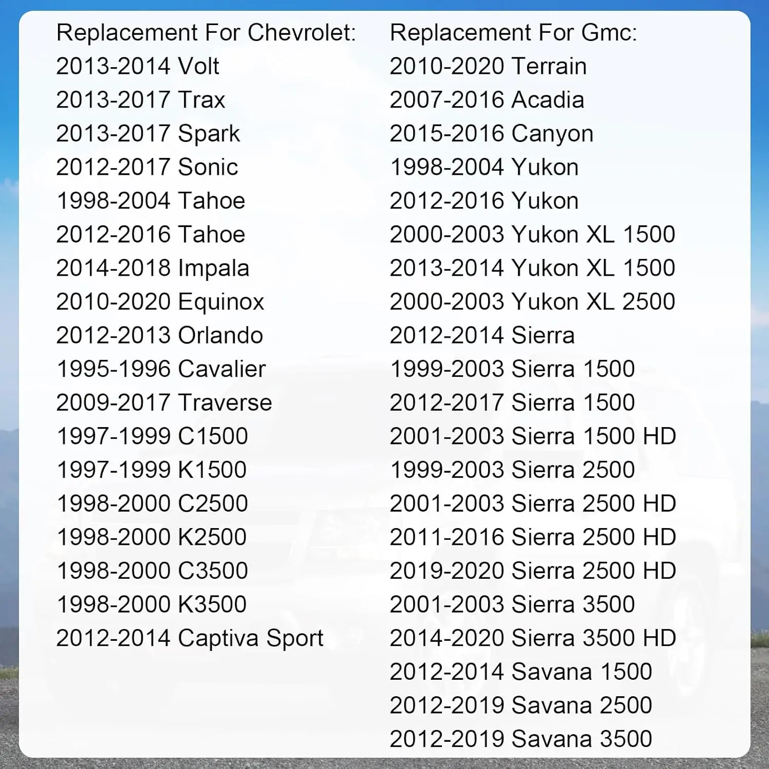 ·【Replacement For Gmc Cars】2010-2020 Terrain, 2007-2016 Acadia, 2015-2016 Canyon, 1998-2004 Yukon, 2012-2016 Yukon, 2012-2014 Sierra, 2012-2017 Sierra 1500, 1999-2003 Sierra 2500, 2011-2016 Sierra 2500 HD, 2001-2003 Sierra 3500, 2014-2020 Sierra 3500 HD, 2012-2014 Savana 1500, 2012-2019 Savana 2500, 2012-2019 Savana 3500, 2013-2016 Savana 4500