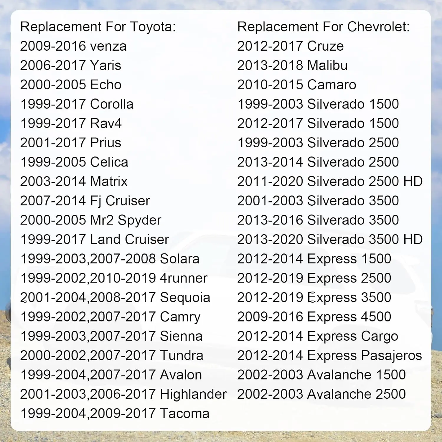 ·【Replacement For Chevrolet Cars】2012-2017 Cruze, 2013-2018 Malibu, 2010-2015 Camaro, 1999-2003 Silverado 1500, 2012-2017 Silverado 1500, 1999-2003 Silverado 2500, 2013-2014 Silverado 2500, 2001-2003 Silverado 3500, 2013-2016 Silverado 3500, 2012-2014 Express 1500, 2012-2019 Express 2500, 2002-2003 Avalanche 1500, 2002-2003 Avalanche 2500