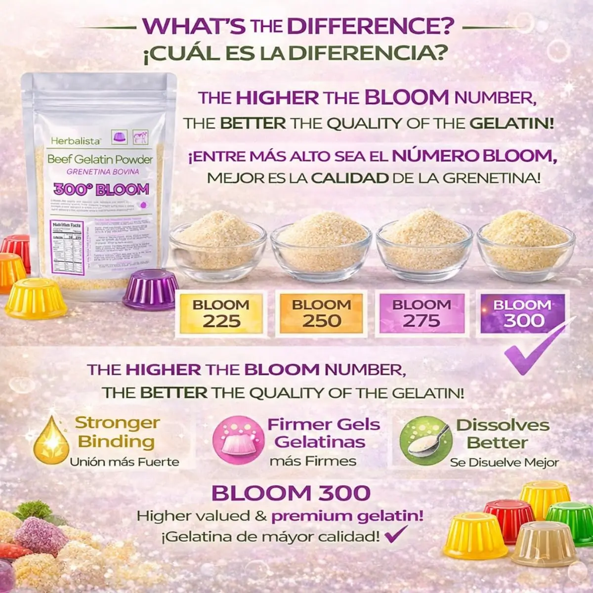 ·Herbalista Beef Gelatin Powder 300 Bloom is a premium, high-strength gelatin designed to take your recipes to the next level. Whether you're making jiggly desserts , chewy gummies , fluffy marshmallows ️, or creamy panna cotta — this powerful 300 Bloom formula delivers firmer texture, better consistency, and professional results every time.