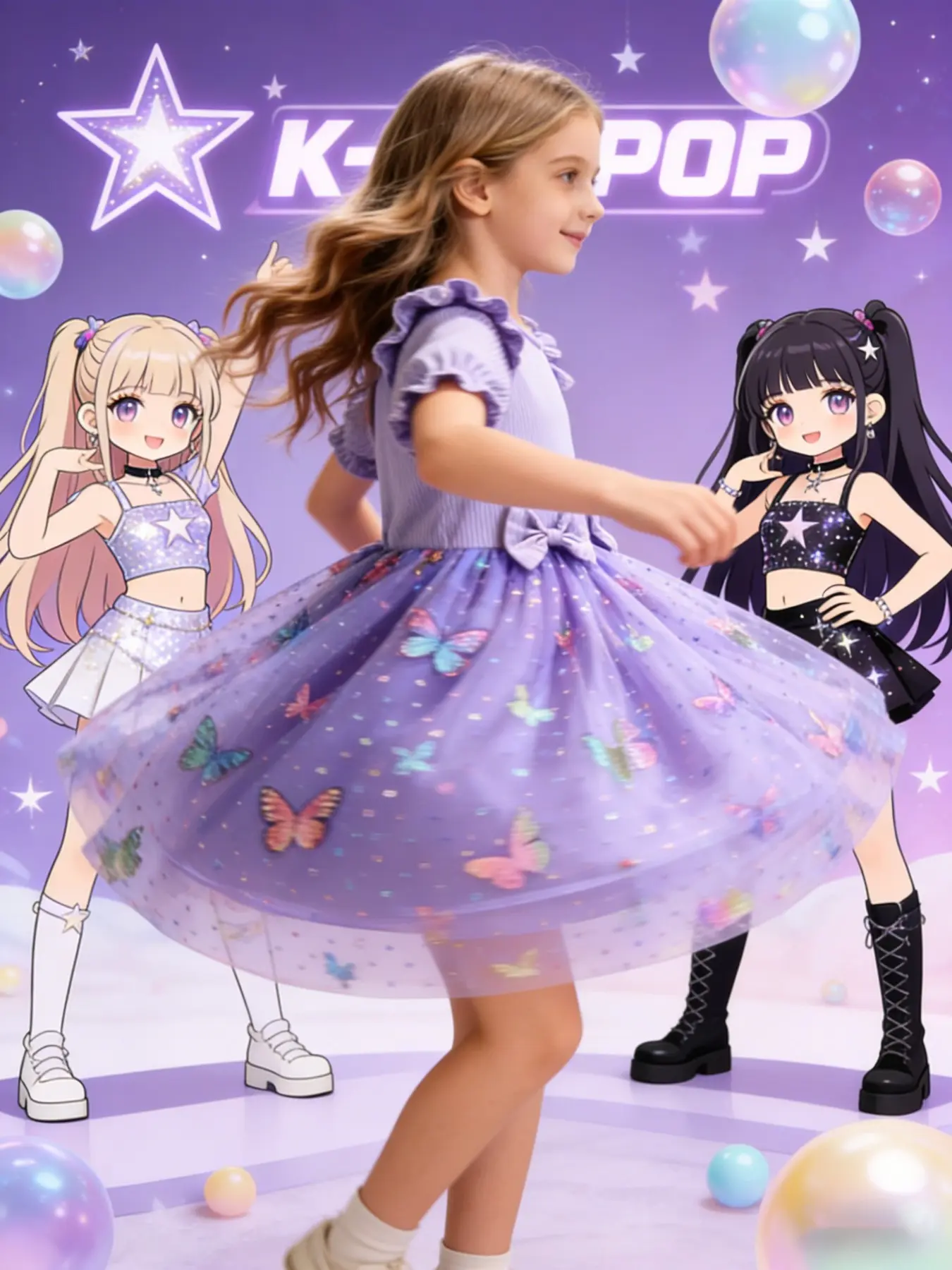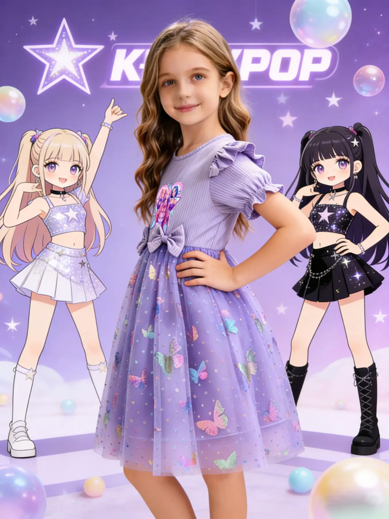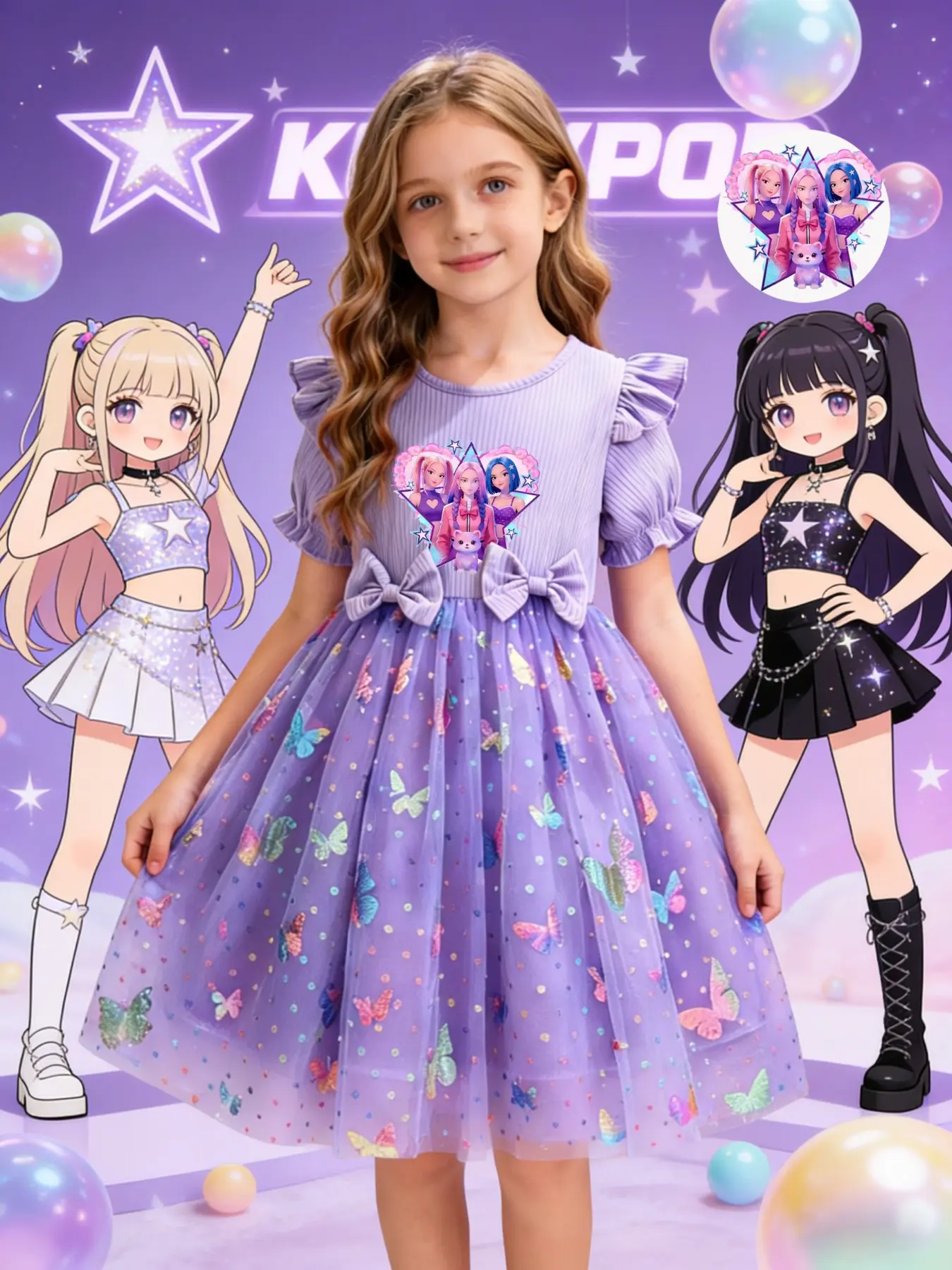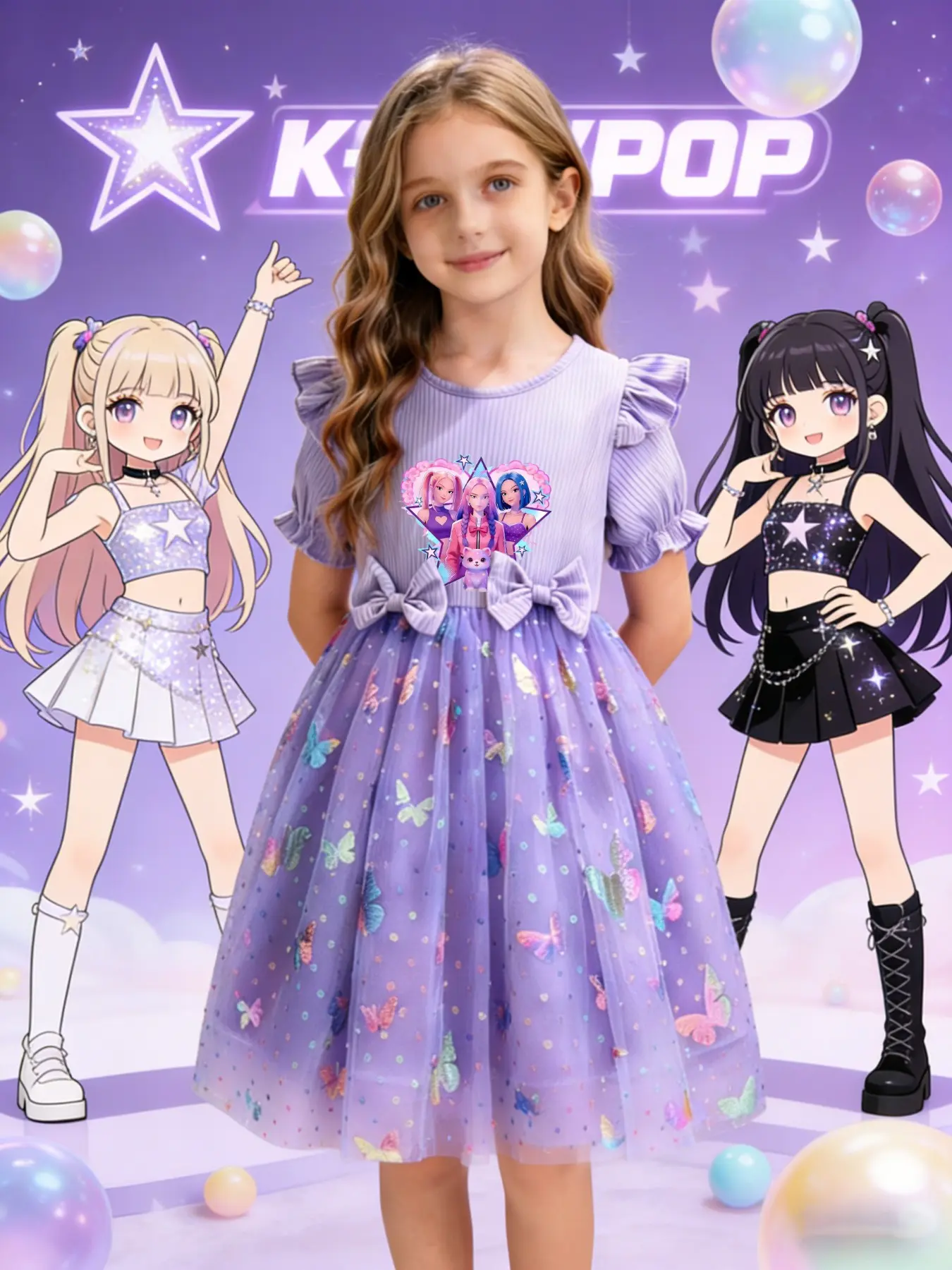 Princess Party Dance Dress, Butterfly Mesh Skirt, Dreamy Elegant Design, K-Pop Girl Group Print, Perfect for Camping Travel Parties