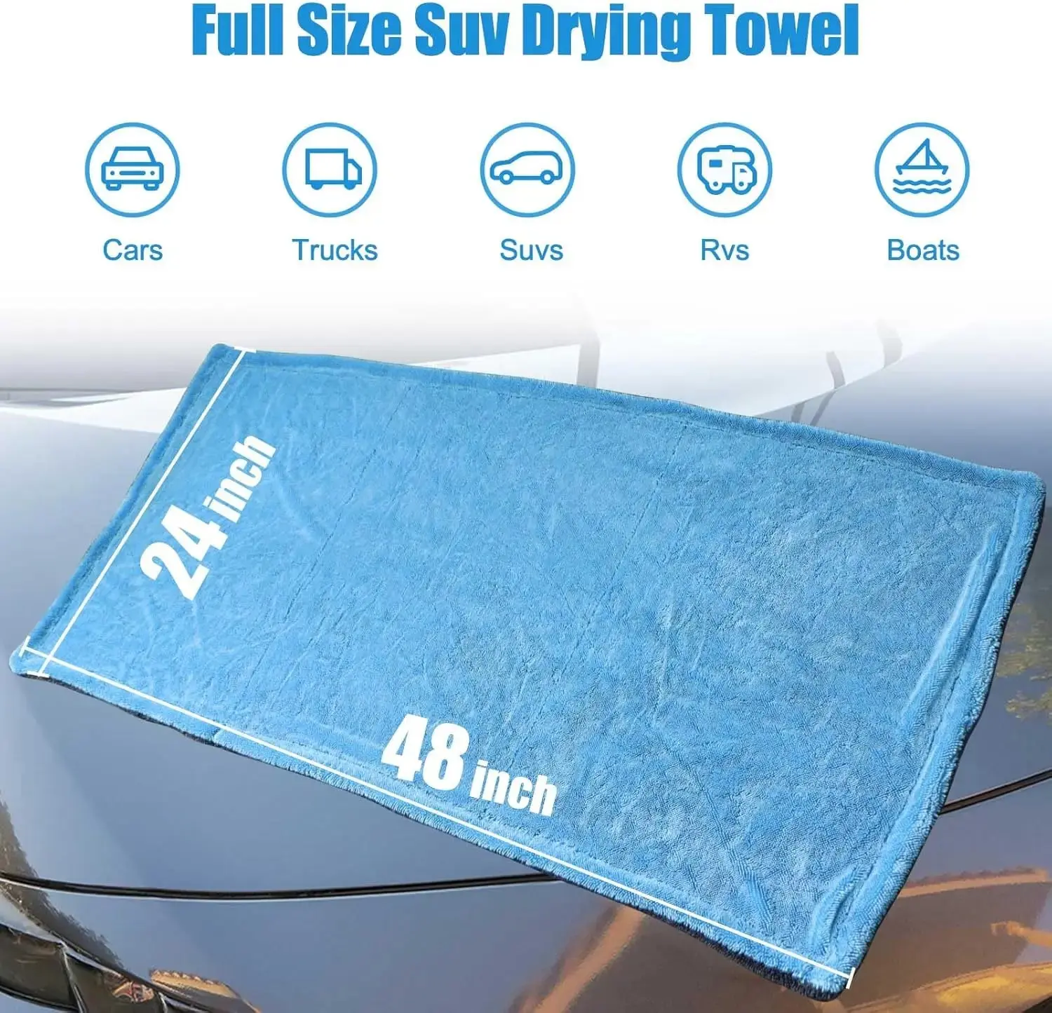 ·Ultra-Large 48”x24” Size for Full-Sized SUVs & Trucks. Our car drying towel is designed to cover more surface area than standard microfiber towels for cars, making it perfect for Full-Sized SUVs, trucks, and sedans. The generous 48"x24" size ensures faster drying with fewer passes, saving you time and effort.