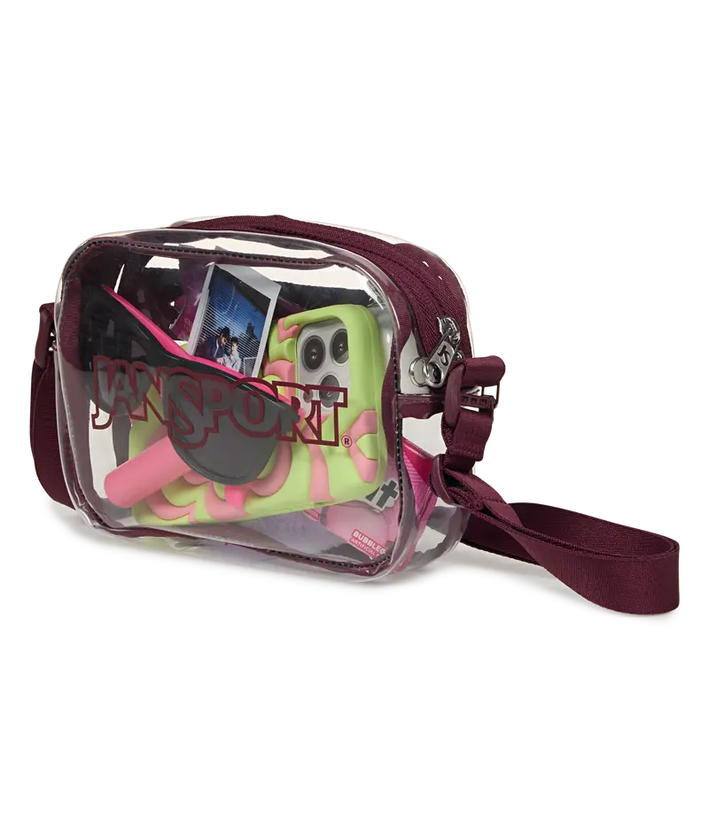 Transparent, but never subtle. The Clear Crossbody was made for good times, great outfits, and zero bag drama at the gate. Made in part with 30% recycled main body material, it's sized for your phone, wallet, tickets, and touch-up kit, with a removable strap and back zip pocket for easy access mid set.