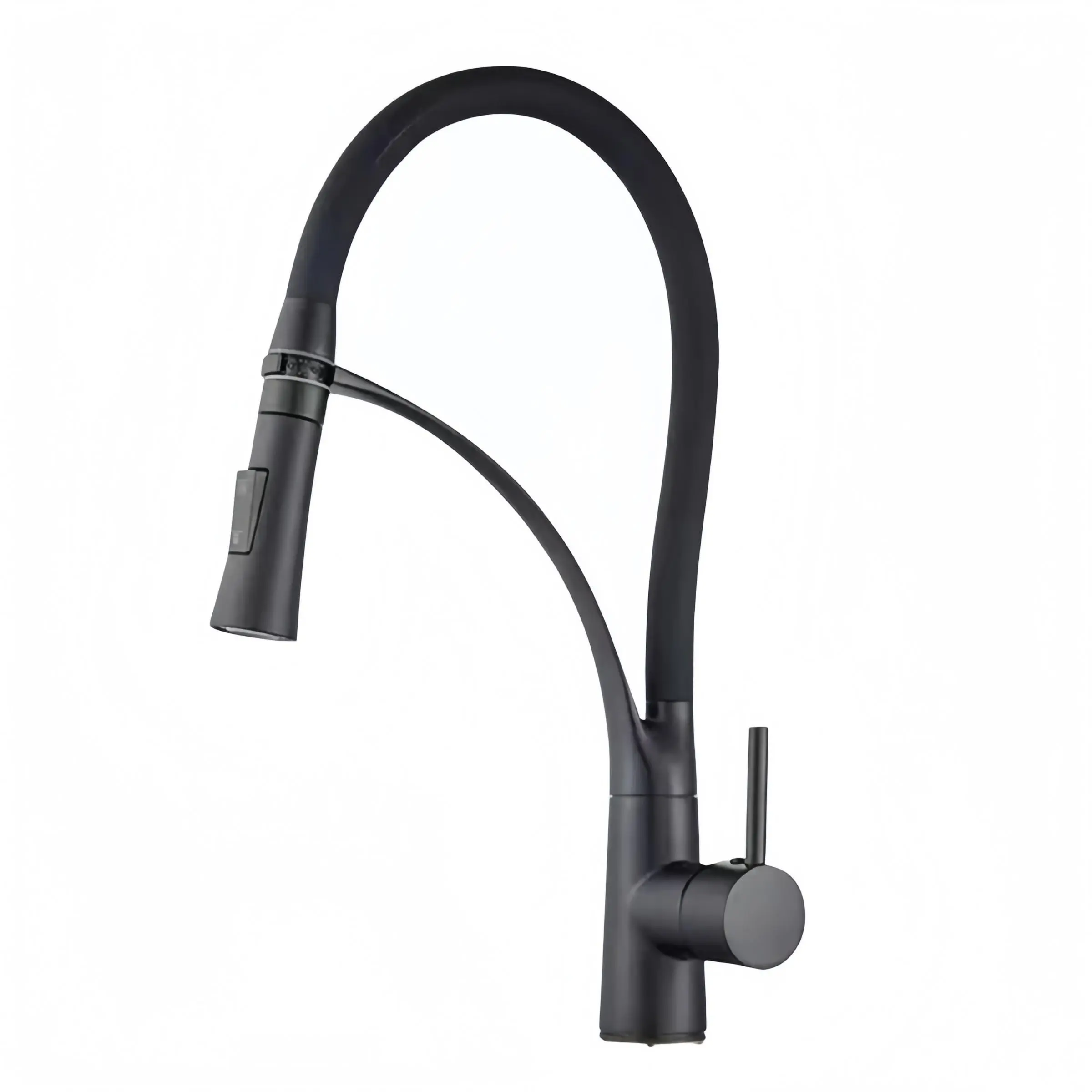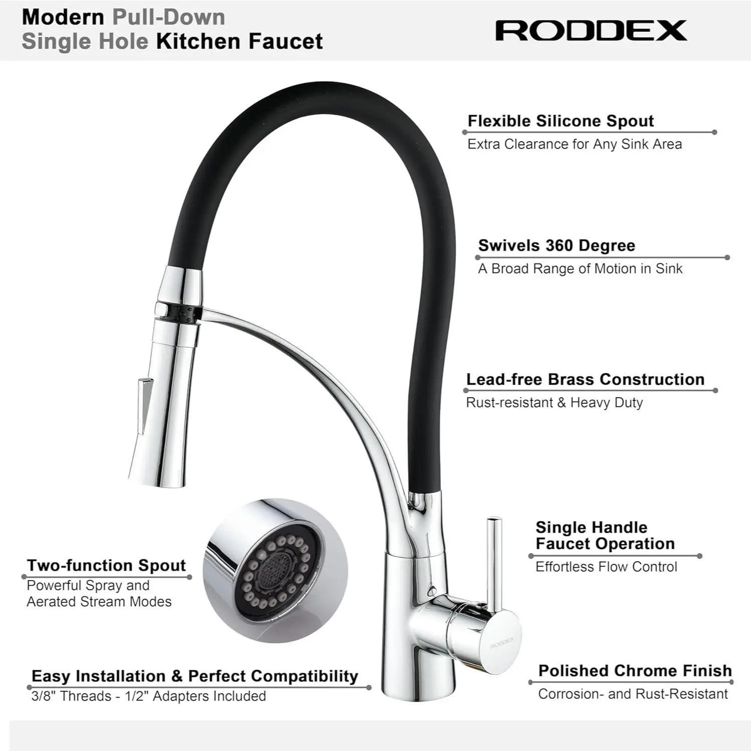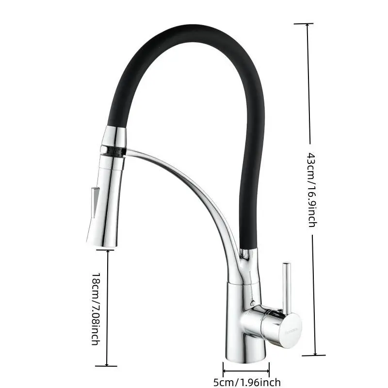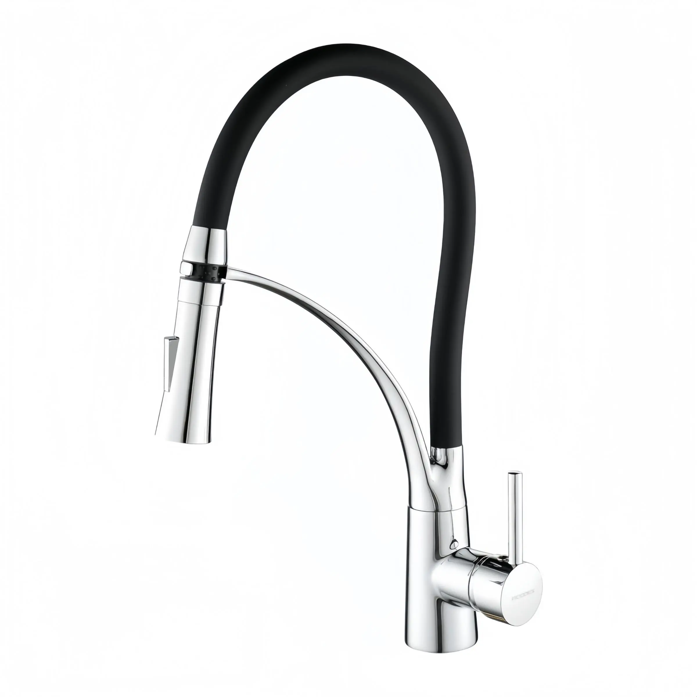 Extractable Kitchen Faucet Flexible Silicone Sprayer, Single Handle Pull-Down Brass Goose Neck, Modern High Arc, Polished Chrome Rubber Nozzle Hose