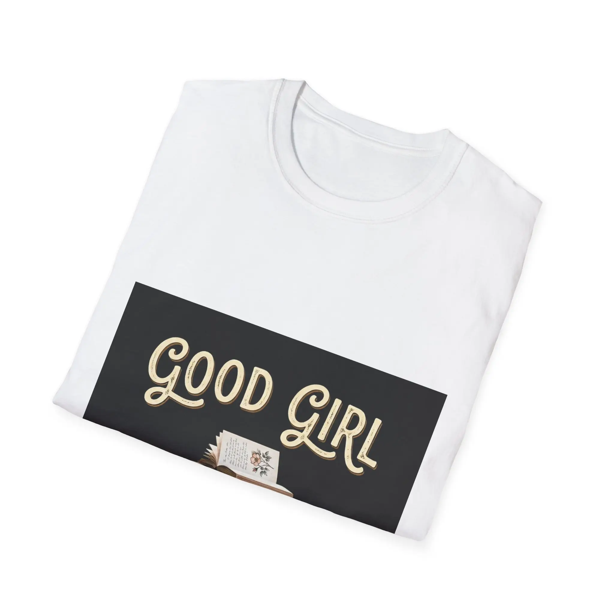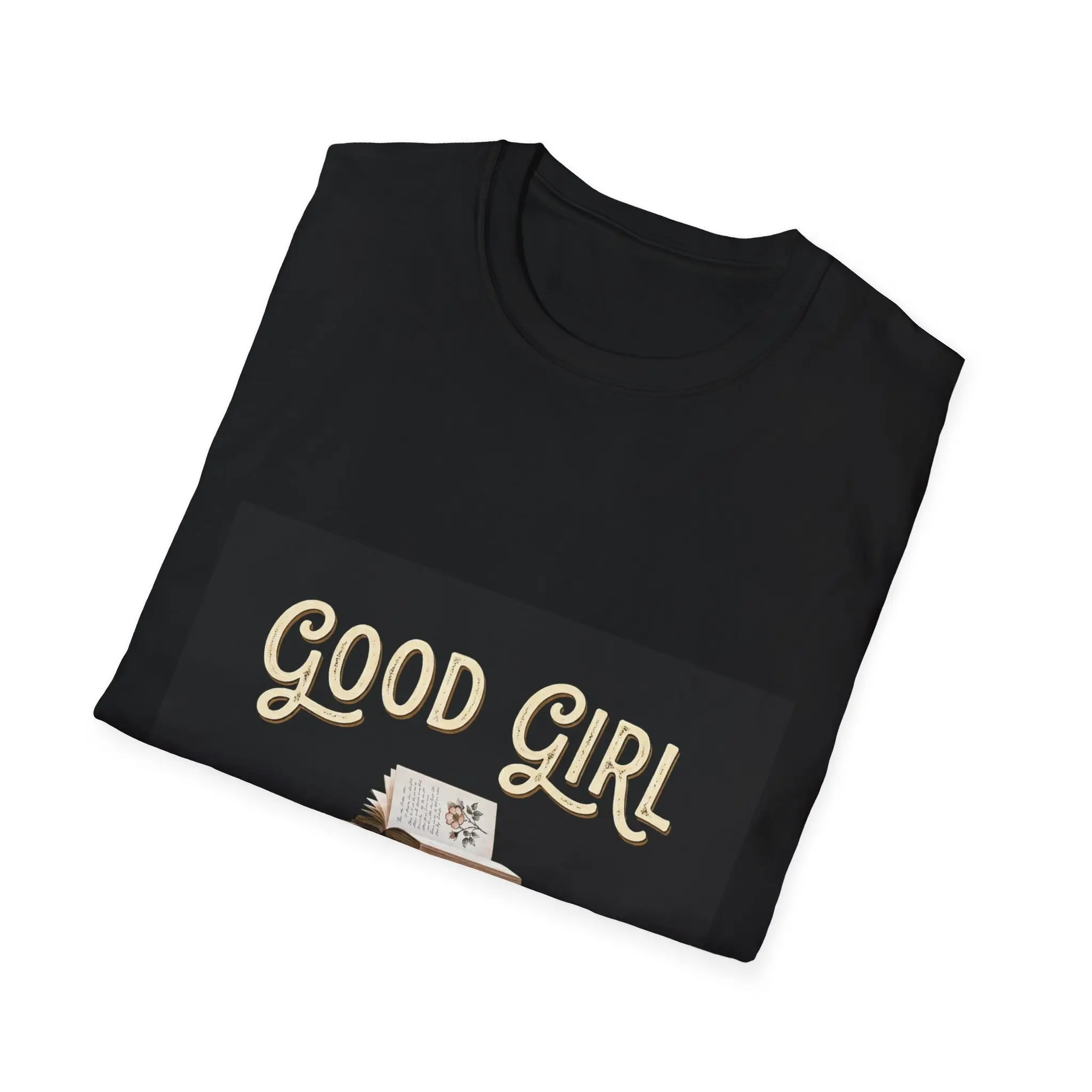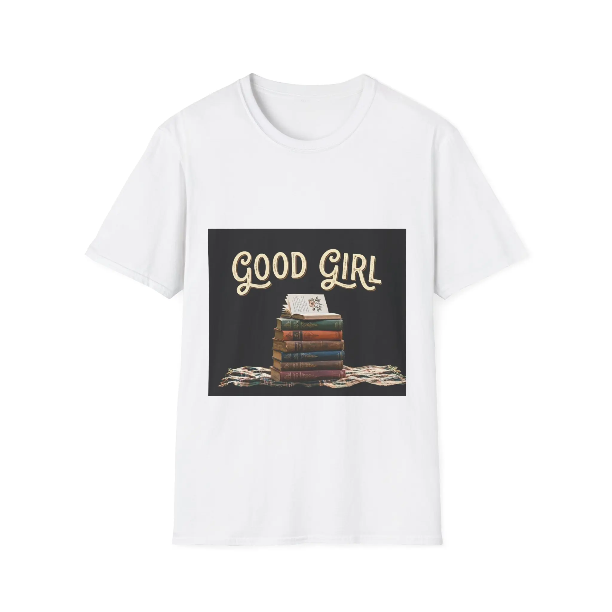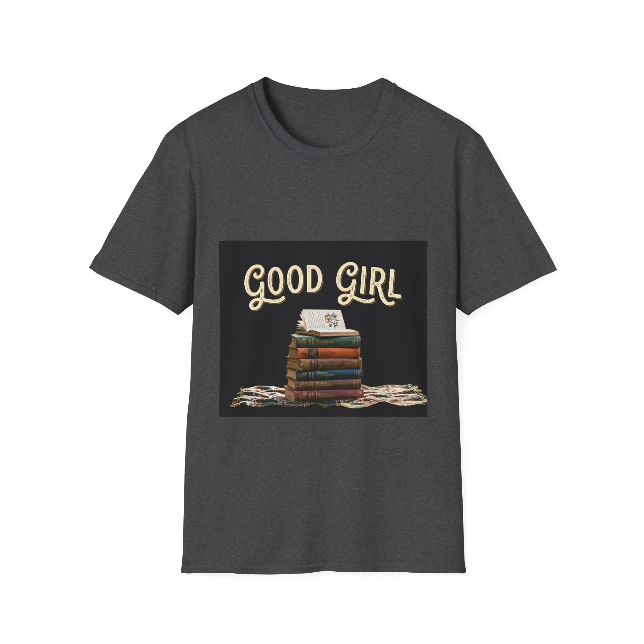 Soft, lived-in vibes in a clean, lightweight tee. This crew-neck shirt features a warm, vintage-style print of stacked books and the hand-lettered phrase “Good Girl,” giving it a quiet, cozy energy — like an afternoon spent with a novel and a mug of tea. The fabric falls softly across the shoulders and keeps its shape thanks to ribbed knitting and shoulder taping, so it wears comfortably from a library run to an easy weekend coffee date. Breathable and ethically made, it slips into a slow, bookish wardrobe and pairs naturally with denim, cardigans, or a favorite flannel.
