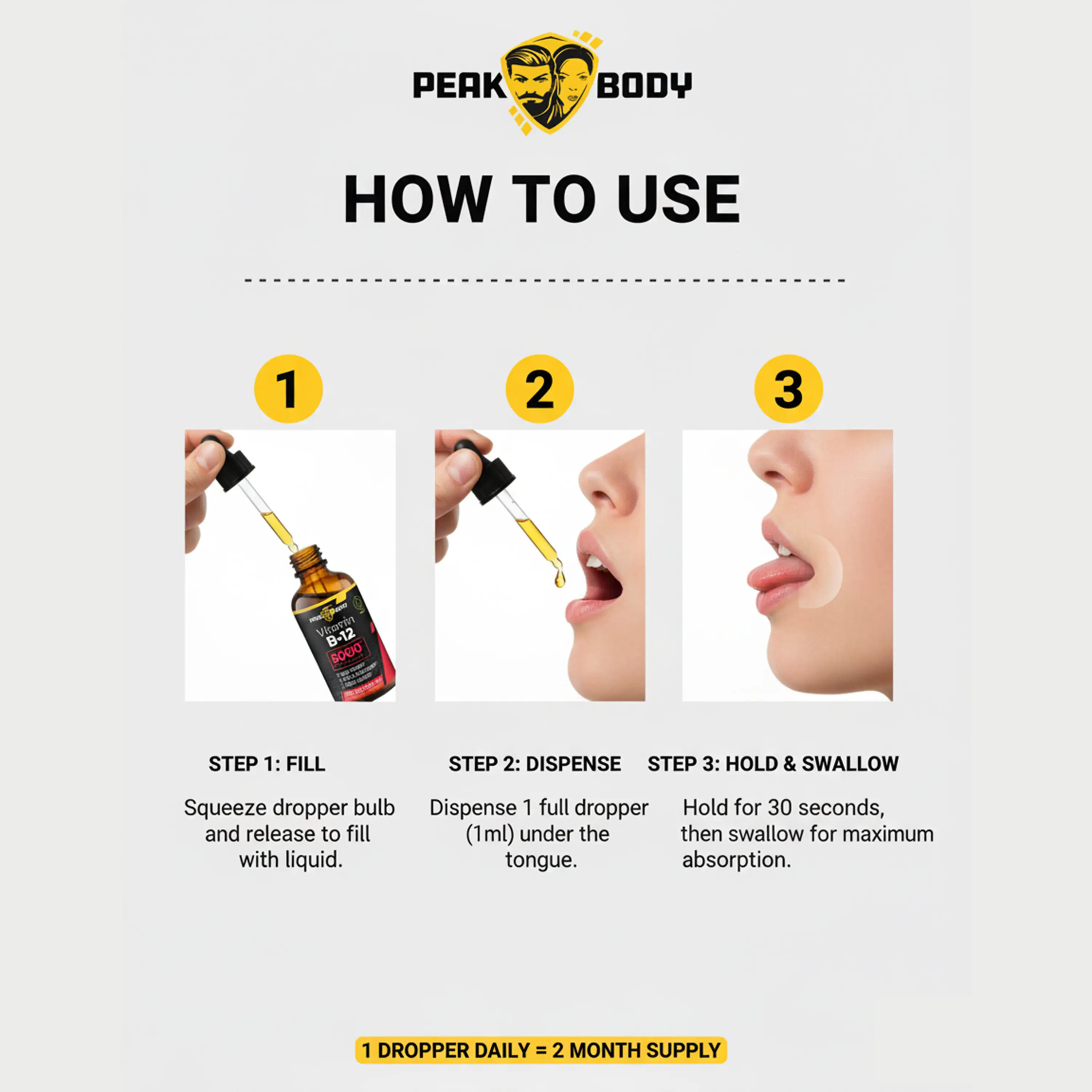PeakBody Vitamin B12 is a dietary supplement designed for daily use. This formula provides a direct source of Vitamin B12 in an easy-to-swallow format, manufactured to meet standard quality guidelines.