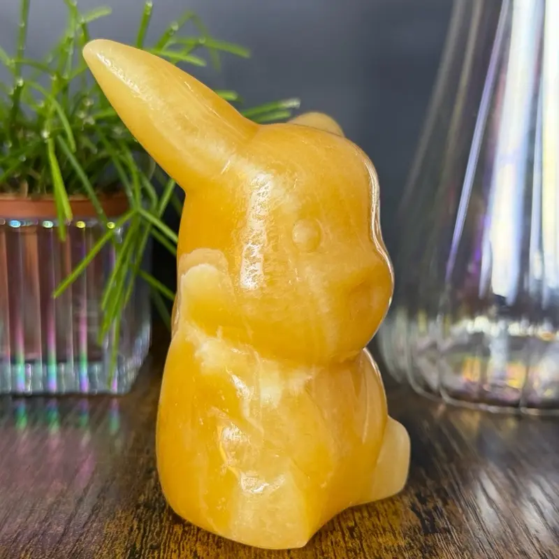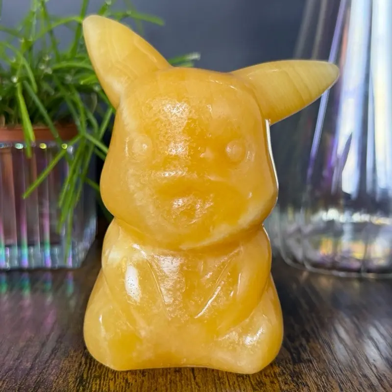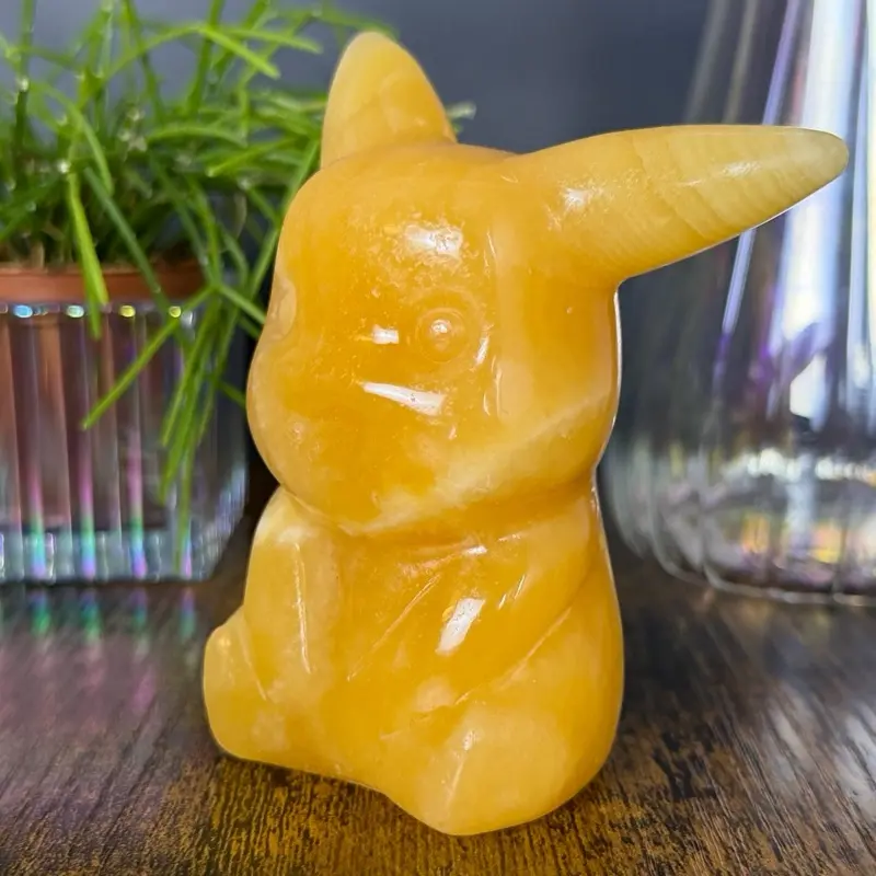 This larger Pikachu-inspired carving is crafted from yellow calcite, showcasing rich golden hues with soft, creamy banding throughout. The stone has a warm, glowing appearance, and its semi-translucent nature allows light to gently illuminate the piece, enhancing its depth and character.