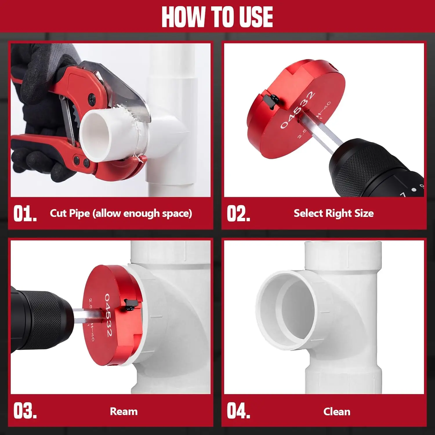 ·{ Complete Size Coverage } Crafted specifically for North American Schedule 40 pipe diameters, this pvc pipe reamer kit is available in 6-piece or 9-piece sets to cover the most common plumbing sizes. The 6-piece set includes: 3/4", 1", 1-1/2", 2", 3", 4" and a cushioned box. (Not suitable for Schedule 80 pipes.)