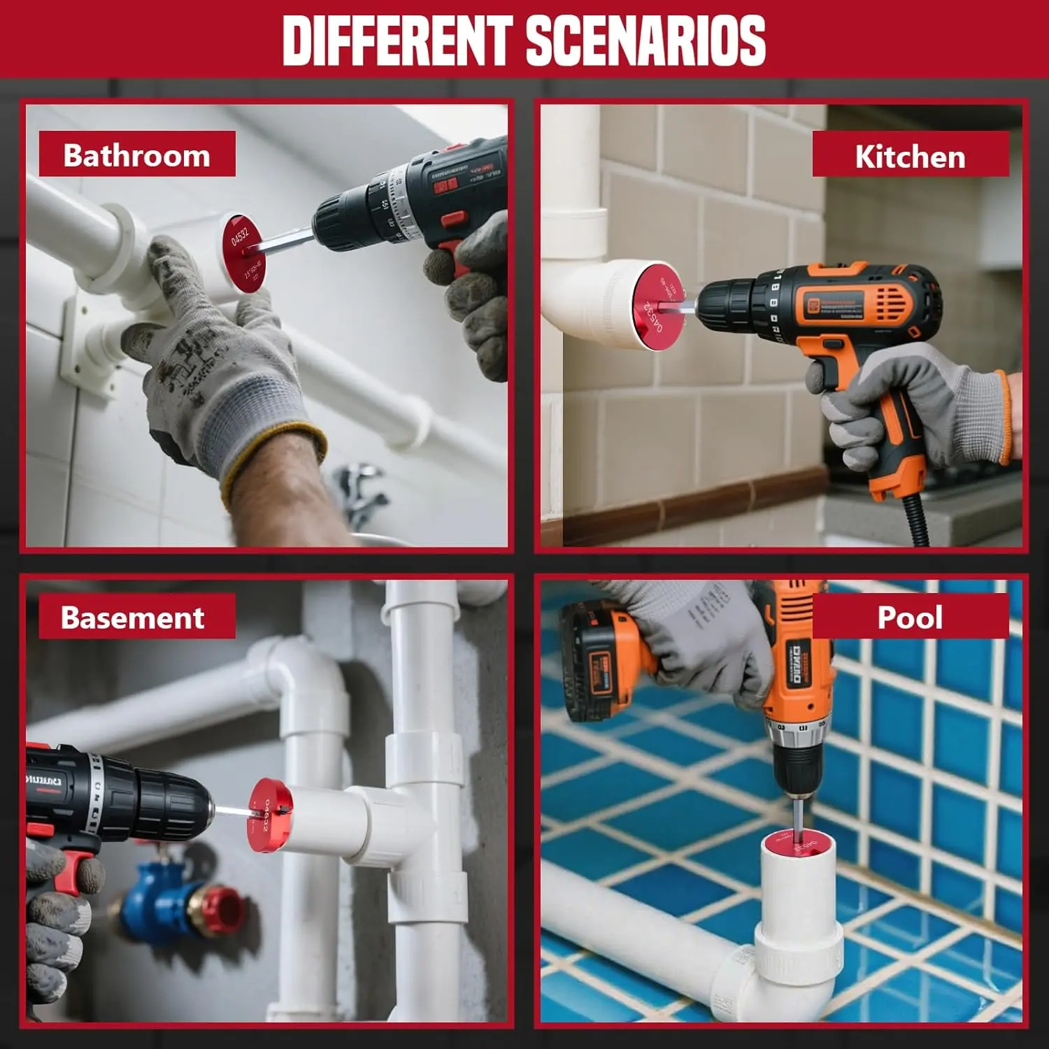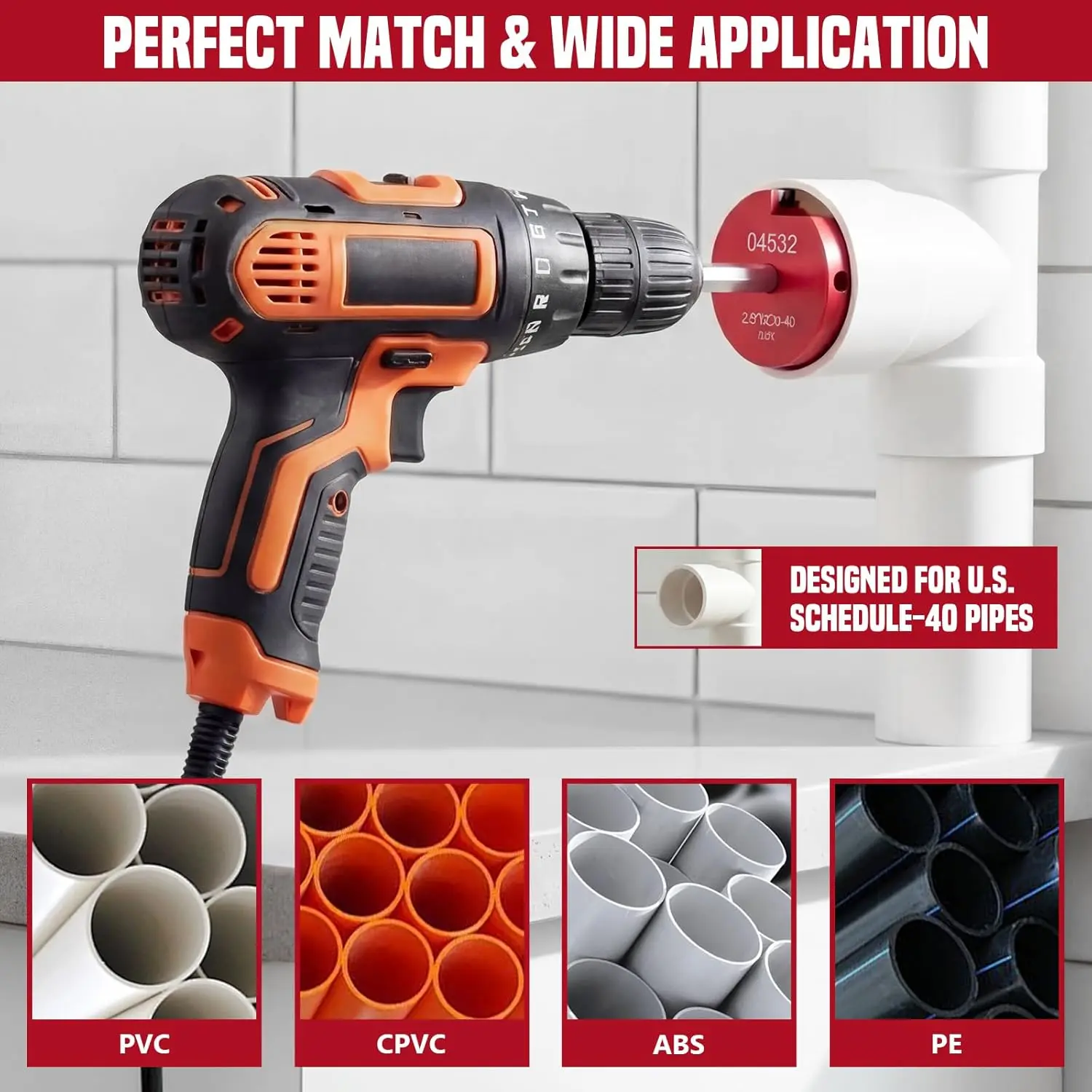 ·{ Must-have for Pipe Fitting } Designed to clean the interior of PVC, CPVC, and ABS fittings, this pipe reamer is compatible with most 1/2" corded drills, cordless drills, and impact drivers. Ideal for ventilation pipes, water lines, and drain repairs in kitchens, bathrooms, pools, hot tubs, and other residential or commercial plumbing applications.