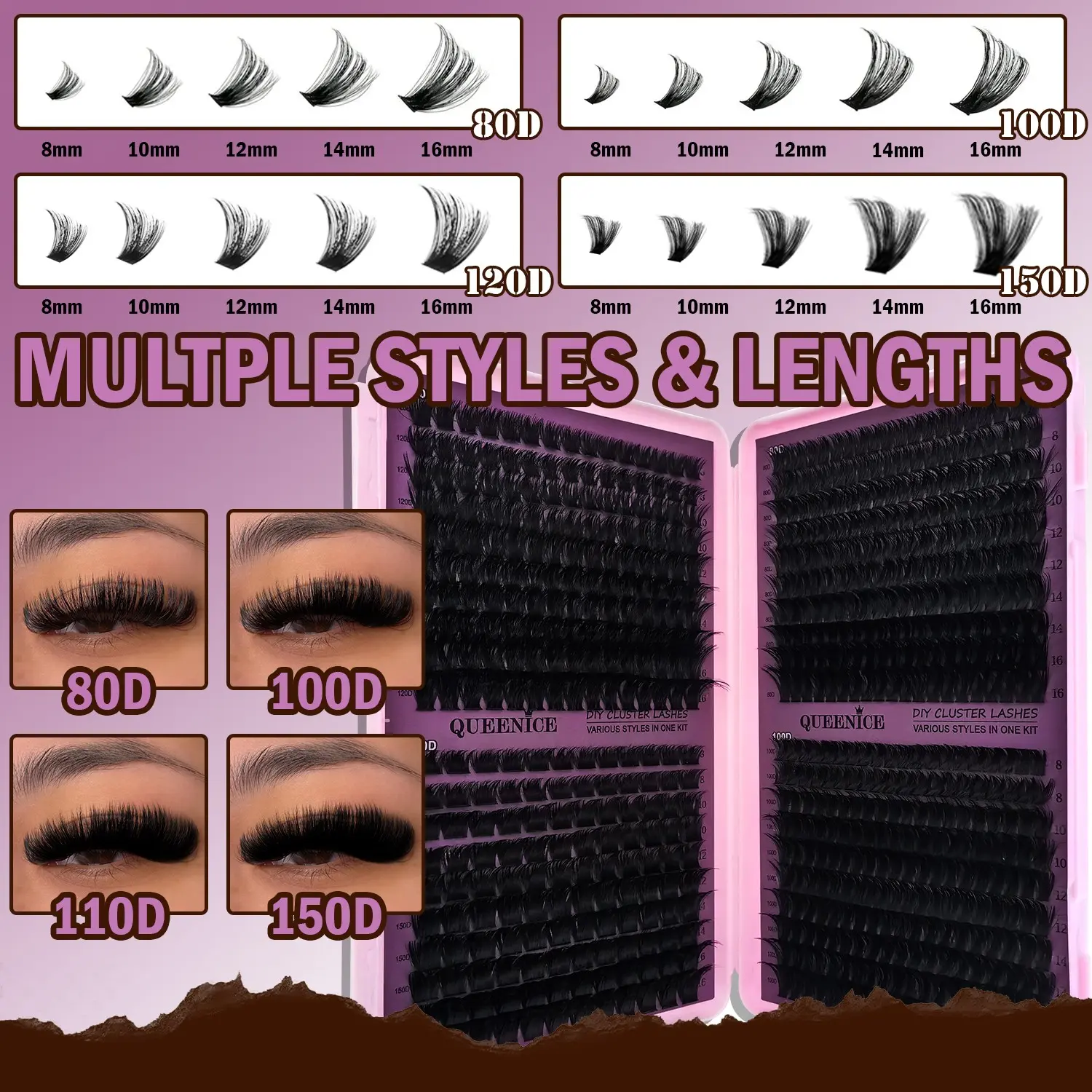Eyelash Extensions Kit with 800pcs Lash Clusters, 2-In-1 Lash Bond, Tweezers, Lash Brush, Mixed D Curl, Reusable for Beginners