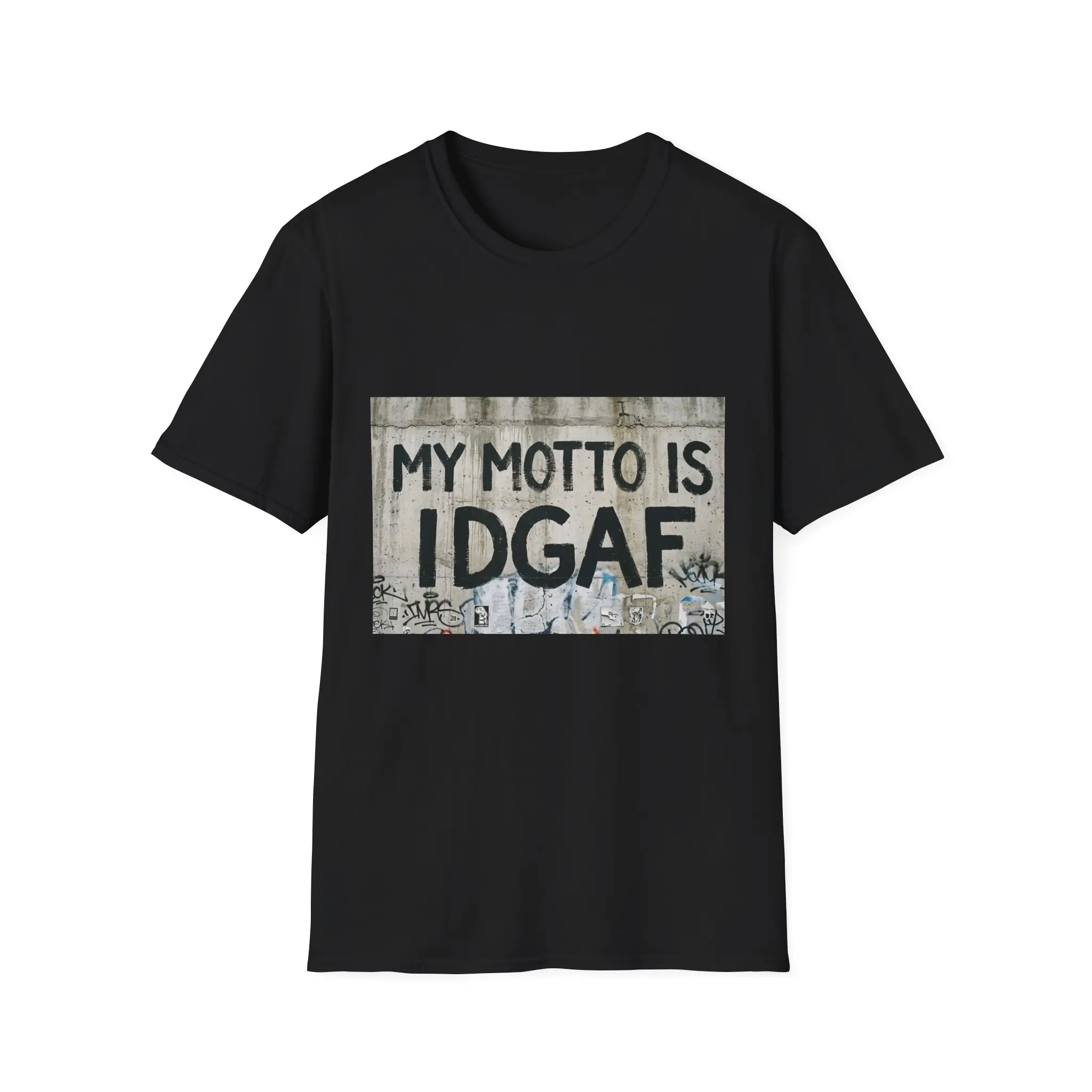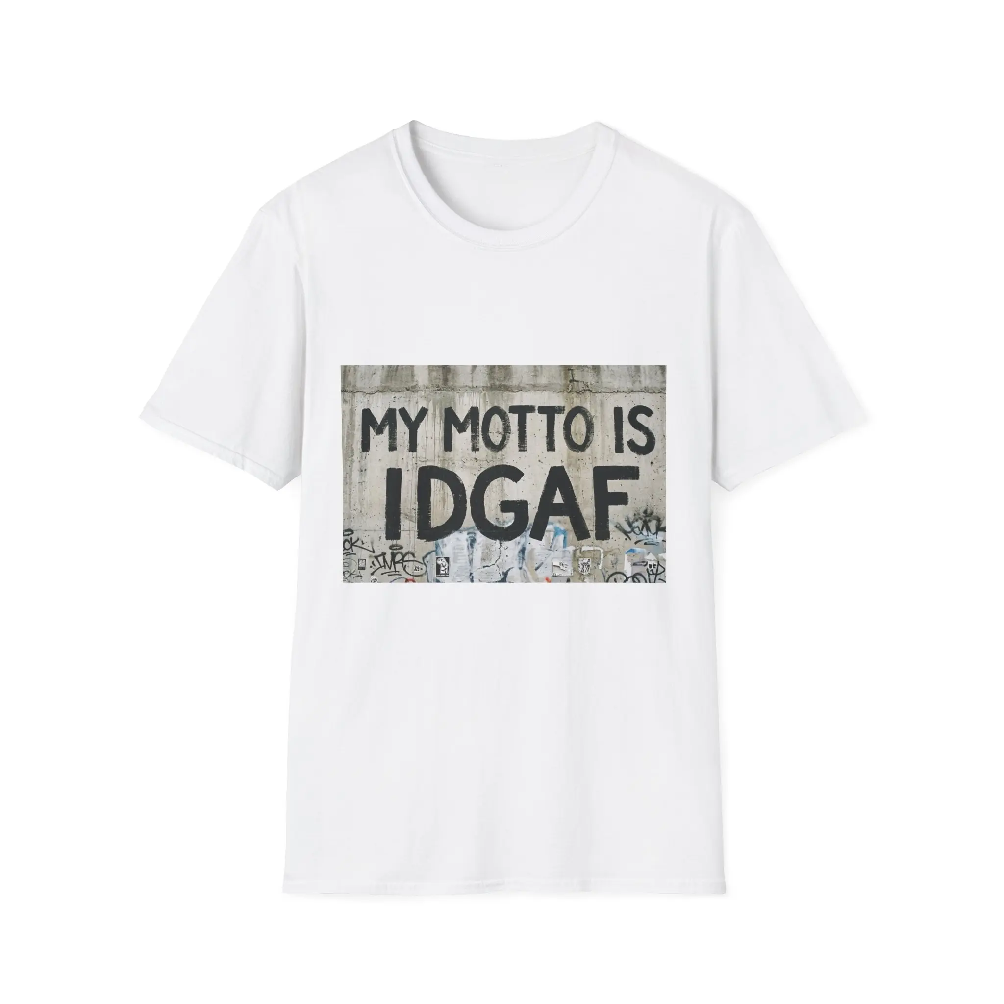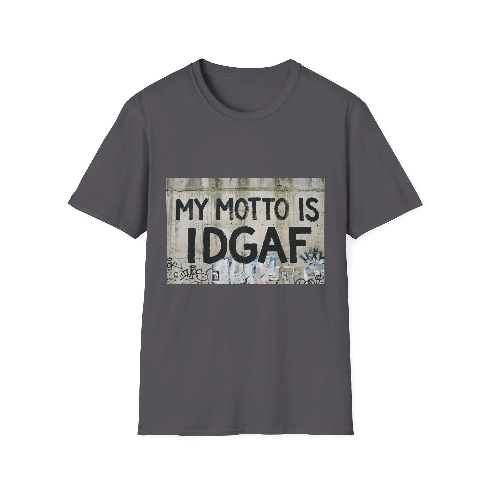 This lightweight crewneck tee carries a bold streetwise statement: a gritty, stenciled graphic that reads “MY MOTTO IS IDGAF” against a weathered concrete backdrop. The soft, ring-spun cotton drapes cleanly and feels breathable, so the attitude comes through without sacrificing comfort. Wear it layered under a denim jacket on a city night or alone on warm, slow afternoons—this shirt blends everyday ease with unapologetic edge. The classic fit keeps the silhouette familiar and wearable, while the tear-away label and reinforced collar keep it feeling simple and reliably comfortable through repeated wear.