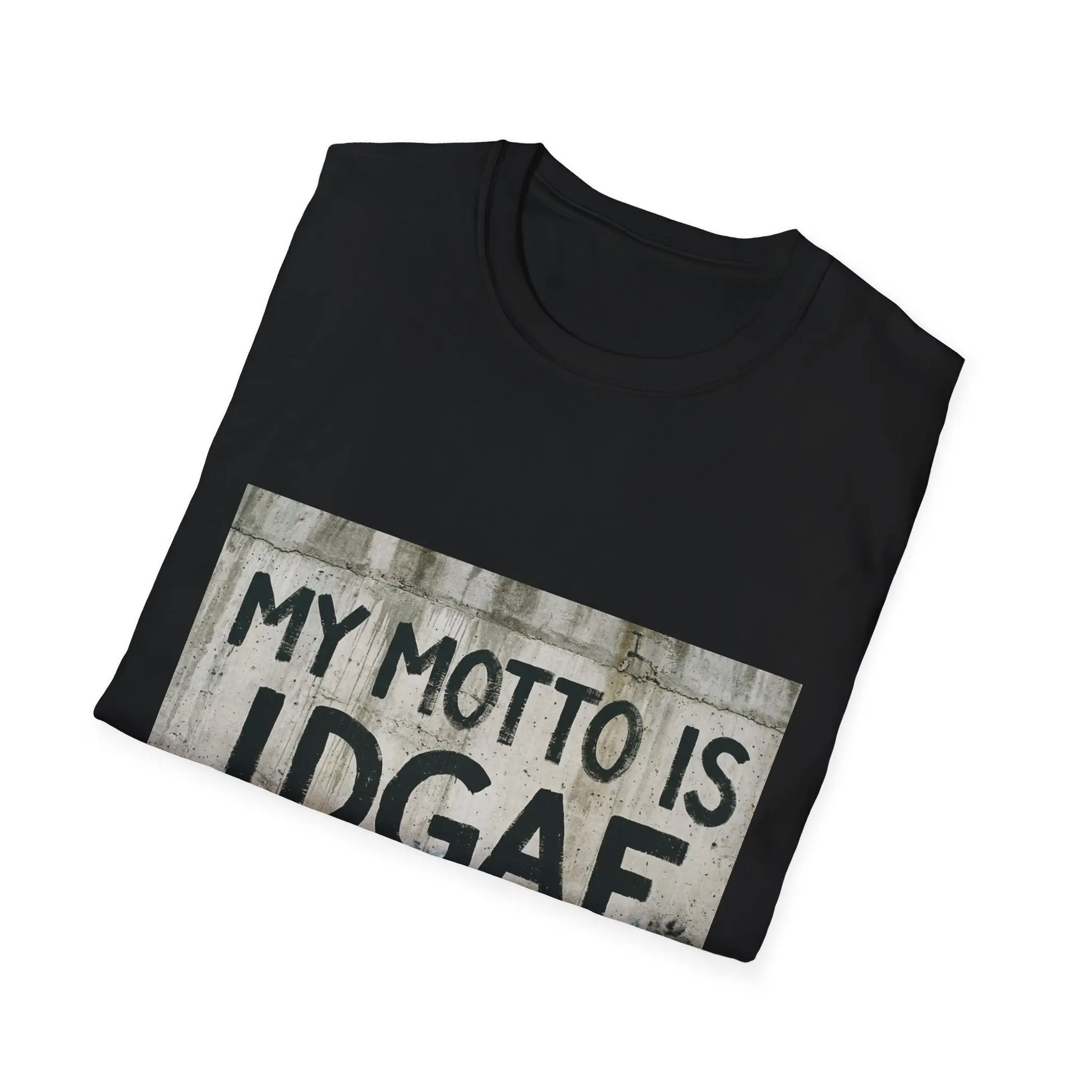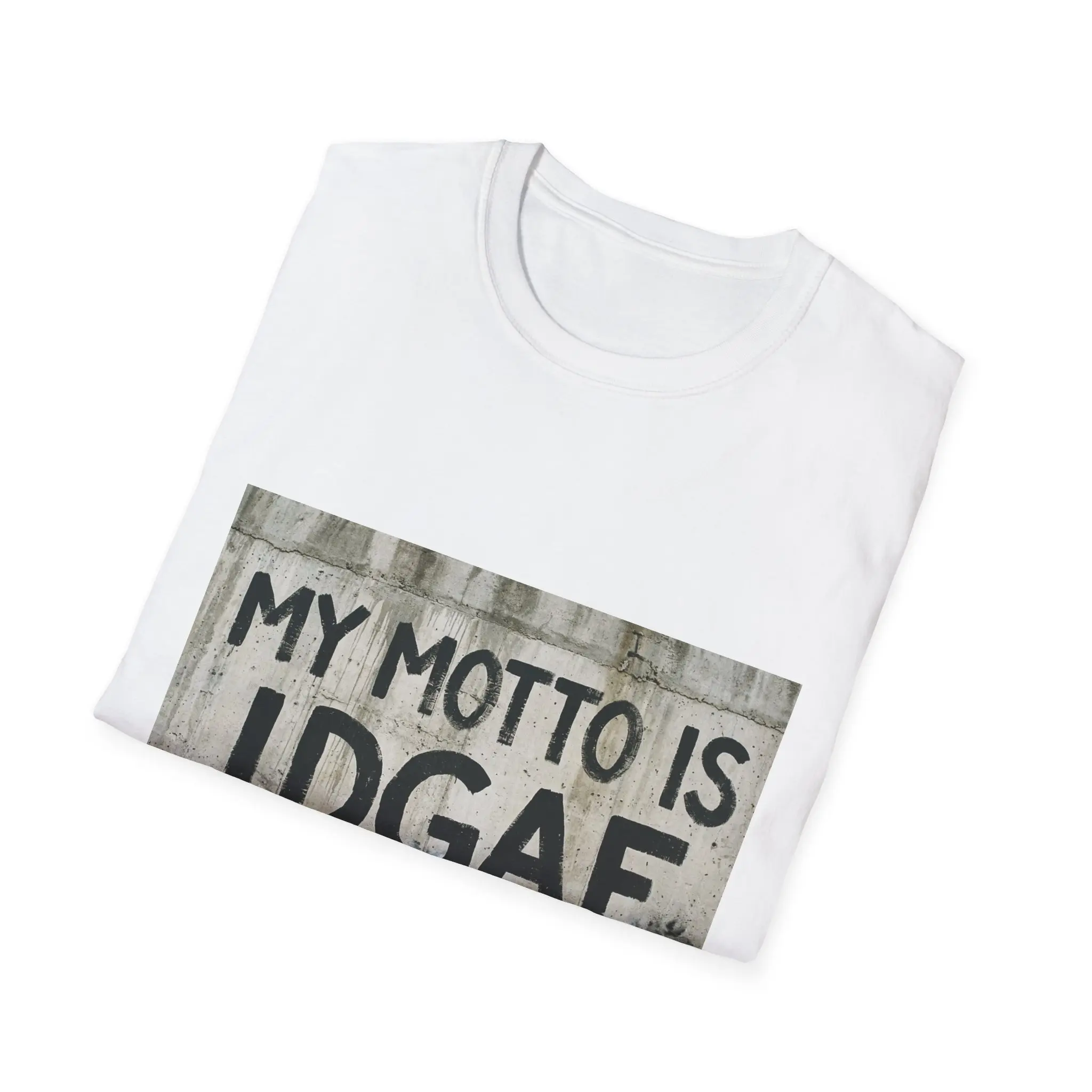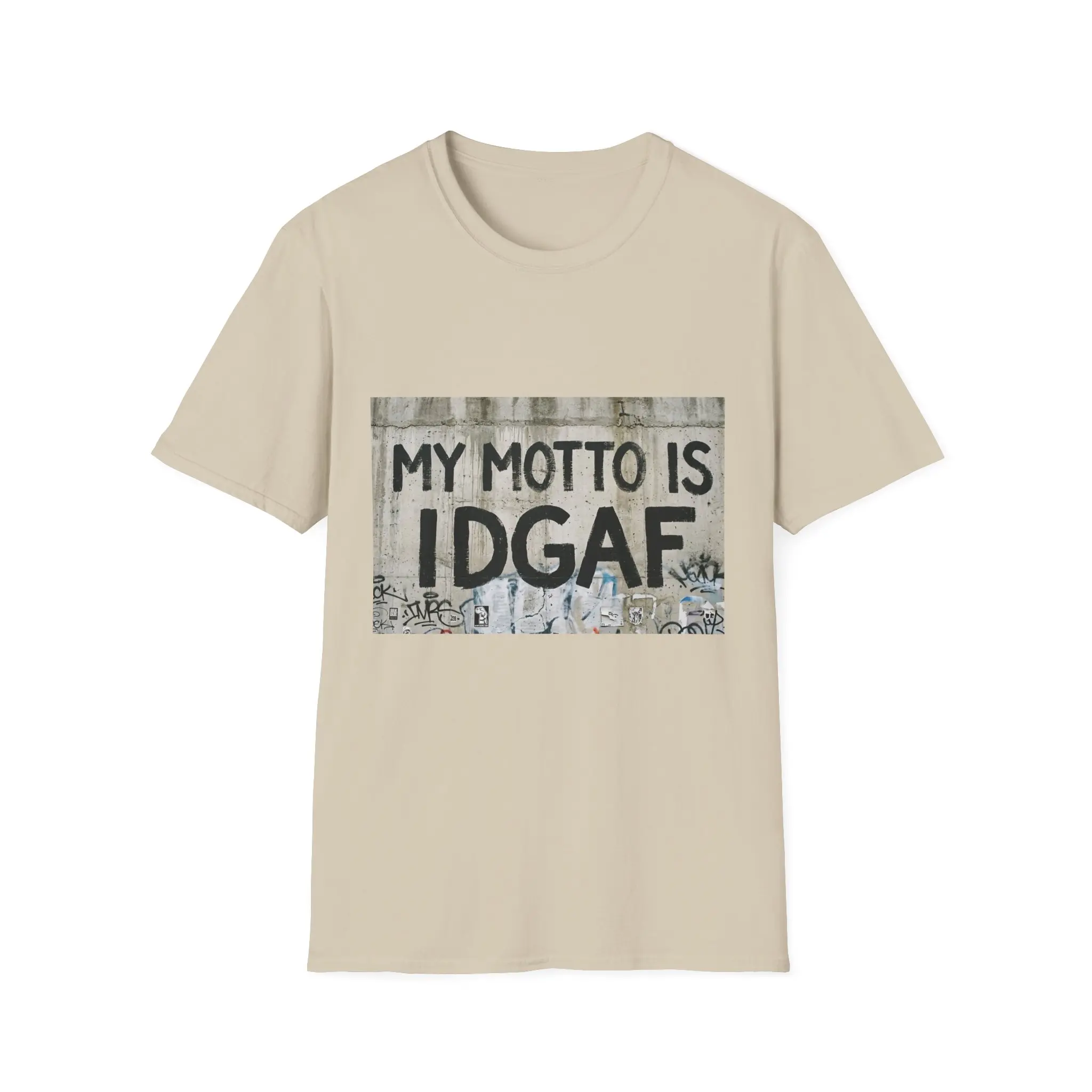 This lightweight crewneck tee carries a bold streetwise statement: a gritty, stenciled graphic that reads “MY MOTTO IS IDGAF” against a weathered concrete backdrop. The soft, ring-spun cotton drapes cleanly and feels breathable, so the attitude comes through without sacrificing comfort. Wear it layered under a denim jacket on a city night or alone on warm, slow afternoons—this shirt blends everyday ease with unapologetic edge. The classic fit keeps the silhouette familiar and wearable, while the tear-away label and reinforced collar keep it feeling simple and reliably comfortable through repeated wear.