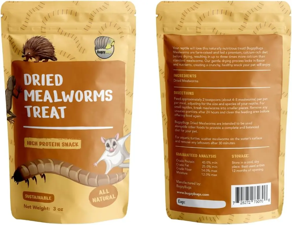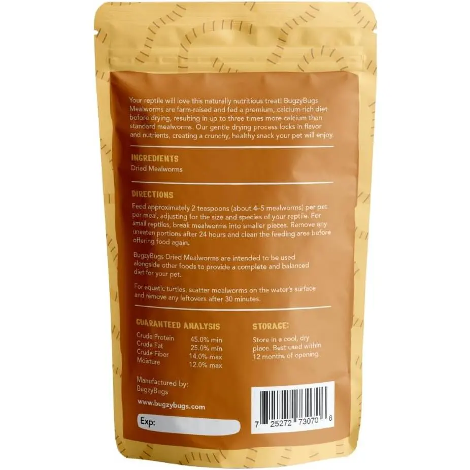 ·Your pet will love this naturally nutritious treat! BugzyBugs Dried Mealworms Treat are a premium calcium-rich food source. These mealworms are perfect as an occasional treat or supplemental feeder when paired with a balanced diet. Whether you’re feeding bearded dragons, geckos, turtles, frogs, or other insect-eating pets, BugzyBugs Mealworms provide a clean, convenient, and nutritious option. Feed approximately 2 teaspoons (about 4–5 mealworms) per pet per meal, adjusting based on the size and species of your reptile. For smaller reptiles, break mealworms into smaller pieces. Remove any uneaten portions after 24 hours and clean the feeding area before offering food again. For aquatic turtles, scatter mealworms on the water’s surface and remove any leftovers after 30 minutes. BugzyBugs Dried Mealworms are intended to be fed alongside other foods to help provide a complete and balanced diet.