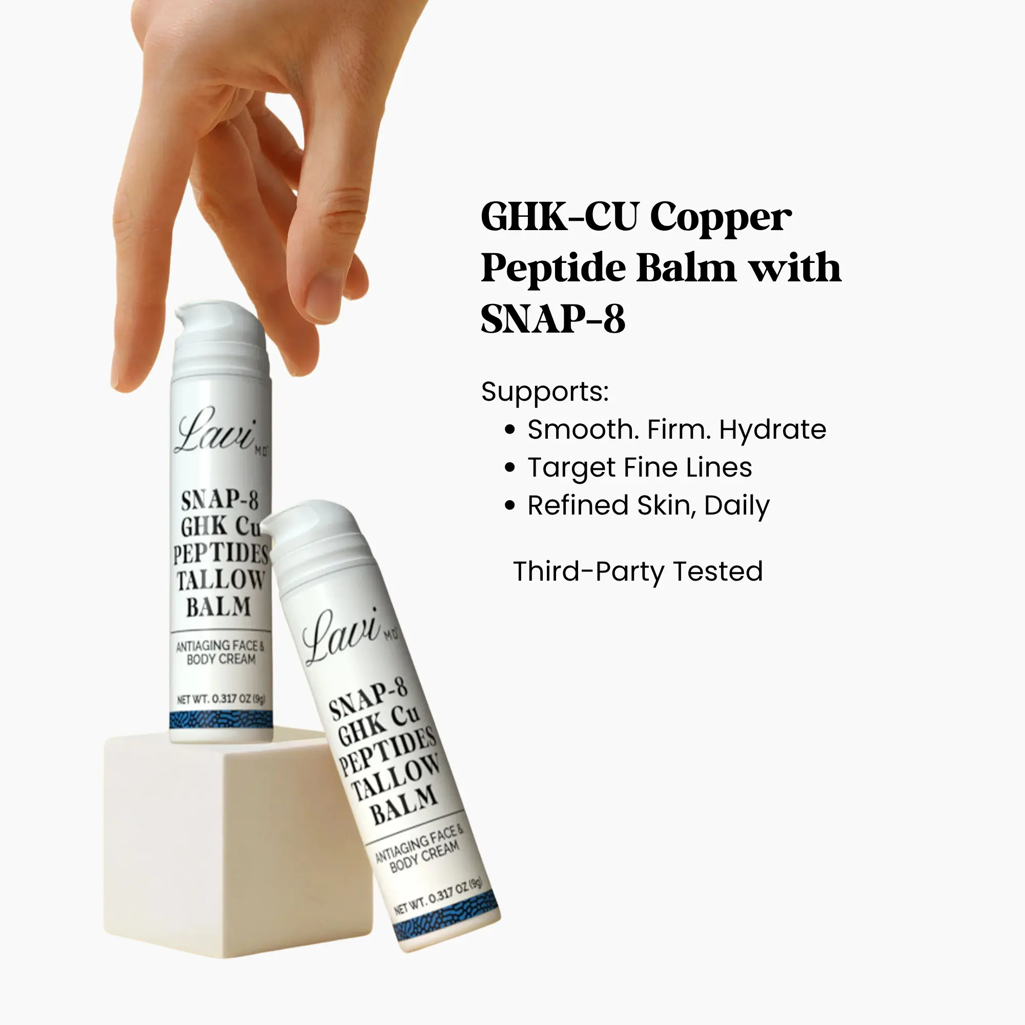 Support smoother, more refreshed-looking skin with a peptide-rich balm designed for hydration, softness, and visible skin refinement. GHK-Cu Copper Peptide Balm with SNAP-8 is formulated to complement your skincare routine with targeted ingredients commonly used in premium skin-support formulas.