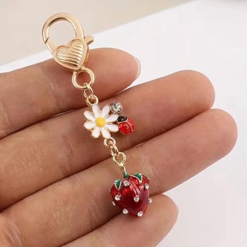 Strawberry Charm Keychain with Heart Clasp and Floral Design for Accessories