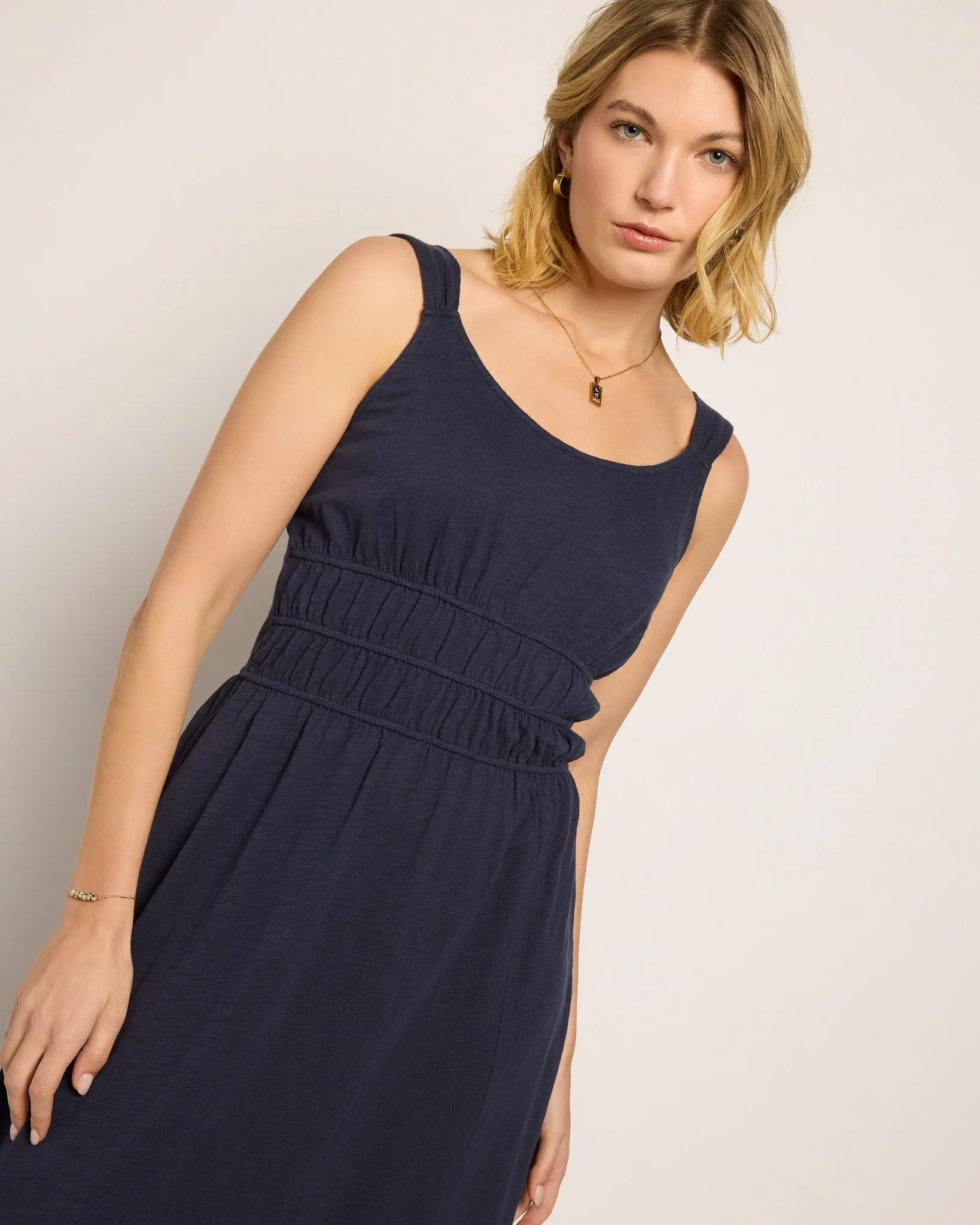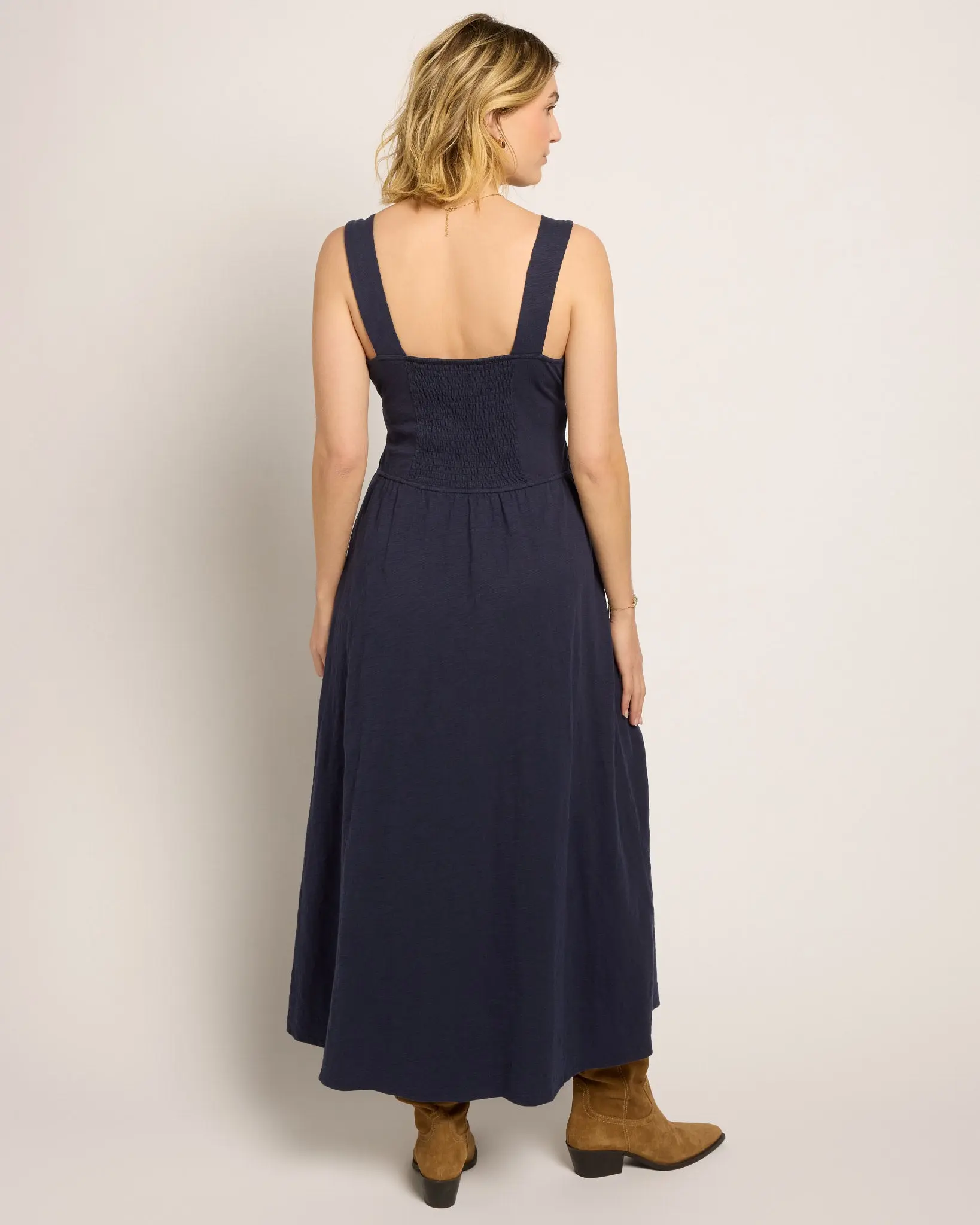 Softly flowing in breathable 100% cotton, this midi dress features a gentle scoop neckline, smocked back, and a graceful slit.