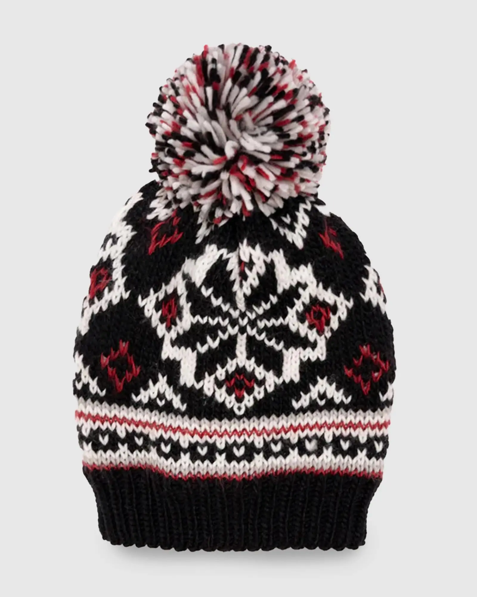 This cozy printed beanie tops off your cold-weather looks perfectly. Knit and stretchy with a yarn pom-pom and a cozy ribbed cuff. Complete with a pretty Icelandic-inspired pattern.