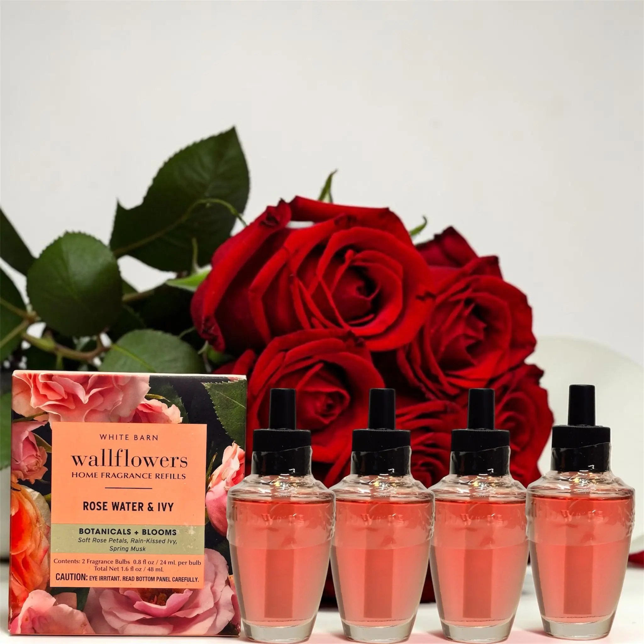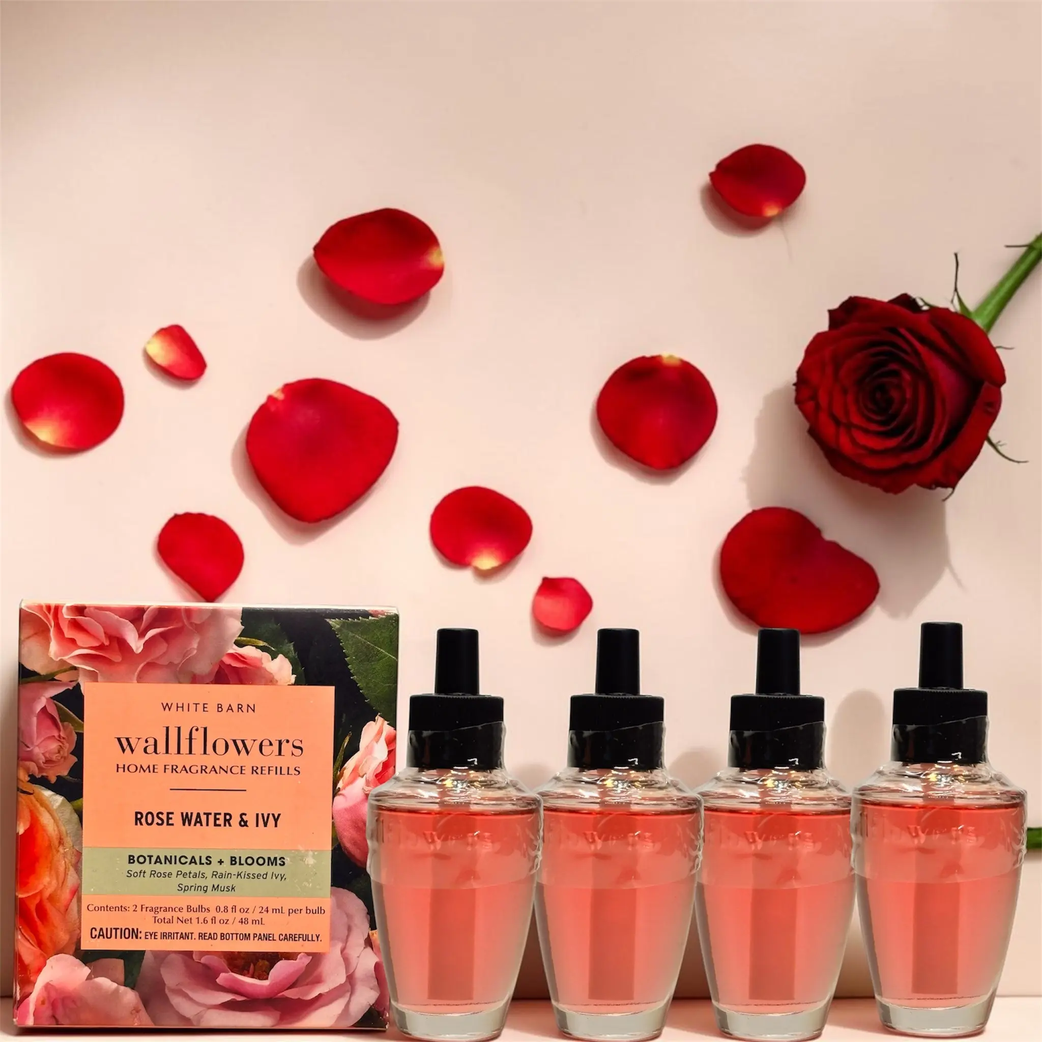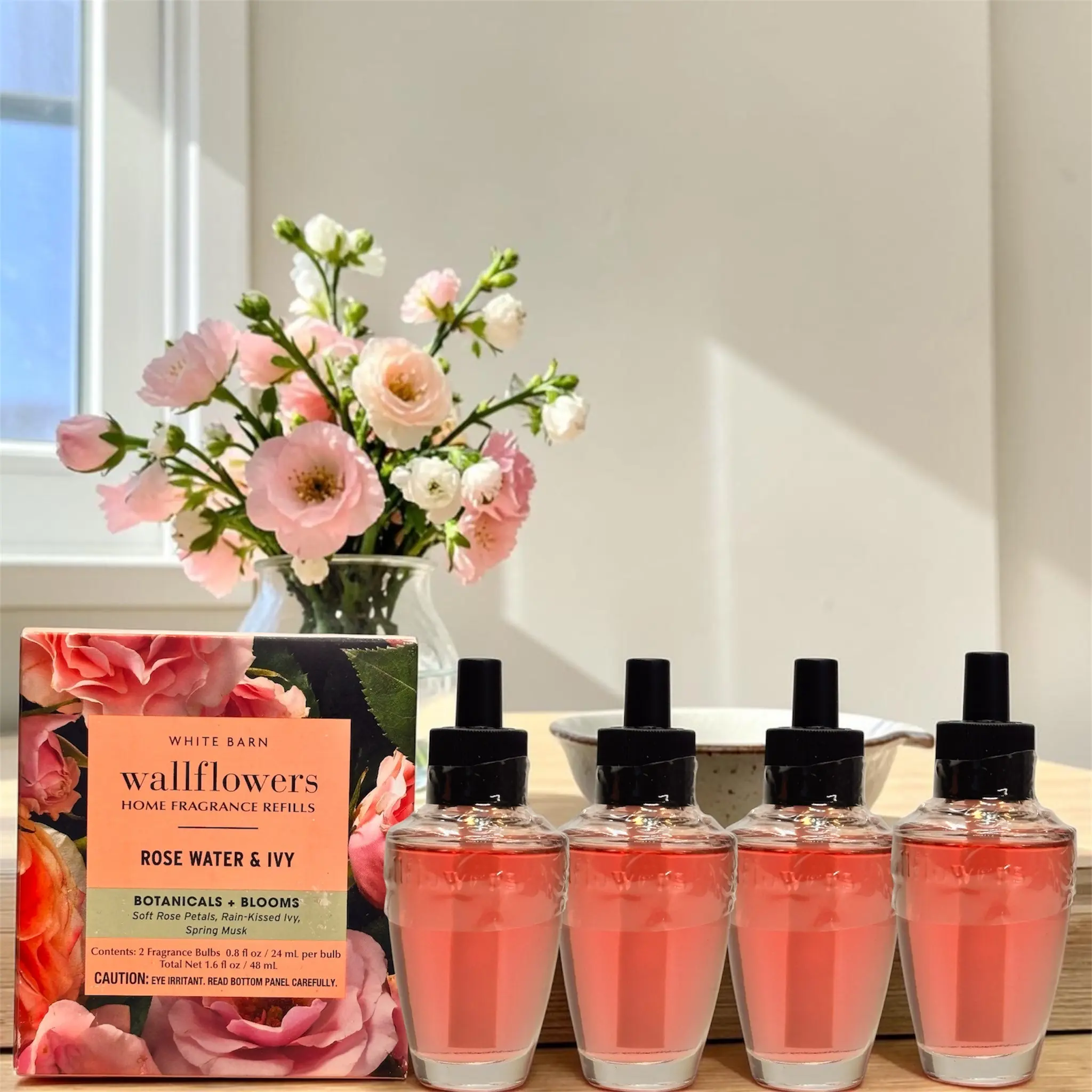 Refresh your space with the delicate blend of Rose Water & Ivy. This 4-pack of wallflower refills delivers continuous fragrance throughout your home with the signature scent from Botanicals & Blooms. Each refill fits standard wallflower plug diffusers, offering up to 30 days of subtle, long-lasting aroma per unit. Perfect for bedrooms, bathrooms, living rooms, or any room needing a gentle floral touch. Simply insert into your existing wallflower plug and enjoy effortless home fragrance.