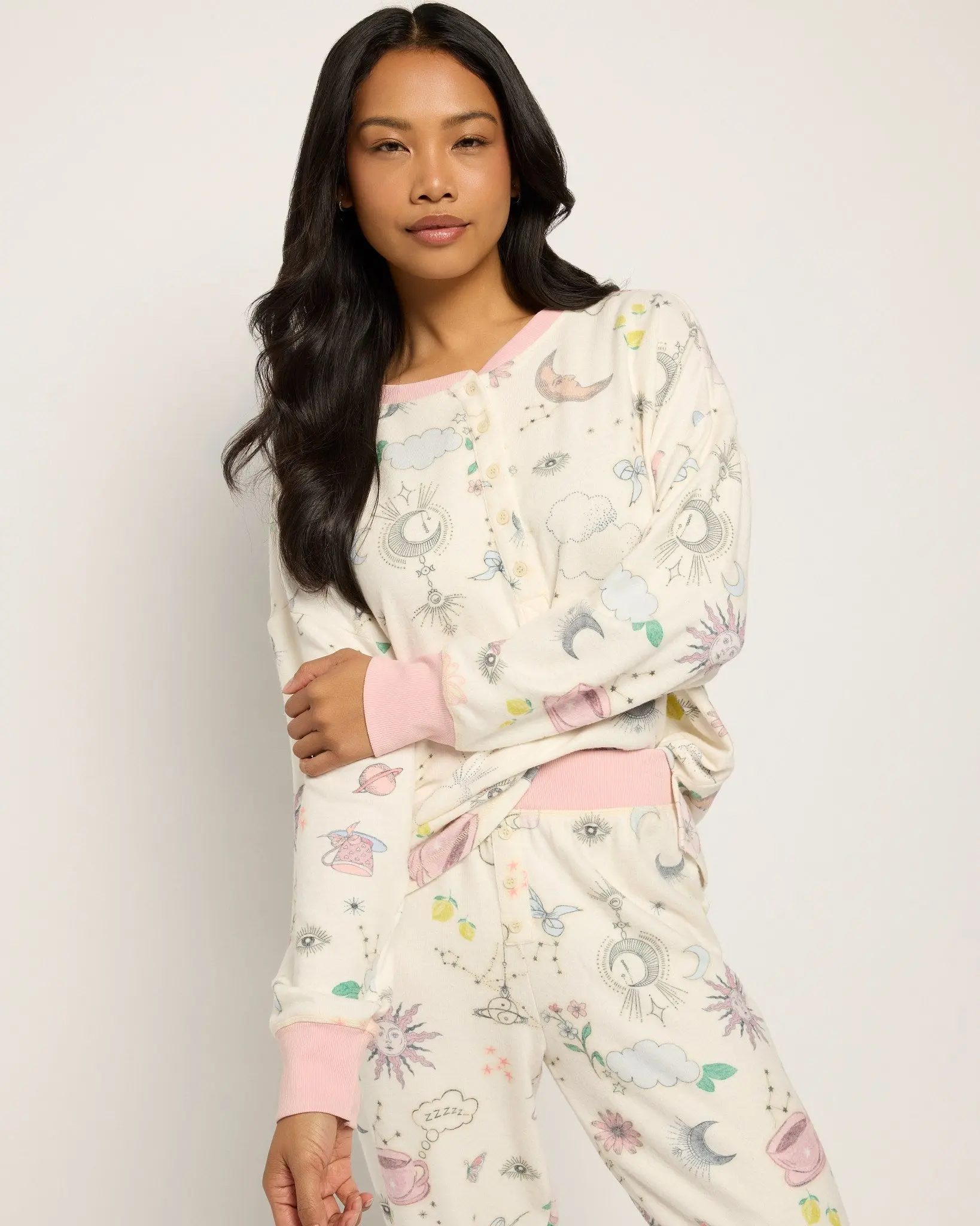 Somewhere between a daydream and the stars. This featherlight PJ set is sprinkled with moons, clouds, and cosmic cuteness. Perfect for slow mornings, sweet nights, and everything in between.
