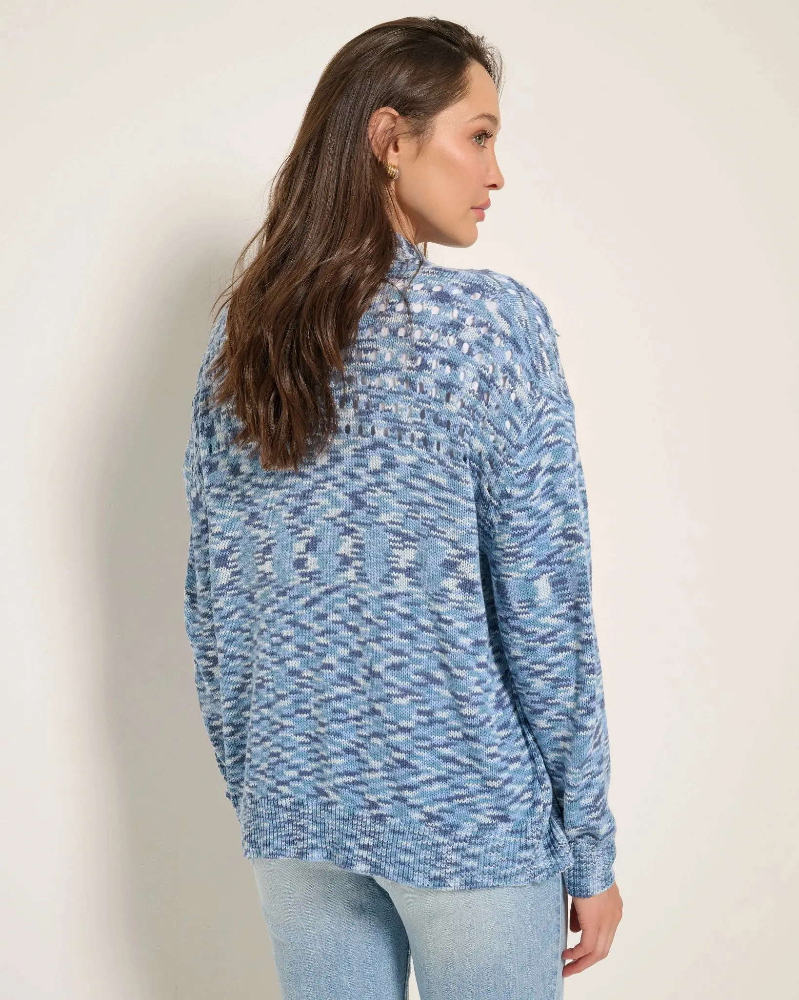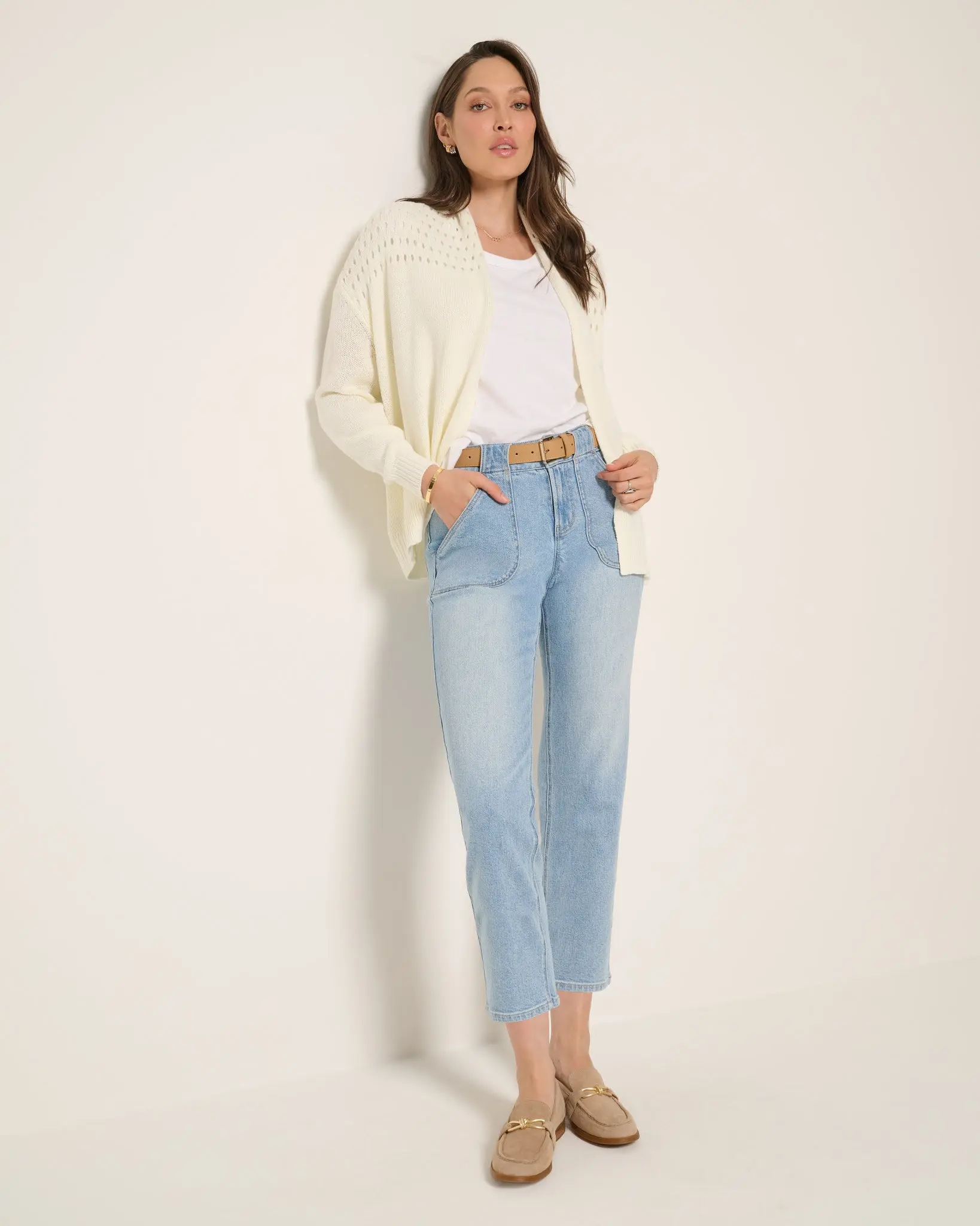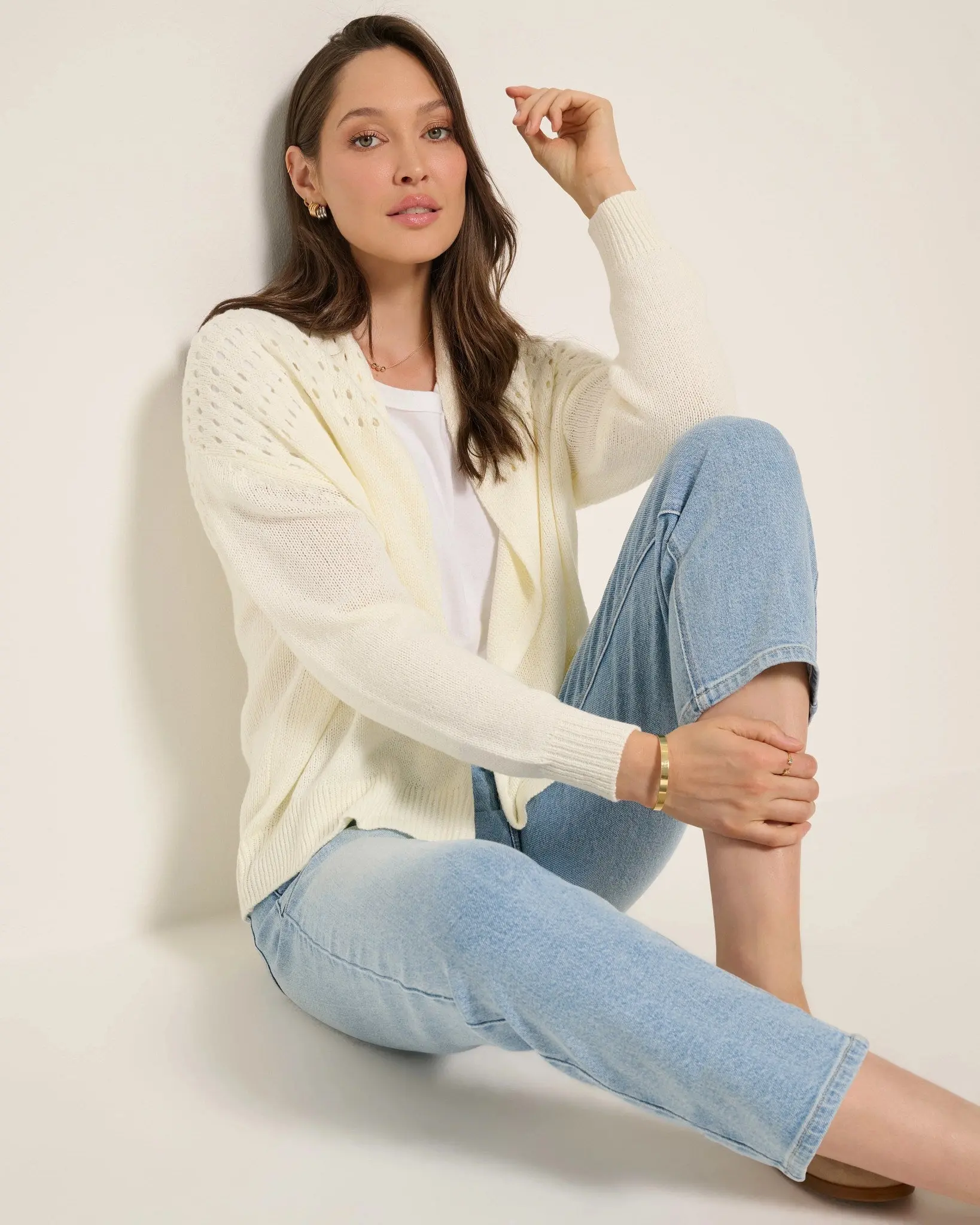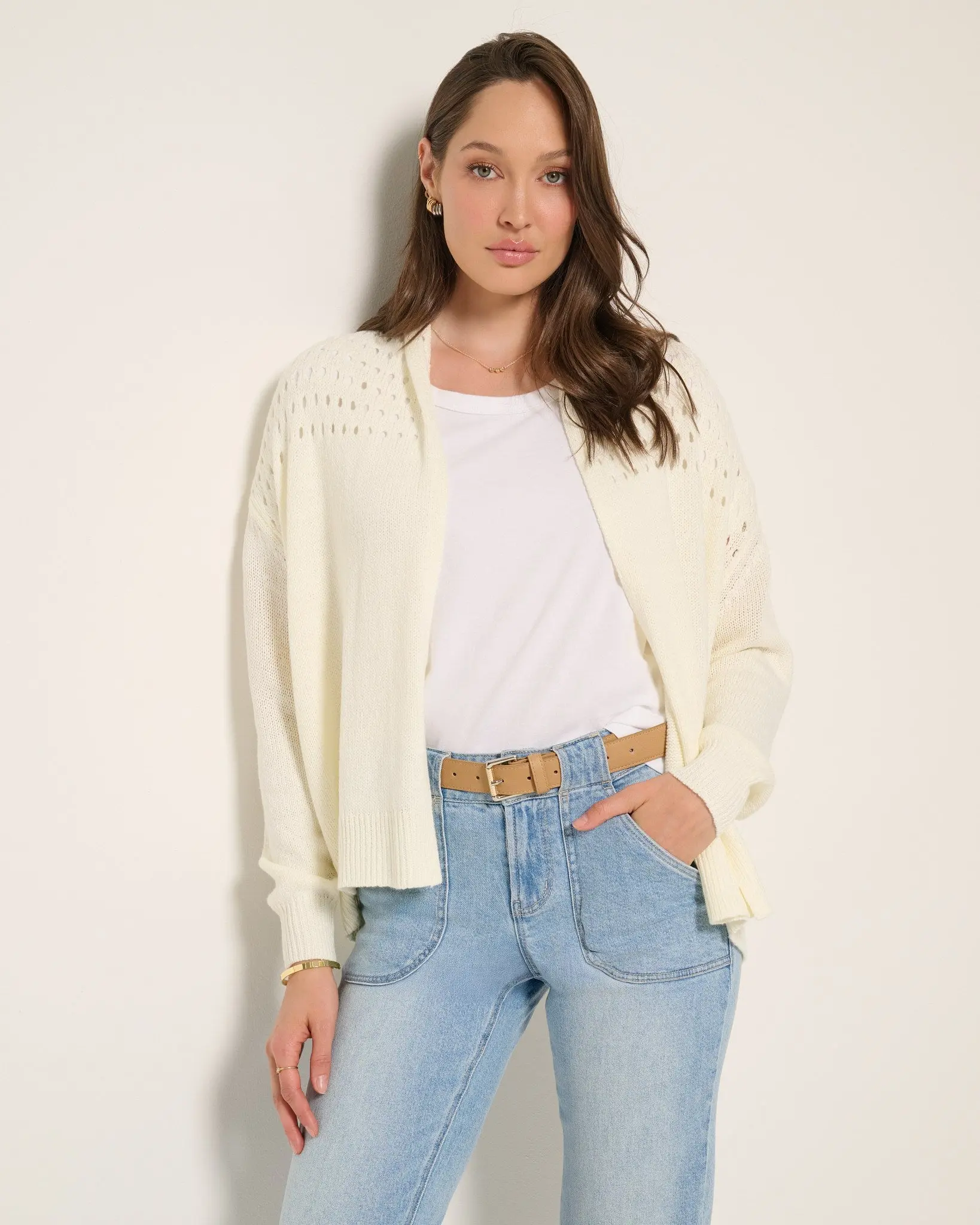 A little drama, a lot of charm. This pointelle cardigan brings soft texture, a dreamy drape, and just enough statement to turn heads. Ribbed details and a flattering shawl collar keep it grounded. Dreamy, delicate, and ready for wherever the day leads.