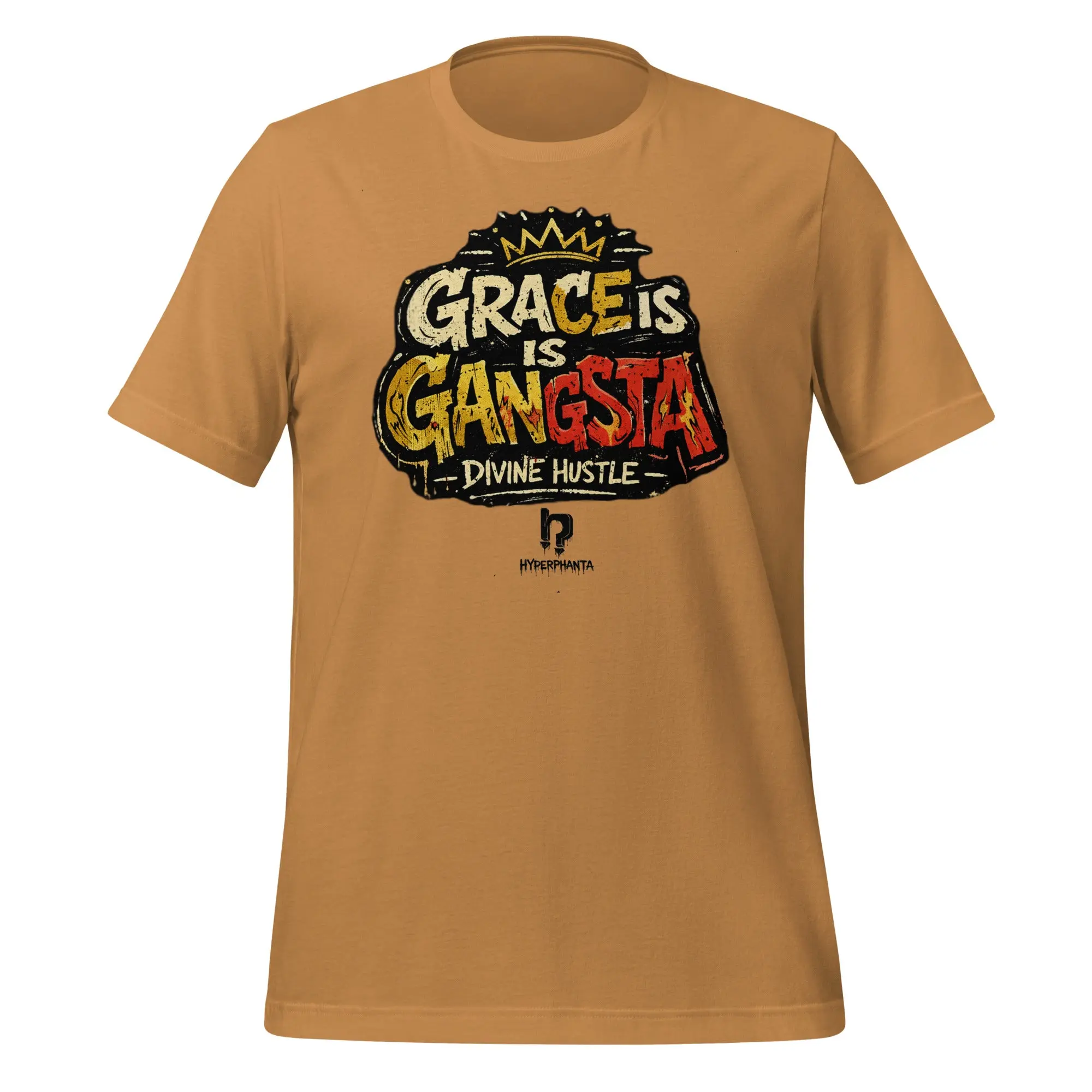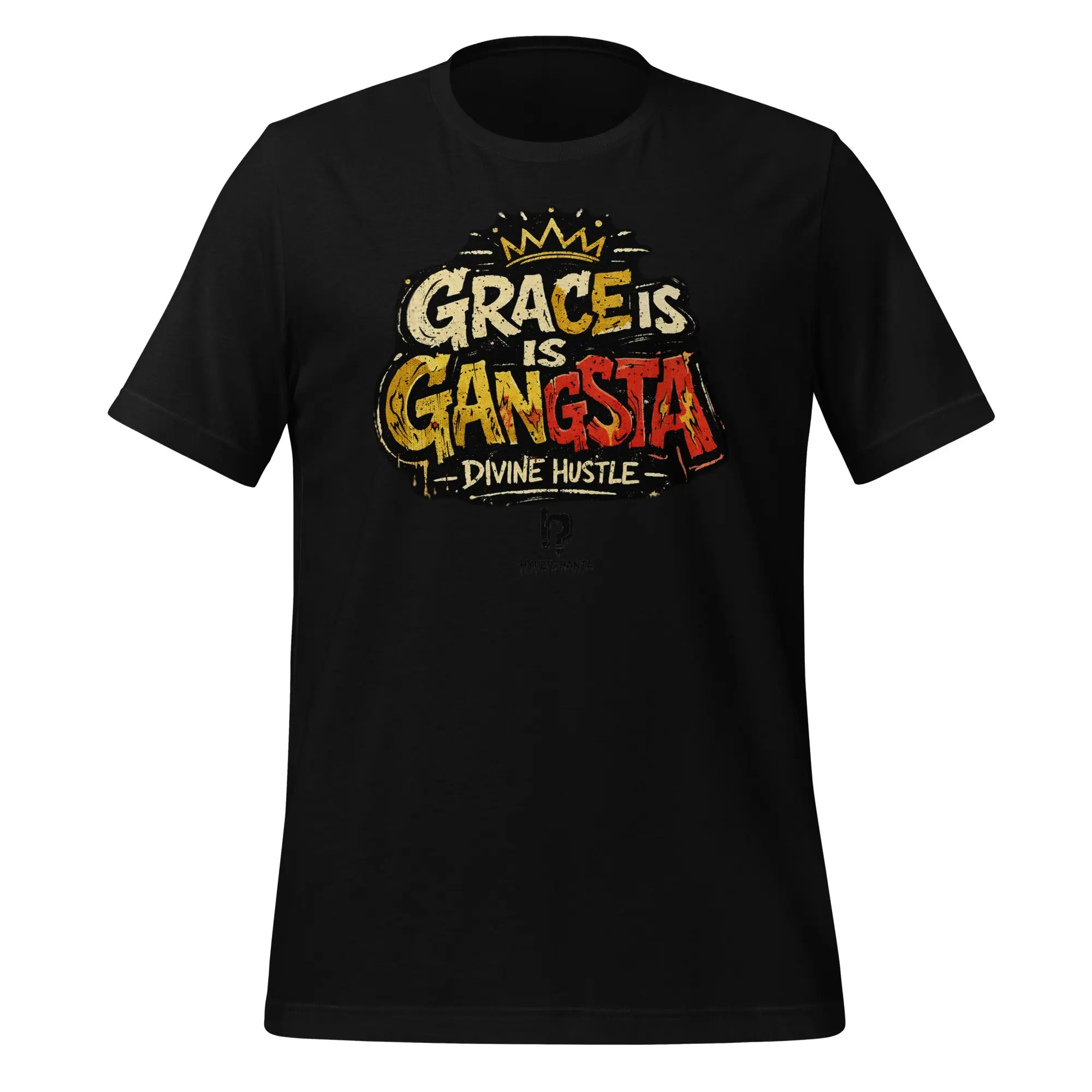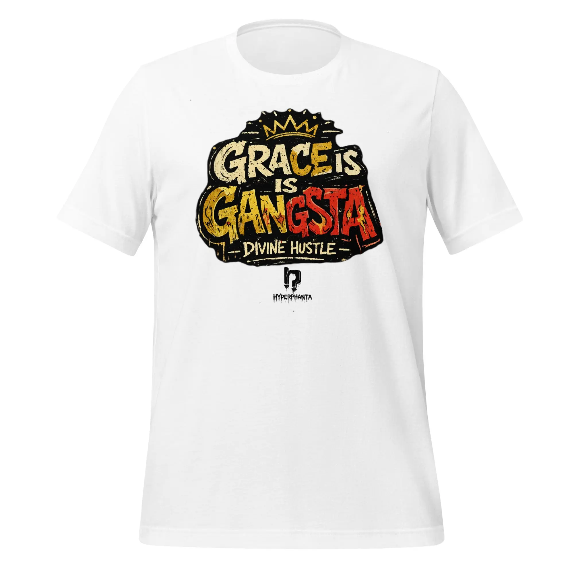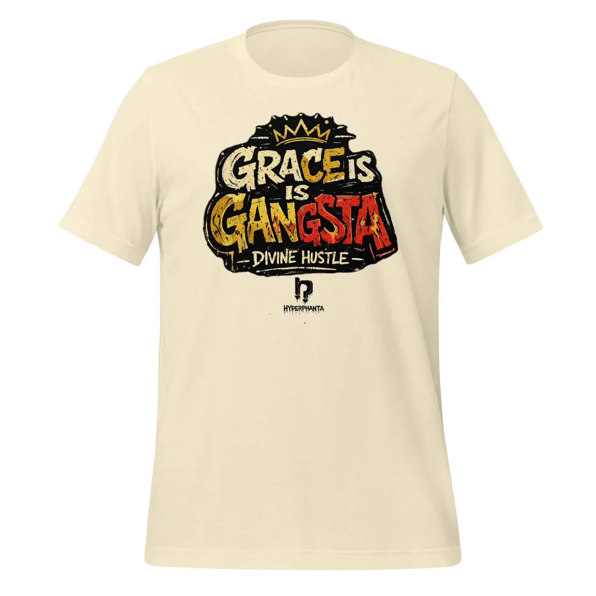 Remain unmoved. The Grace is Gangsta tee is a wearable manifesto for the modern pioneer, proving that true power lies in the ability to maintain composure when the stakes are highest. Featuring high-impact, crown-topped graffiti typography, this design embodies a core Hyperphanta principle: a soft heart and an iron will are the ultimate power couple.