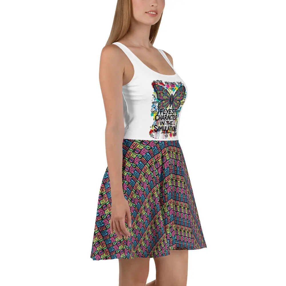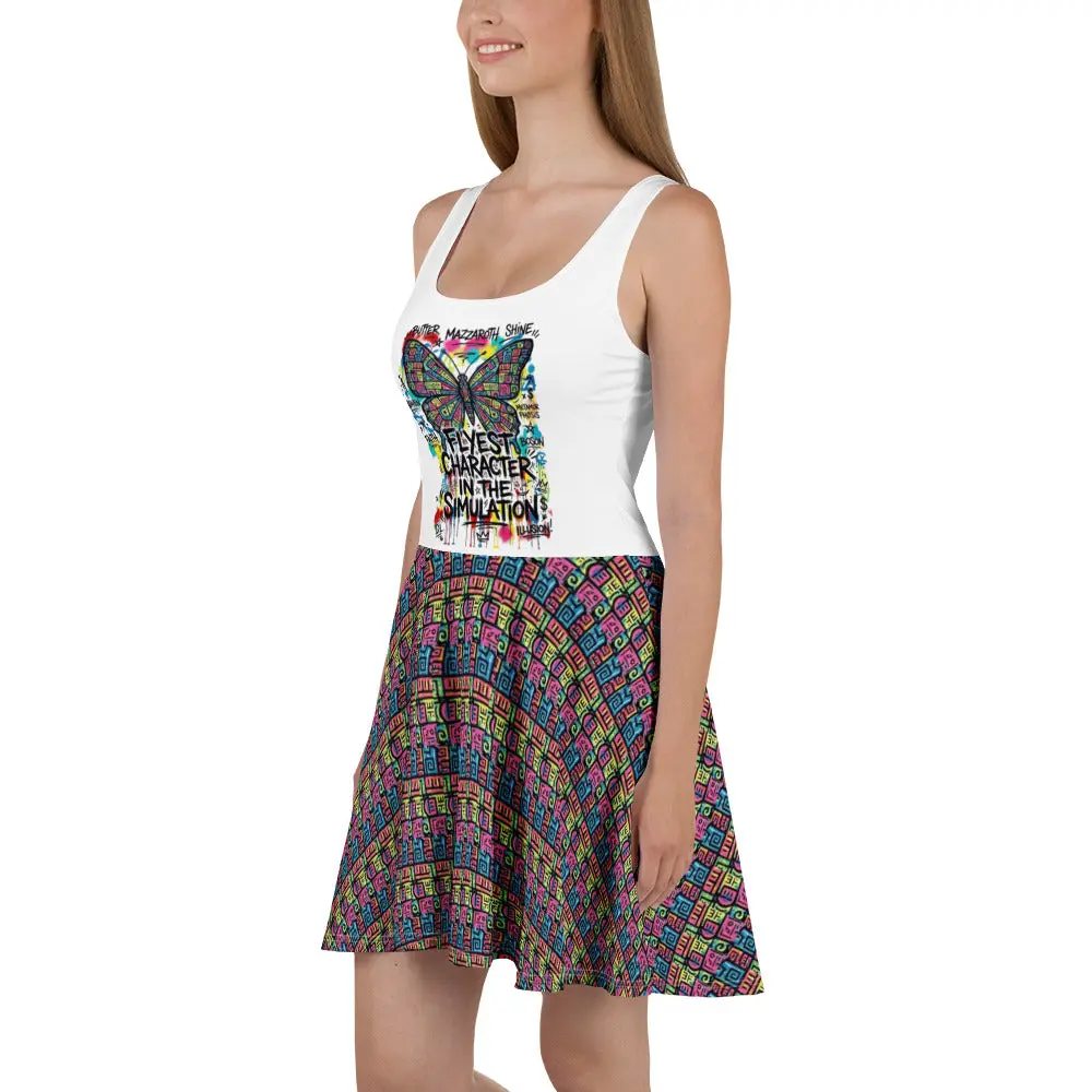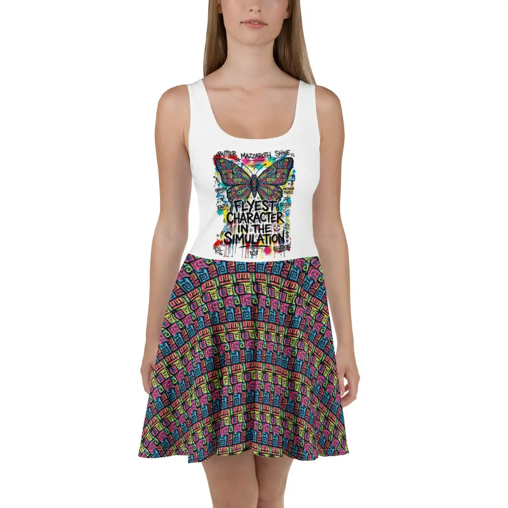 Master the Simulation. The Flyest Character Skater Dress is a high-frequency technical deployment designed for those who navigate their environment with effortless intent. Featuring a centered Simulation butterfly graphic and a dynamic, multi-colored patterned skirt, this garment is engineered for a sophisticated, body-flattering drape that transitions seamlessly between urban exploration and creative deep-dives. In the Hyperphanta mindset, your attire should facilitate your flow—wear this as your primary tactical veil for high-energy presence.