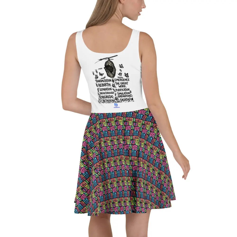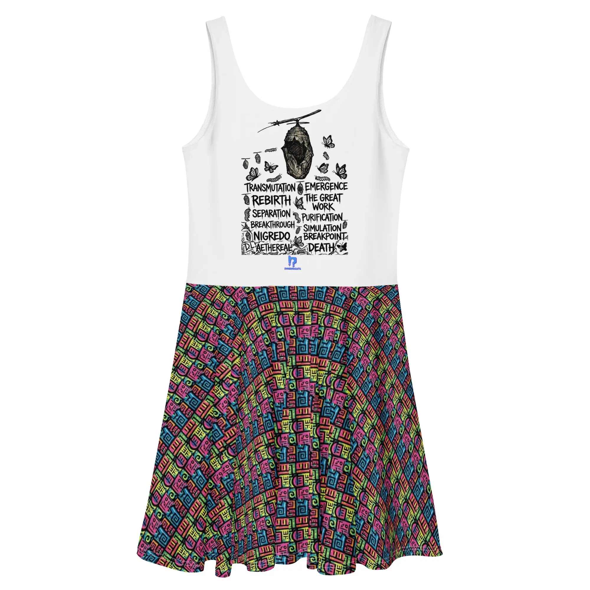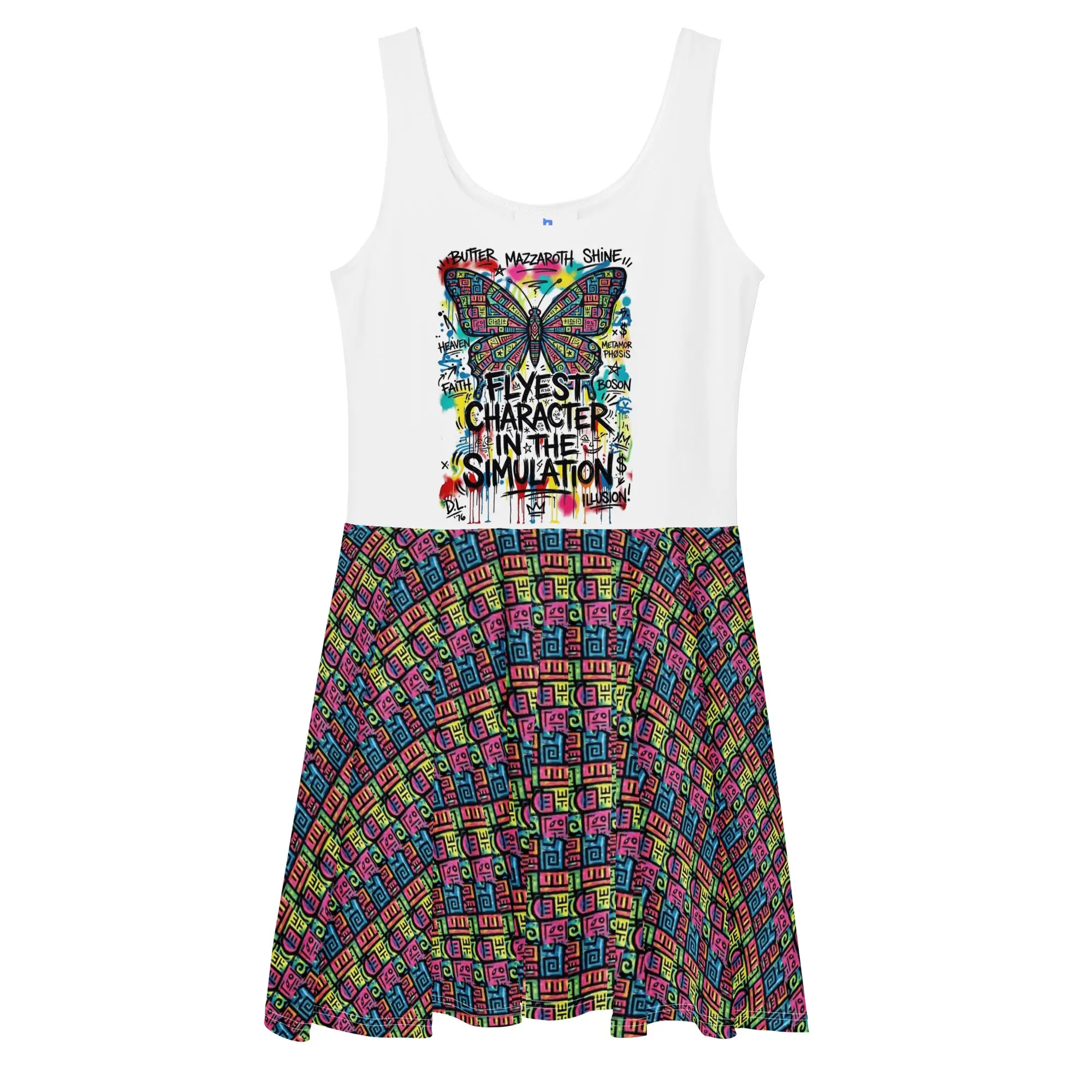 Master the Simulation. The Flyest Character Skater Dress is a high-frequency technical deployment designed for those who navigate their environment with effortless intent. Featuring a centered Simulation butterfly graphic and a dynamic, multi-colored patterned skirt, this garment is engineered for a sophisticated, body-flattering drape that transitions seamlessly between urban exploration and creative deep-dives. In the Hyperphanta mindset, your attire should facilitate your flow—wear this as your primary tactical veil for high-energy presence.