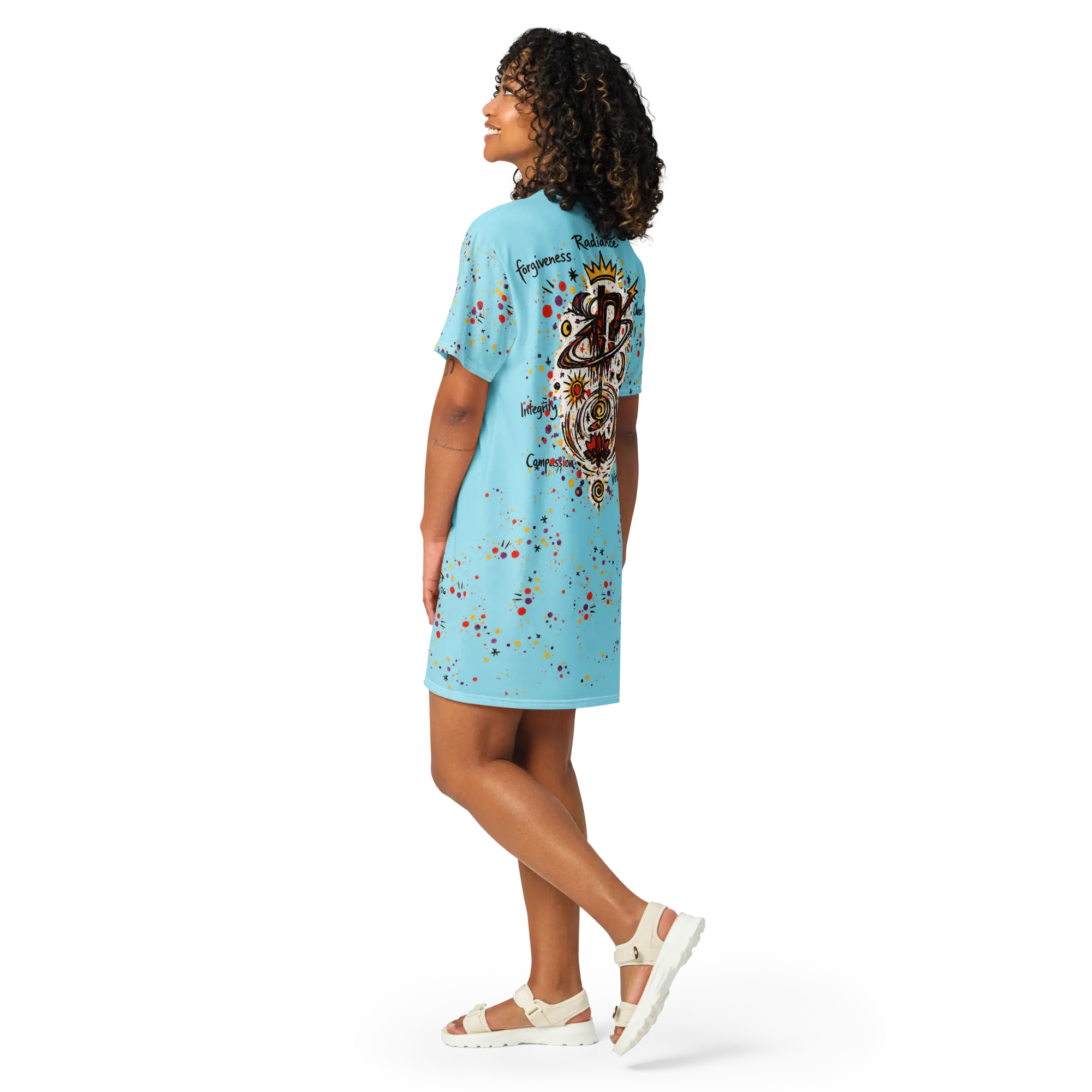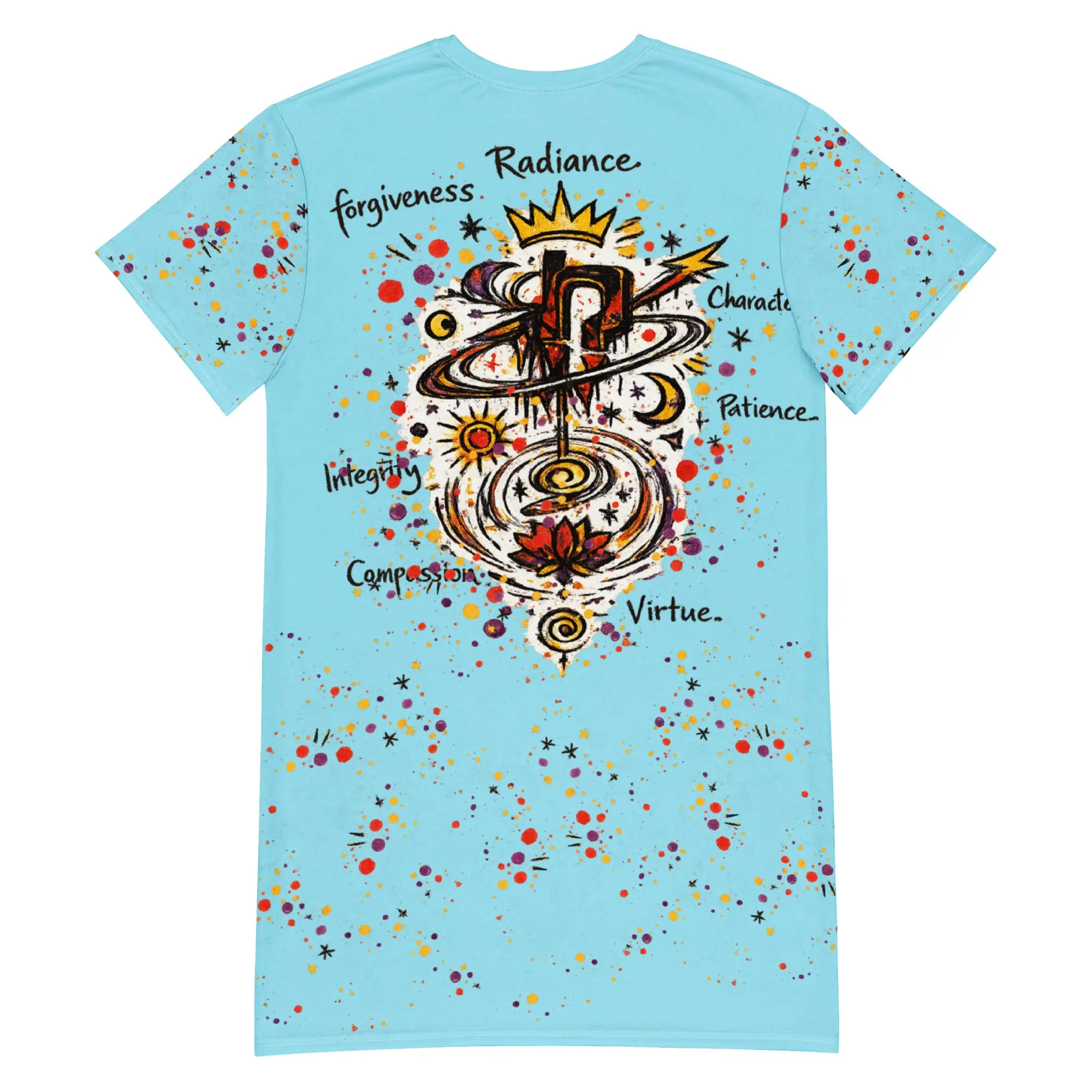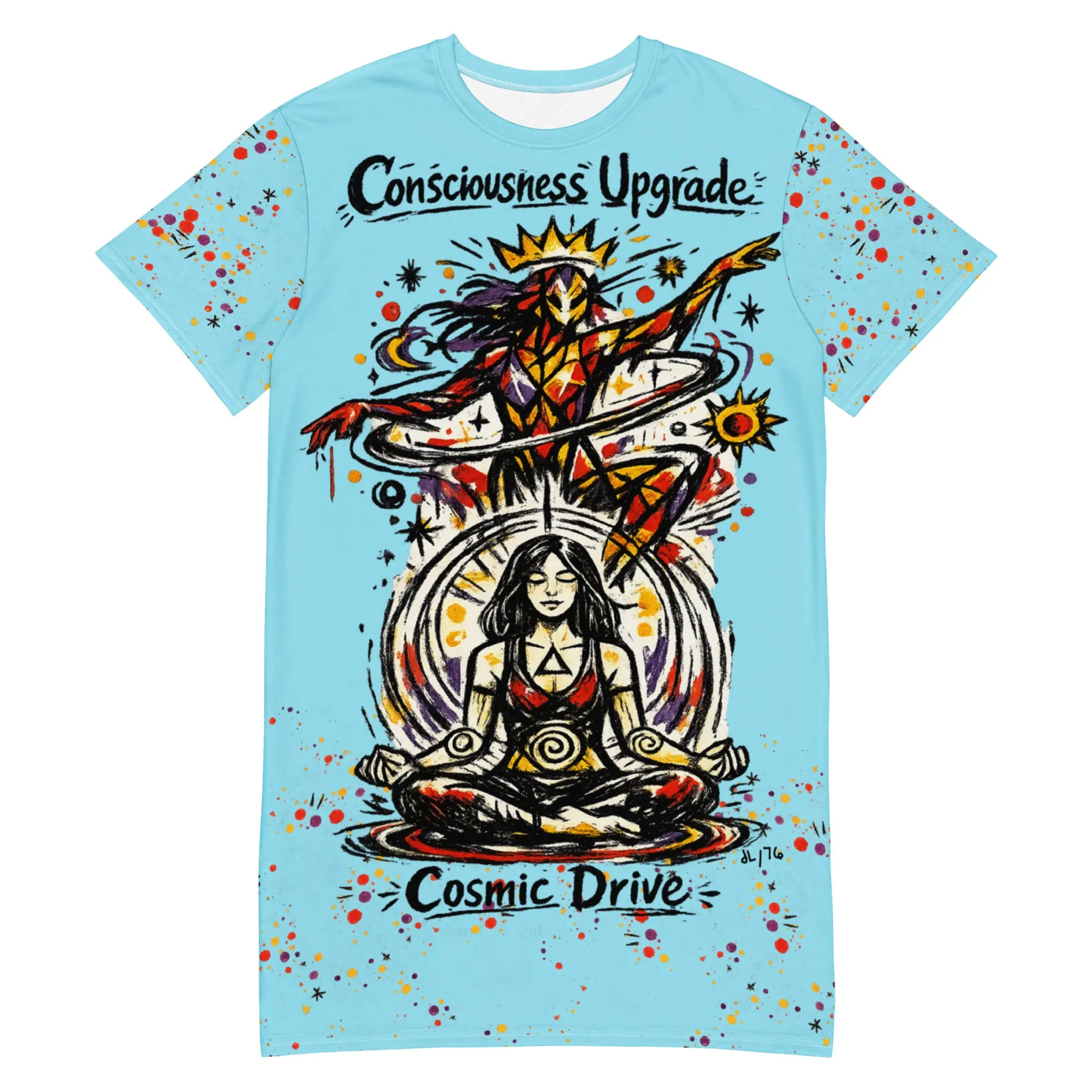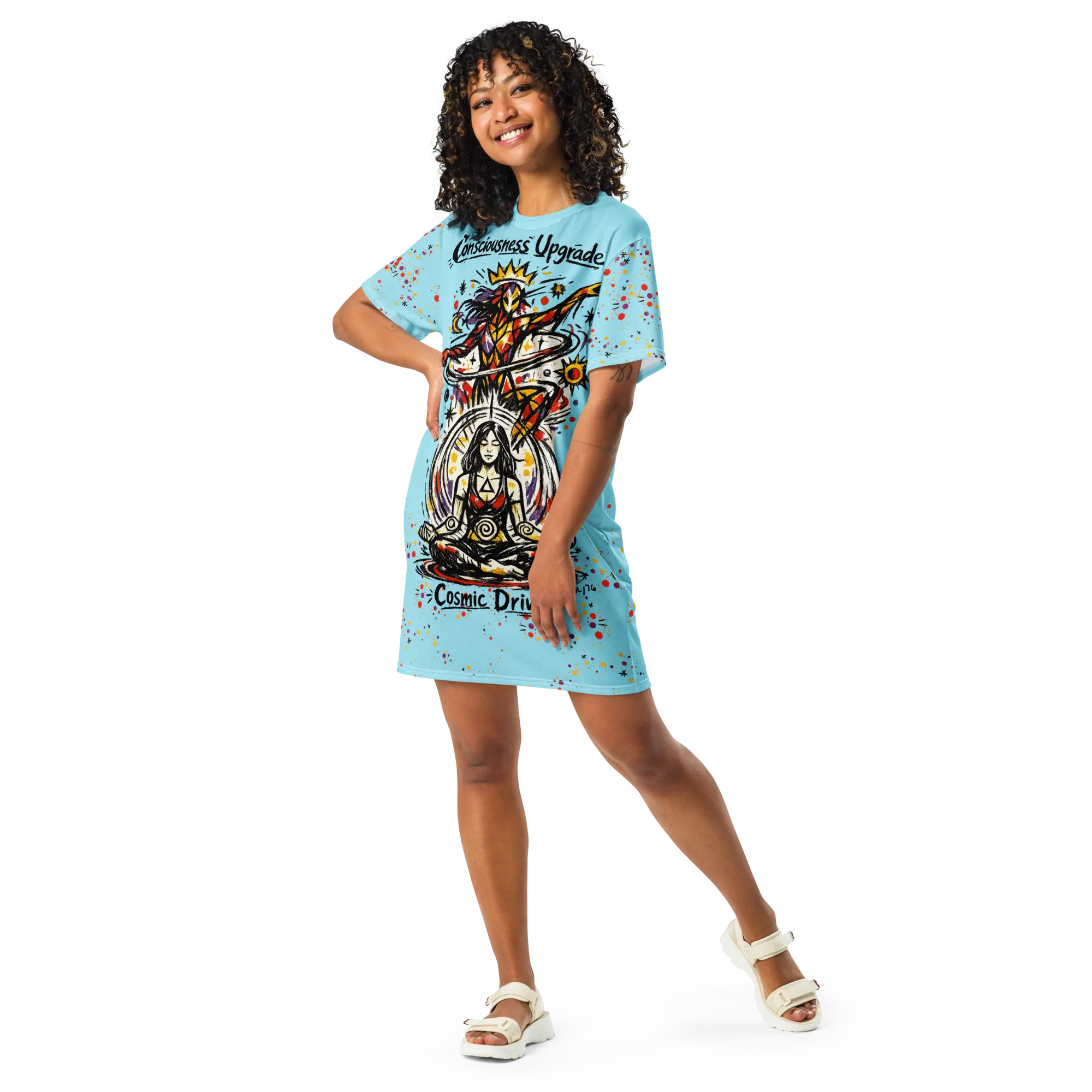 Master the Oversize. The Genesis T-shirt dress is a versatile technical deployment designed for those who navigate their environment with effortless intent. Featuring an expansive, high-energy graphic and a soft Aura blue base, this garment is engineered for a relaxed, body-flattering drape that doesn't compromise on presence. In the Hyperphanta mindset, your attire should facilitate your flow—wear it as your primary tactical veil for urban exploration or creative deep-dives.