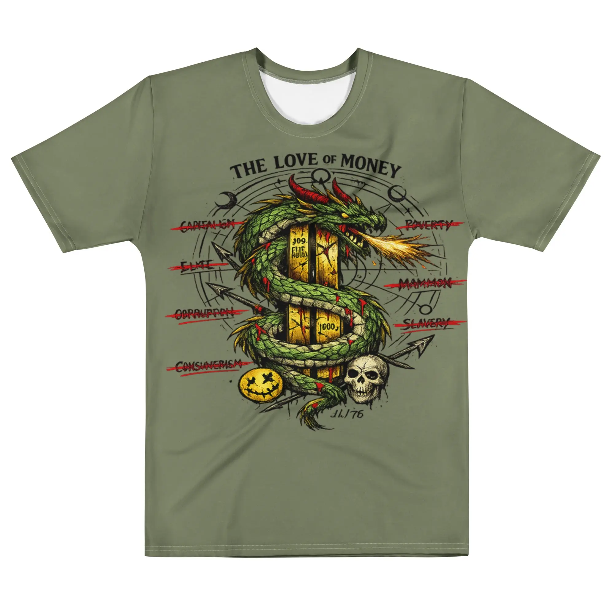 Navigate the simulation with your eyes wide open. The Love of Money staple tee is a visual breakdown of one of the oldest proverbs in existence. Featuring a gold-crowned serpent coiled around the dollar sign—surrounded by daggers, skulls, and chaotic street-art icons—this design isn't just a shirt; it’s an artifact of wisdom. It serves as a sharp reminder that while we play the game, we never let the game play us.