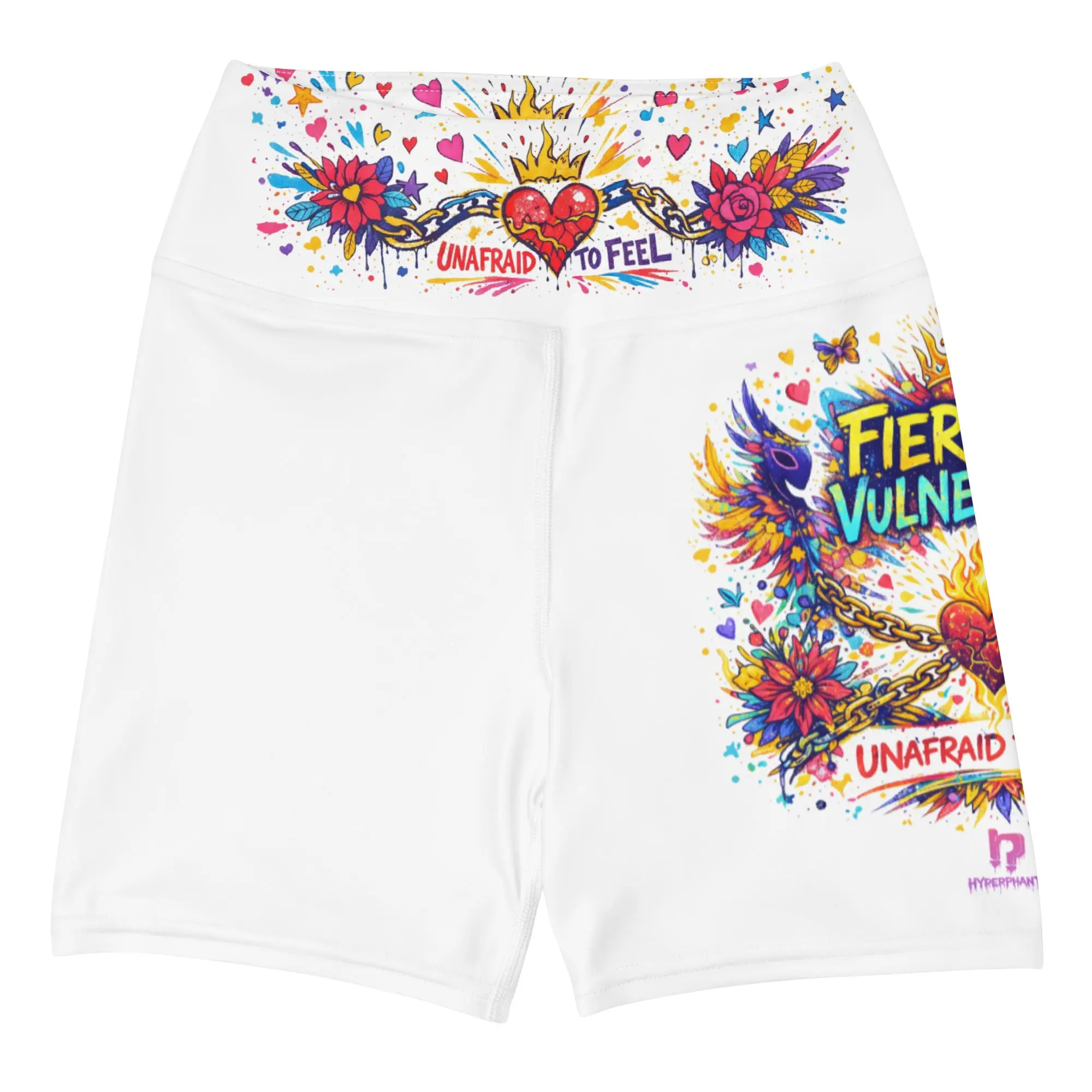 Strength in transparency. The Fiercely Vulnerable shorts are a technical essential designed for those who navigate the world with an open heart and an iron will. Featuring the vibrant "Aura" heart motifs and soft pink tones of the Vanguard palette, these shorts provide a locked-in fit that moves with your frequency. In the Hyperphanta mindset, vulnerability is the ultimate catalyst for growth—wear it like armor.