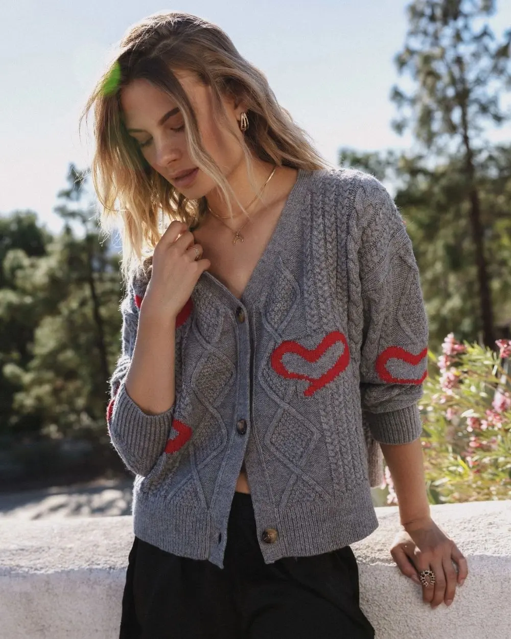Sweetly unexpected. This button-up cardigan is soft, slouchy, and a little sentimental. Classic cable knit, heart print, and just the right amount of charm. Wear it buttoned up or layered loose for that perfectly effortless look.