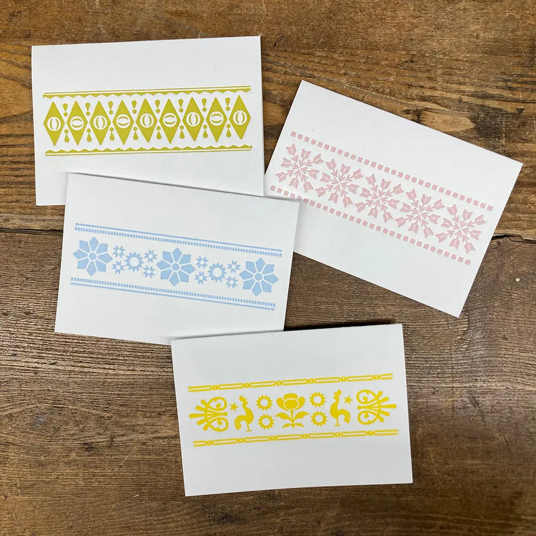 The box includes 8 cards (2 of each pattern) and 8 light gray envelopes.