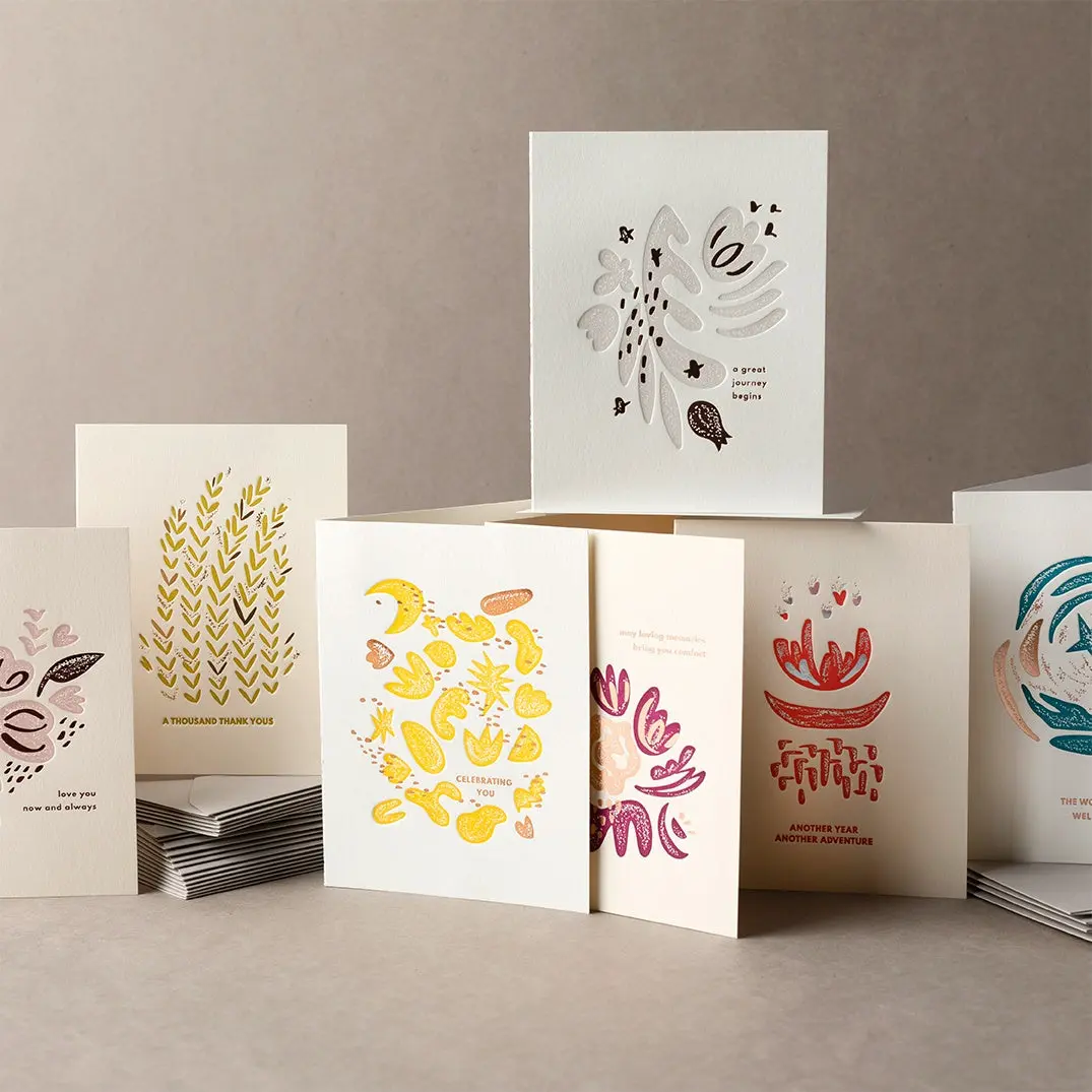 From our Kindred Spirit collection, share your support for a new addition with this rose gold foil and teal ink letterpress printed card. This card announces: "The World Warmly Welcomes You."