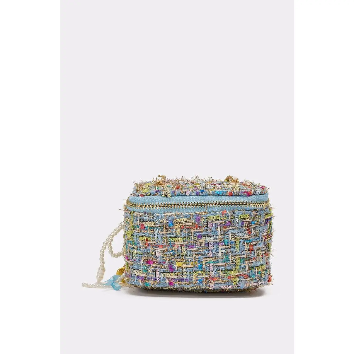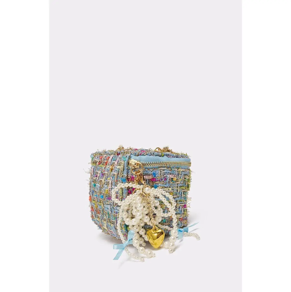 Statement-making pastel tweed mini crossbody bag with pearl charm detail, perfect for brunch dates, weddings, or an elevated day-to-night look. Featuring a chic boxy silhouette with multicolor woven tweed fabric, gold-tone chain strap, and a dainty pearl tassel accent on the zipper, this luxe purse adds soft texture and feminine flair to every outfit. The compact size keeps it sleek and easy to carry while the chain strap gives it a polished finish, finished with a secure zip closure and inner satin lining. Pair with a mini dress or blazer set for a cute, classy moment.- 65% Polyester 20% Metal 15% Plastic - Imported(all measurements are approximate from size O/S)- 5.5” Length X 4” Height X 3” Width- 42” Top Strap LengthProduct ID: 1085466