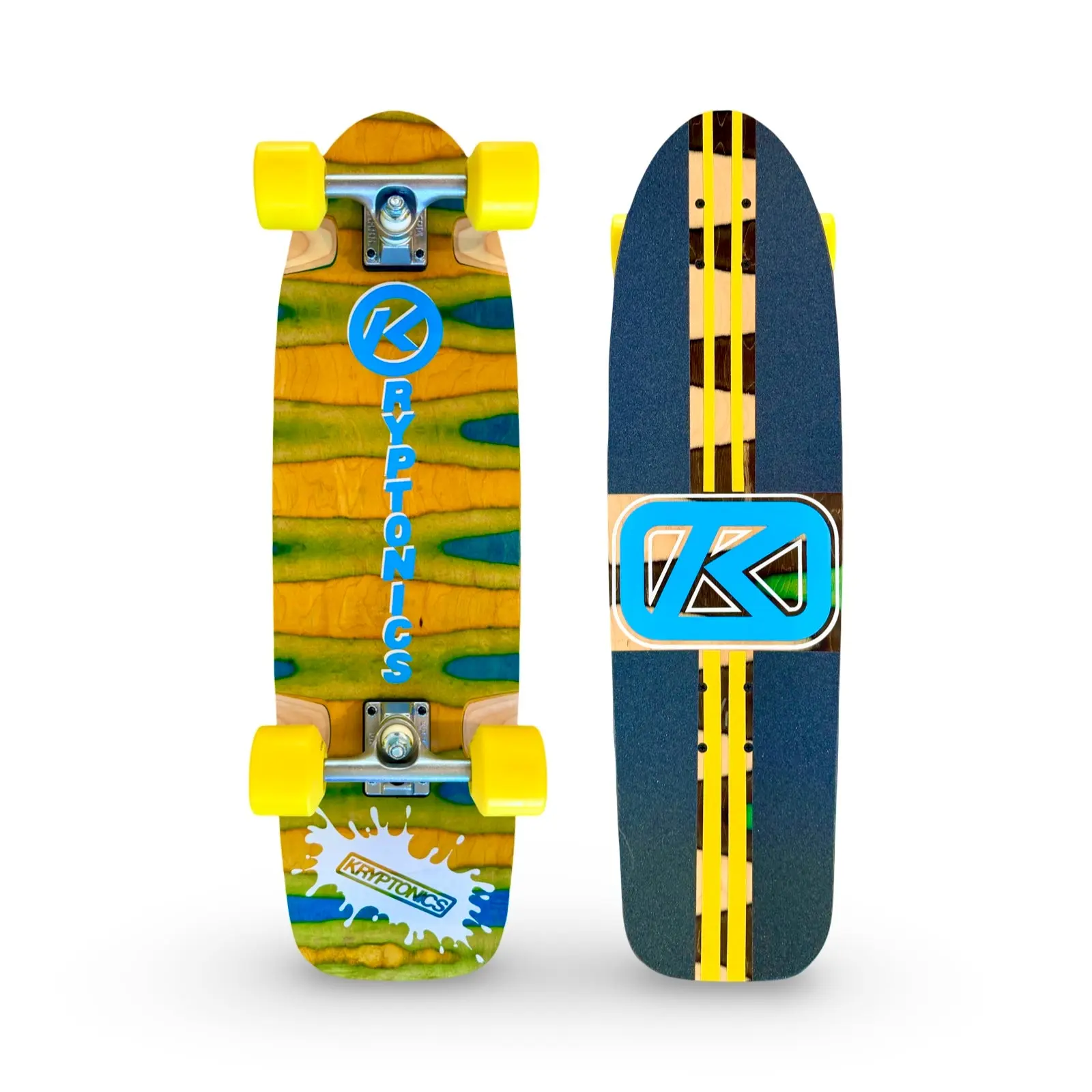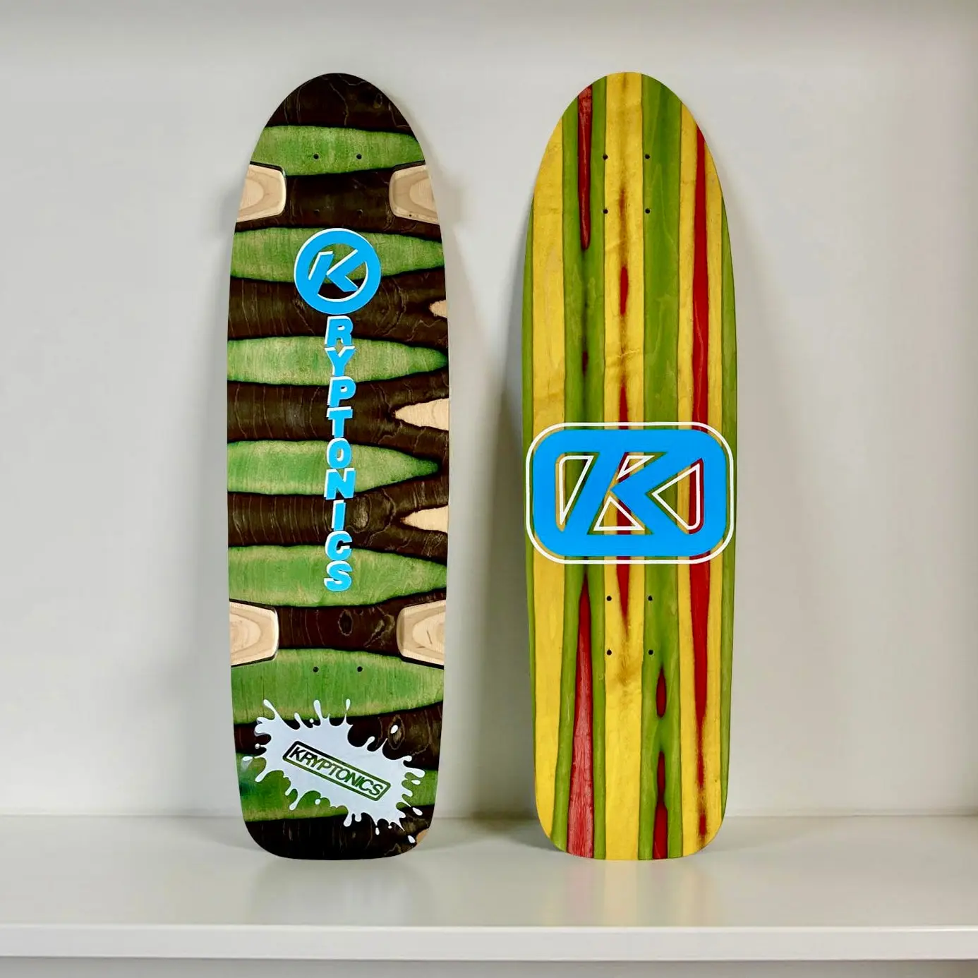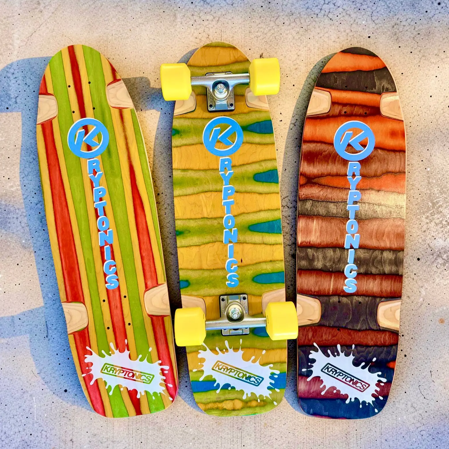 Kryptonics Cruiser Deck or COMPLETE with SIMS SNAKE WHEELS - a perfect reproduction of our 1978 original “Endless Summer” cruiser shape, with beautiful square “Willie” wheel wells, and our amazing “spectrum” woodwork top and bottom. Each are ONE OF A KIND Cruisers of your DREAMS!